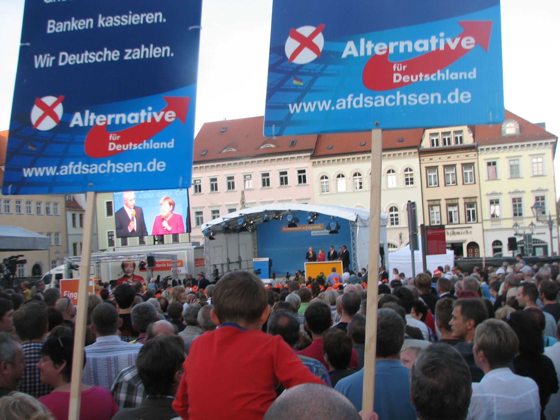 Gestern, am 22.08., war Frau Merkel auf Wahlkampftour in Oschatz . Es waren ab 19.00 Uhr ungefähr 5000 Besucher vor Ort. Alle Leute standen sehr dicht gedrängt, so dass man Mühe hatte, immer die Plakate hochzuheben, Absetzen war fast unmöglich.