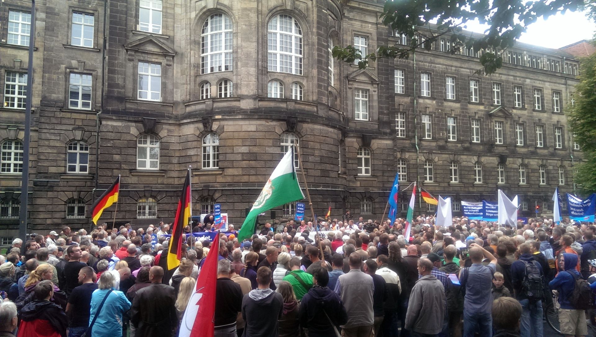 Ca. 2.000 Teilnehmer waren dem Aufruf gefolgt und fanden sich zum Treffpunkt am Goldenen Reiter ein, um diese Forderung zu unterstützen. Auch aus angrenzenden Bundesländern waren Unterstützer angereist, so aus Thüringen und aus Bayern. Im Demonstrationszug wurde sogar eine ukrainische Flagge gesichtet. Ebenfalls eingefunden hatten sich ca. 100 Anhänger der Antifa, die dem Verlauf der Demonstration folgten und die Kundgebung lautstark durch Pfiffe und unqualifizierte Zwischenrufe störten.