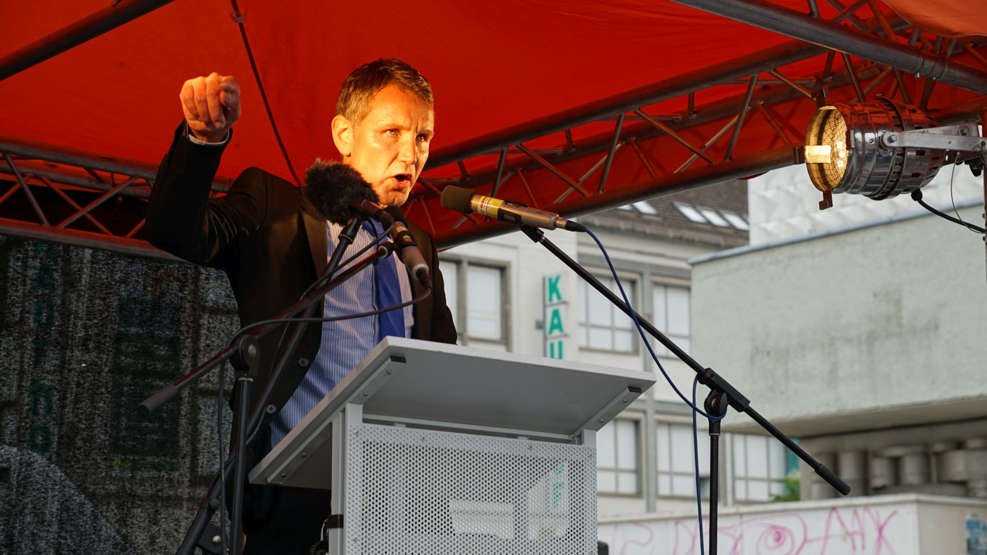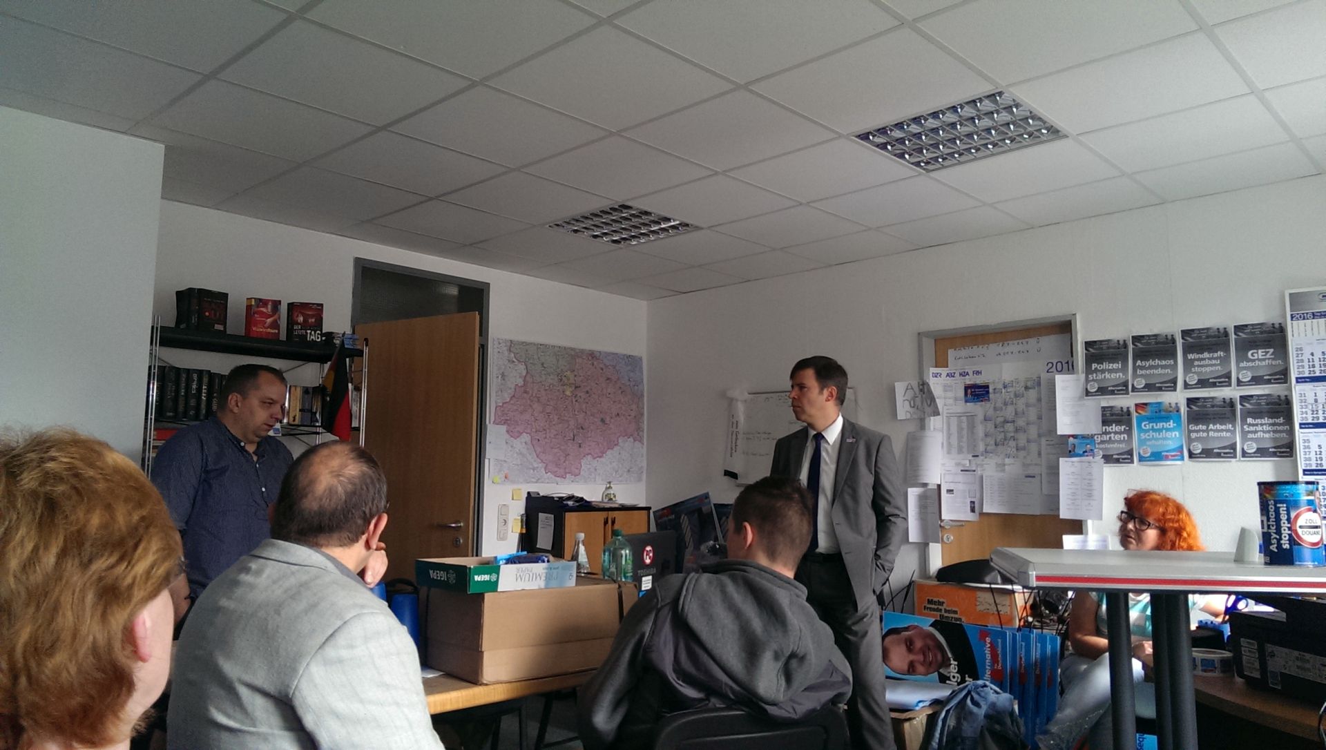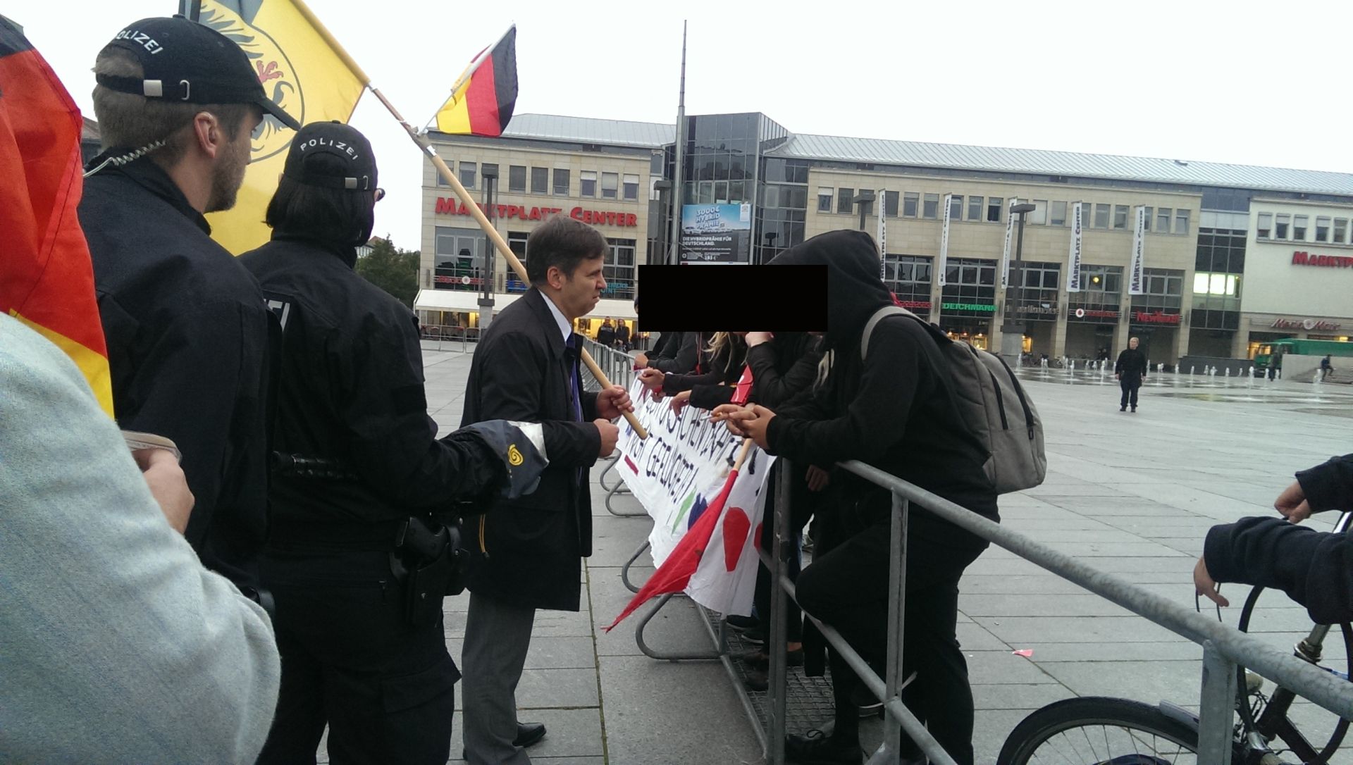 Im Anschluss an die Kundgebung kam es zu einer interessanten Diskussion zwischen am Absperrgitter stehenden Jugendlichen aus dem linken Spektrum und dem Thüringer Abgeordneten Olaf Kießling, der gemeinsam mit den Thüringer Wahlhelfern angereist war. Herr Kießling vermittelte dabei, dass die Alternative für Deutschland beim Thema Asyl gegen die Fluchtursachen ankämpft und durchaus auf seiten echter und hilfsbedürftiger Flüchtlinge steht, wobei klar zwischen echten Asylsuchenden und Wirtschaftsmigranten zu unterscheiden ist.