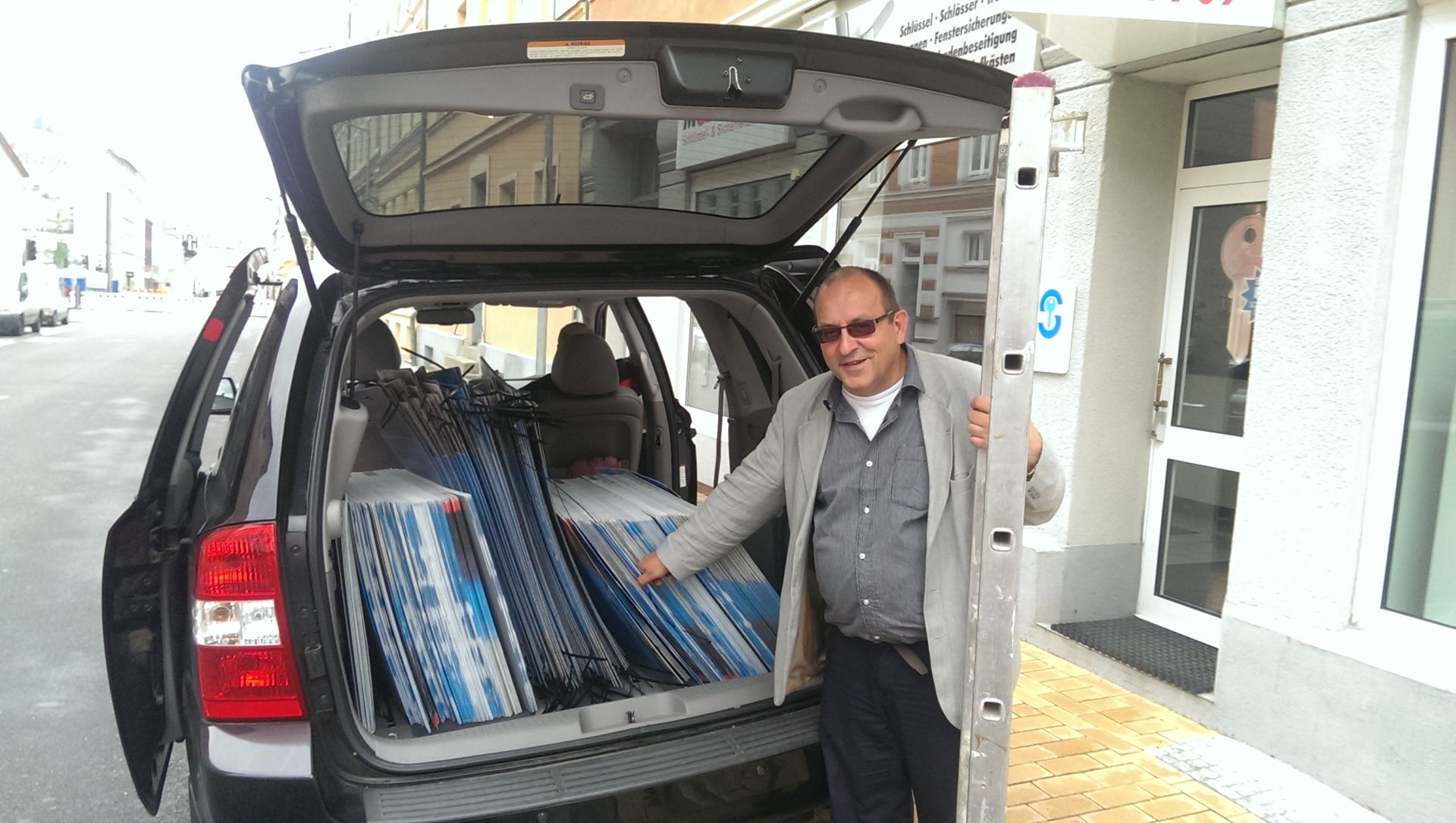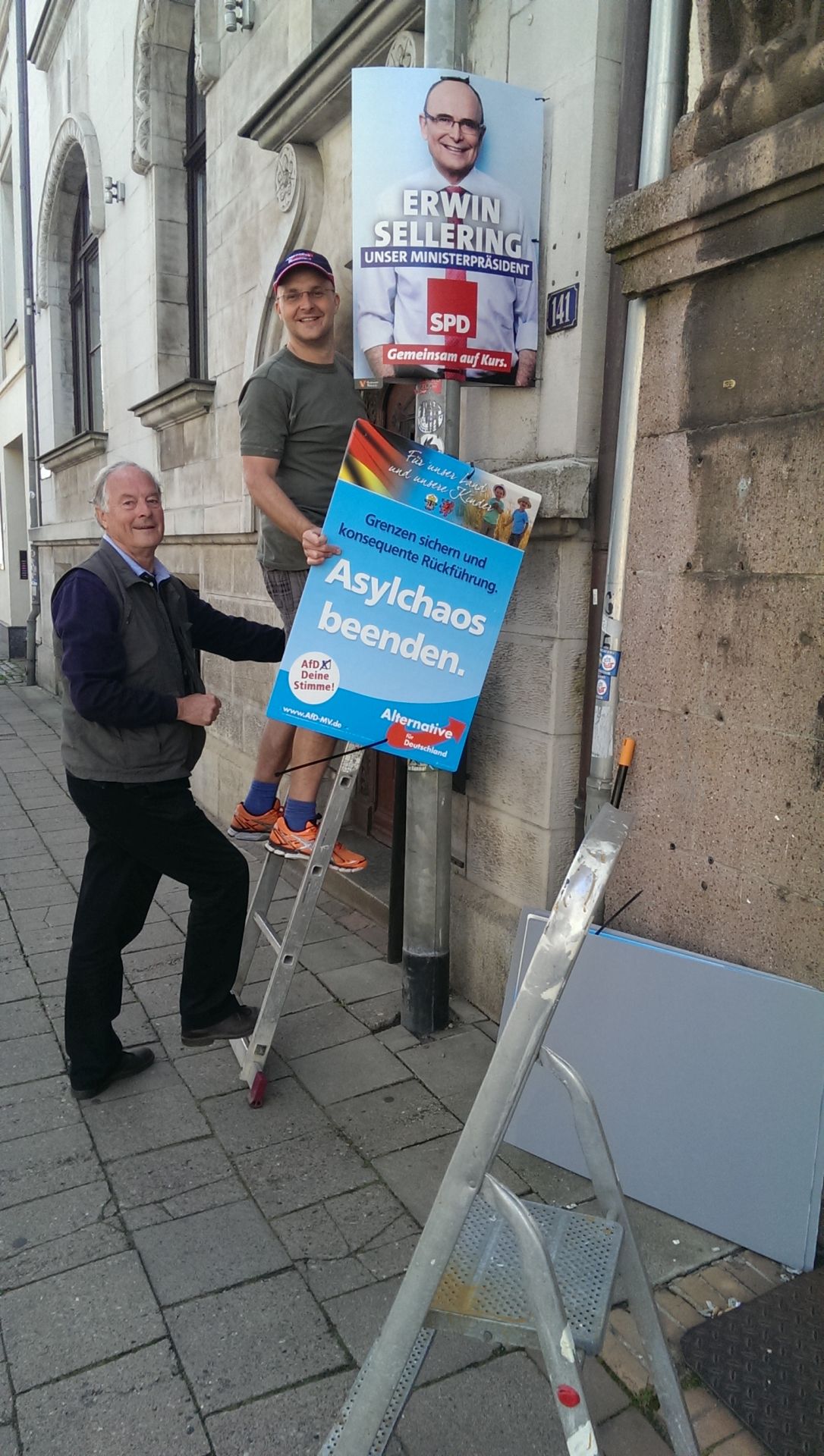 Am Sonntag gab es eine kleine Umstrukturierung, während MdL Kießling weiter nach Kassel fuhr, um die Thüringer AfD beim dortigen Parteikonvent zu vertreten, plakatierten MdL Thomas Rudy und Marcus Bühl mit Unterstützung aus Hessen und vom Kreisverband in der Schweriner Innenstadt und in einigen Ortsteilen für den Direktkandidaten Dirk Lerche. Herr Lerche war für die Hilfe besonders dankbar, da er sich beim Plakatieren einige Tage zuvor schwer am Bein verletzt hat und somit nicht selbst auf die Leiter steigen konnte. Dennoch ließ er es sich nicht nehmen, bei der Aktion zumindest dabei zu sein – das nennen wir wahren Kampfgeist und wünschen an dieser Stelle nochmals gute Genesung und natürlich ebenfalls den Sieg bei der Erringung des Direktmandats. Die weiteren mitgereisten Thüringer AfD-Mitglieder, darunter die Mitarbeiterin des Schmöllner Bürgerbüros von Thomas Rudy, Kerstin Schmalz, verteilten am Sonntag abermals Faltblätter.