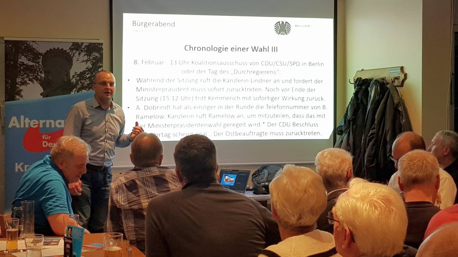 Danach begann der stellvertretende parlamentarische Geschäftsführer und Landessprecher, Stefan Möller, mit seinem Vortrag zu den Entwicklungen rund um den Thüringer Landtag in den letzten Wochen, die deutschlandweit für ein politisches Erdbeben gesorgt haben. Wie umfangreich die Auswirkungen auch in Berlin sind, legte im Anschluss der Bundestagsabgeordnete und Kreissprecher im KV Ilmkreis-Gotha, Marcus Bühl, dar. Das Personalkarussell vor allem bei der CDU hat sich heftig in Gang gesetzt, endlich kommt Bewegung in die erstarrte Altparteienpolitlandschaft.