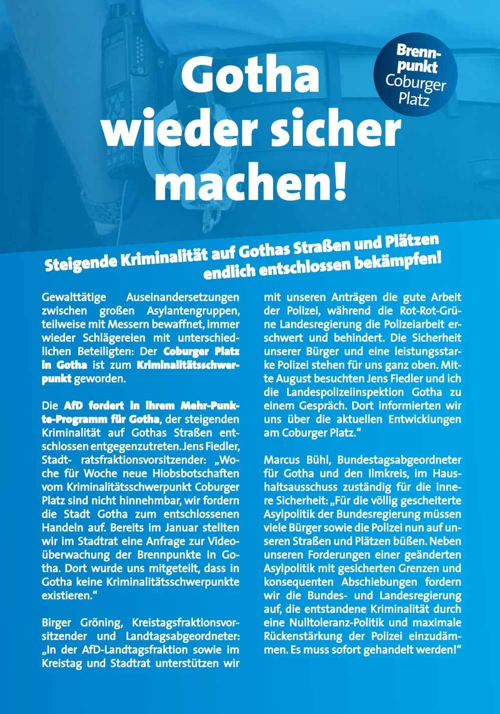 Der Coburger Platz in Gotha hat sich vor allem auch vor dem Hintergrund der Asylkrise zum absoluten Kriminalitätsschwerpunkt entwickelt. Wir wollen mit einem eigens angefertigten Infoblatt am kommenden Samstag, 12. September, von 9 bis 16 Uhr über unsere Forderungen dazu direkt auf dem Platz informieren. Zusätzlich wollen wir 15.000 Wurfblätter verteilen. Eine ähnliche Aktion ist für Arnstadt in Vorbereitung.