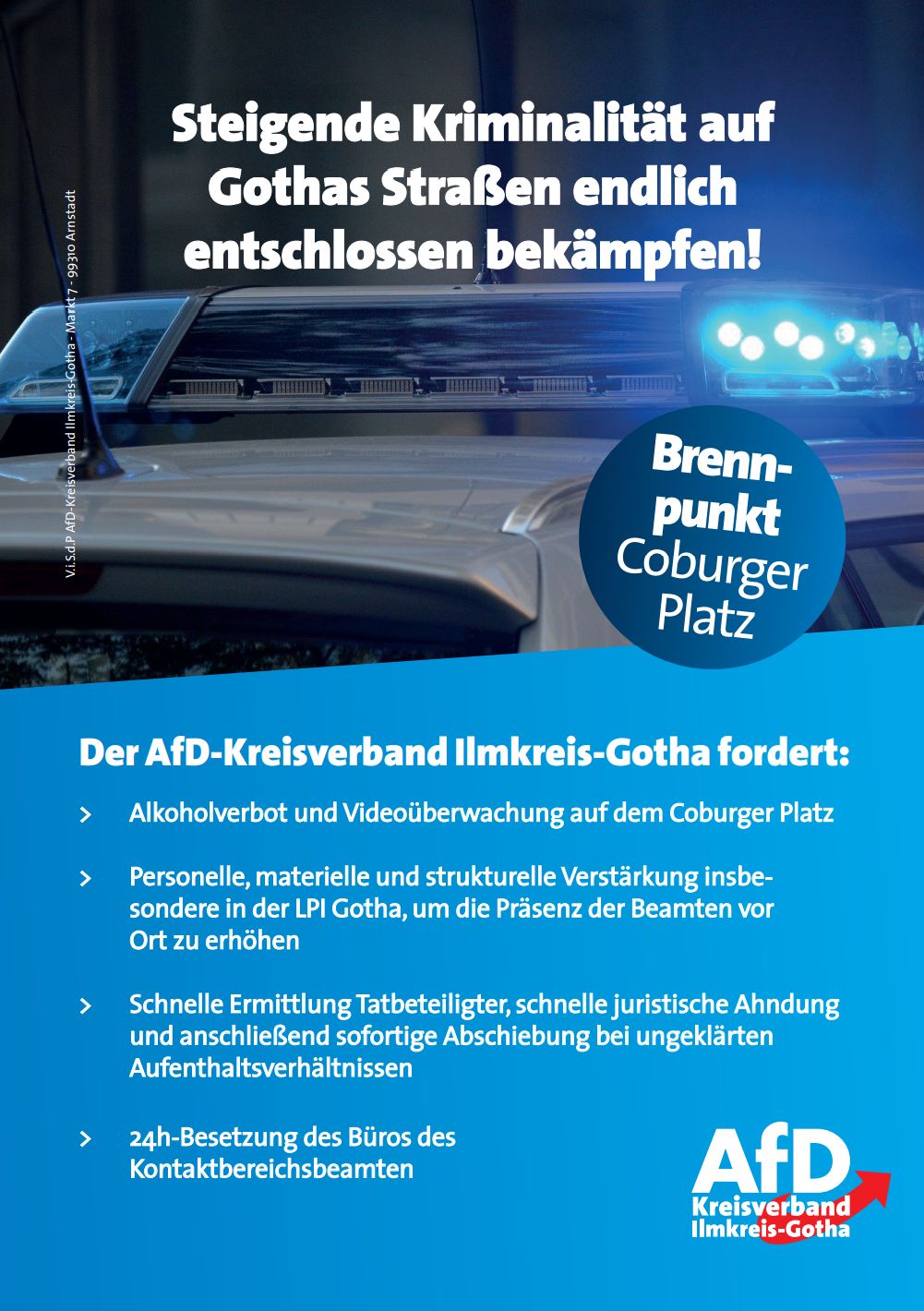 Infostand direkt am Kriminalitätsschwerpunkt Coburger Platz mit unserem Infoblatt (siehe Anhang). Wir wollen außerdem 15.000 Exemplare des Infoblattes verteilen, wenn Sie mitverteilen möchten schicken Sie uns bitte eine Mail an vorstand@afd-ilmkreis-gotha.de mit dem Betreff „Infoblatt Coburger Platz“.