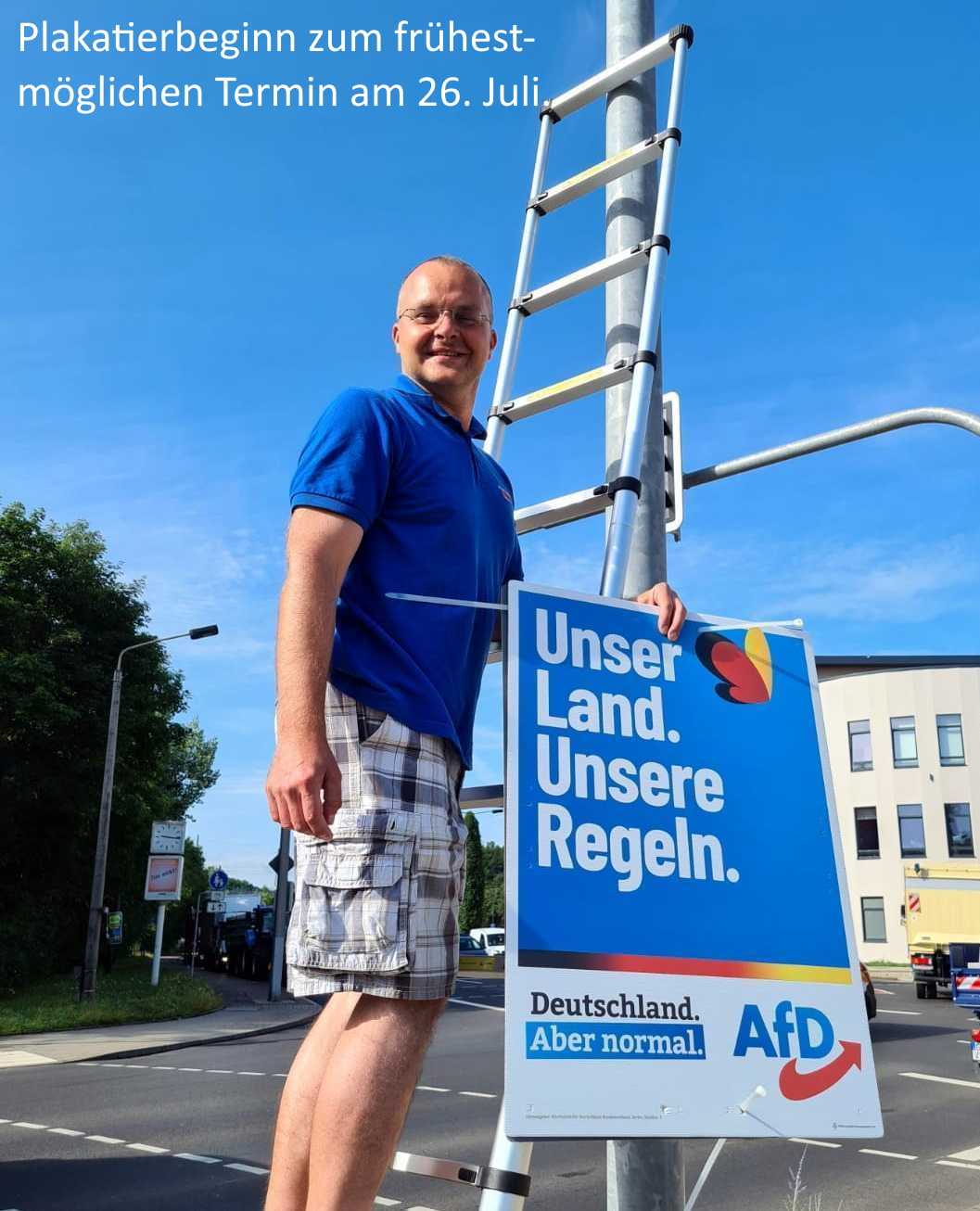 Tausende Plakate sind inzwischen eingetroffen, in den letzten Tagen war viel Schriftverkehr mit den Gemeinden zu erledigen, um die Plakatierungen genehmigen zu lassen. Jetzt kann es richtig losgehen. In den kommenden Tagen und Wochen wollen wir unsere Städte und Dörfer umfassend blau färben, um die neue Thüringer Volkspartei AfD weithin sichtbar zu machen.