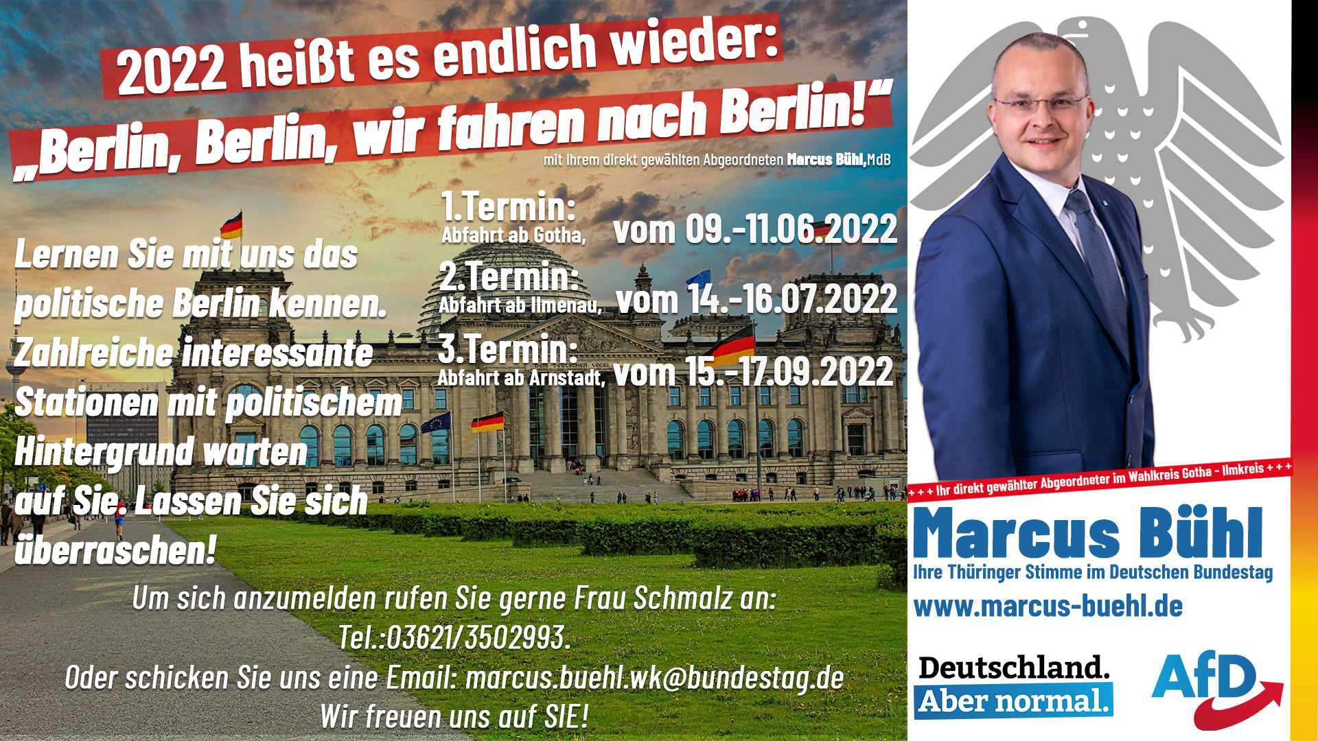 Endlich ist es wieder soweit: Sie möchten das politische Berlin in geselliger Thüringer Busgemeinschaft selbst erleben? Zahlreiche interessante Stationen mit politischem Hintergrund warten auf Sie. Lassen Sie sich überraschen! Und als Höhepunkt der Reise ein Besuch im Bundestag mit Erklärungen zum Reichstagsgebäude und Gesprächsrunde zur Arbeit der AfD-Fraktion mit mir.