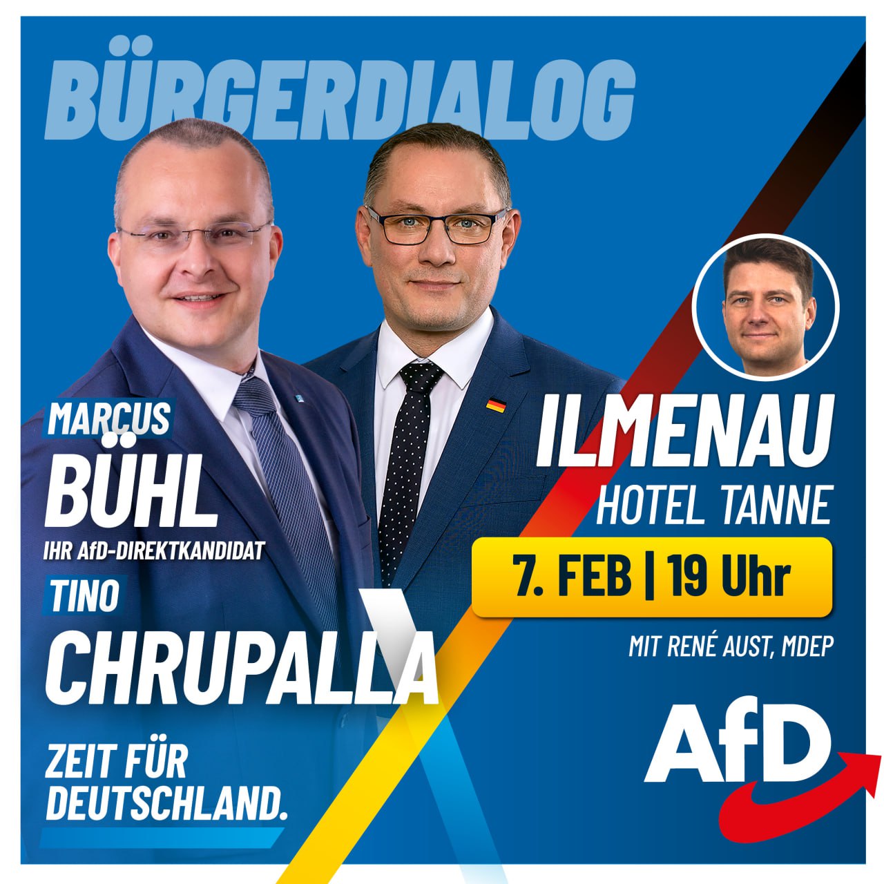 Am Freitag begrüßen wir unseren Bundessprecher Tino Chrupalla und den Leiter der AfD-Delegation im EU-Parlament, René Aust, herzlich zu unserem Bürgerabend in Ilmenau.