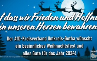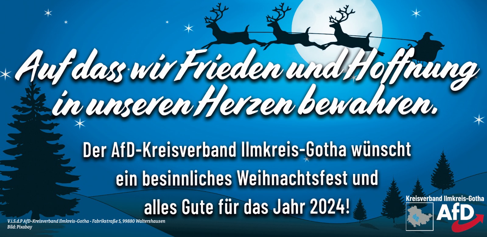 Liebe Mitglieder, Förderer und Freunde im Kreisverband Ilmkreis-Gotha, das Weihnachtsfest 2024 steht vor der Tür. Zeit, trotz aller Hiobsbotschaften auch mal zur Ruhe zu kommen, im Kreise der Lieben ruhige oder auch fröhliche Stunden zu genießen, um Kraft zu schöpfen. Wir danken für Ihre Unterstützung in diesem Jahr und wünschen eine schöne Weihnachtszeit und alles [...]