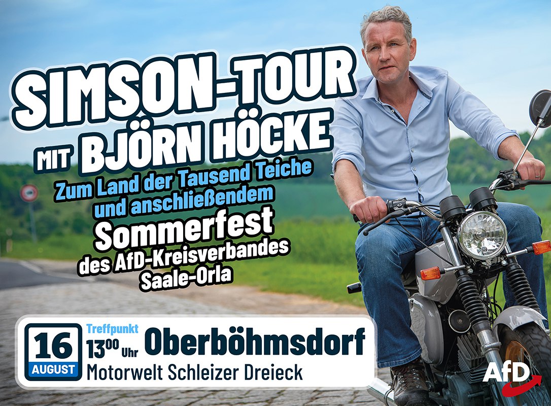 Ab 13 Uhr laden wir in Oberböhmsdorf am alten Start- und Zielbereich des Schleizer Dreiecks zur Simson-Tour mit Björn Höcke ein. Bevor wir durchstarten habt ihr die Möglichkeit, mit uns das Rennsportmuseum „Motorwelt Schleizer Dreieck“ zu besuchen – Eintrittspreise trägt der Verband. Danach geht es auf eine 45 Kilometer lange Strecke in Richtung Plothener Teichgebiet, wobei natürlich auch weitere Zweirad-Modelle gerne dabei sein dürfen.