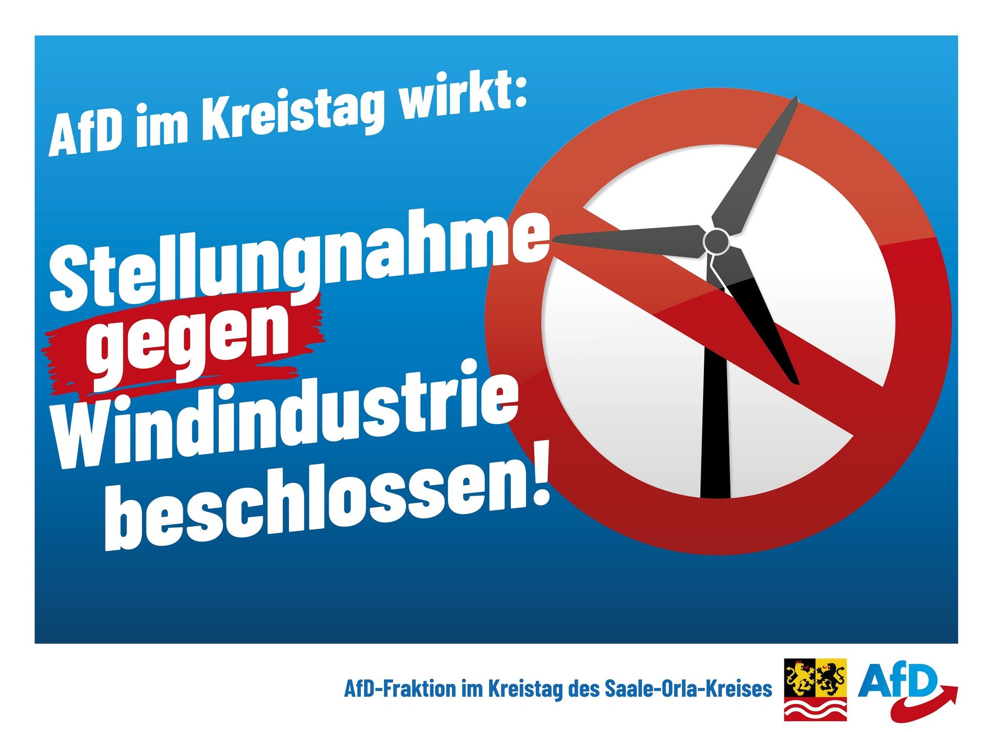 „Der Saale-Orla-Kreis hat durch die Schaffung und den dauerhaften Betrieb der Stauseen an der Saalekaskade, bestehenden Windindustrie-, Photovoltaikfreiflächen- und Biogasanlagen bereits erhebliche infrastrukturelle und landschaftliche Veränderungen getragen und damit einen überproportionalen Beitrag zur Energieerzeugung aus regenerativen Quellen geleistet. Eine weitere Flächenausweisung für Windenergieanlagen wird zur Sicherung des Kulturerbes abgelehnt.“