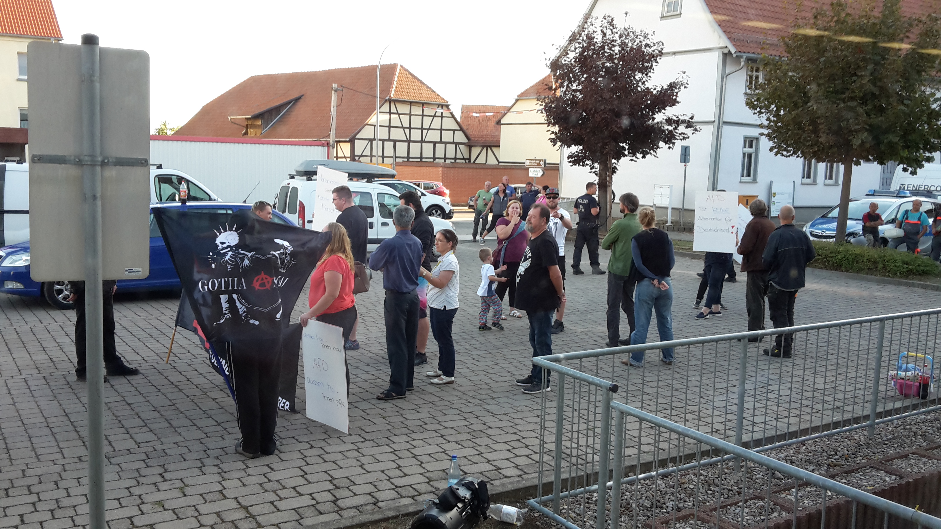 Nicht unerwähnt bleiben soll die Gegendemonstration, die sich vor dem Gebäude abspielte und sich gegen die Politik der AfD richtete. Immerhin hatten sich ein paar Leute mit selbst gemalten Pappschildern eingefunden.