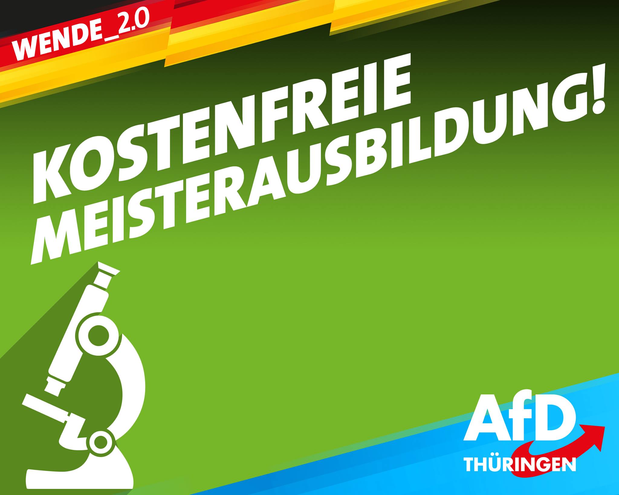 Das Studium ist unentgeltlich, die Meisterausbildung hingegen kostenpflichtig. Diese Ungleichbehandlung ist nicht nachzuvollziehen. Wir setzen uns daher für eine kostenfreie Ausbildung zum Handwerks- und Industriemeister mit Ausbildungsbefähigung ein, wenn im Anschluss an die Ausbildung die Tätigkeit in Thüringen ausgeführt wird.
