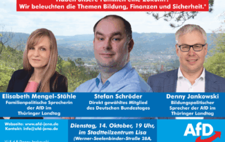 "Haben unsere Familien eine Zukunft ? - Wir beleuchten die Themen Bildung, Finanzen und Sicherheit." Es freuen sich auf Sie: Elisabeth Mengel-Stähle (MdL), Sprecher für Familienpolitik; Denny Jankowski (MdL), Sprecher für Bildung sowie Stefan Schröder (MdB), direkt gewählter Abgeordneter des Deutschen Bundestages für Jena. Wir freuen uns auf Sie.