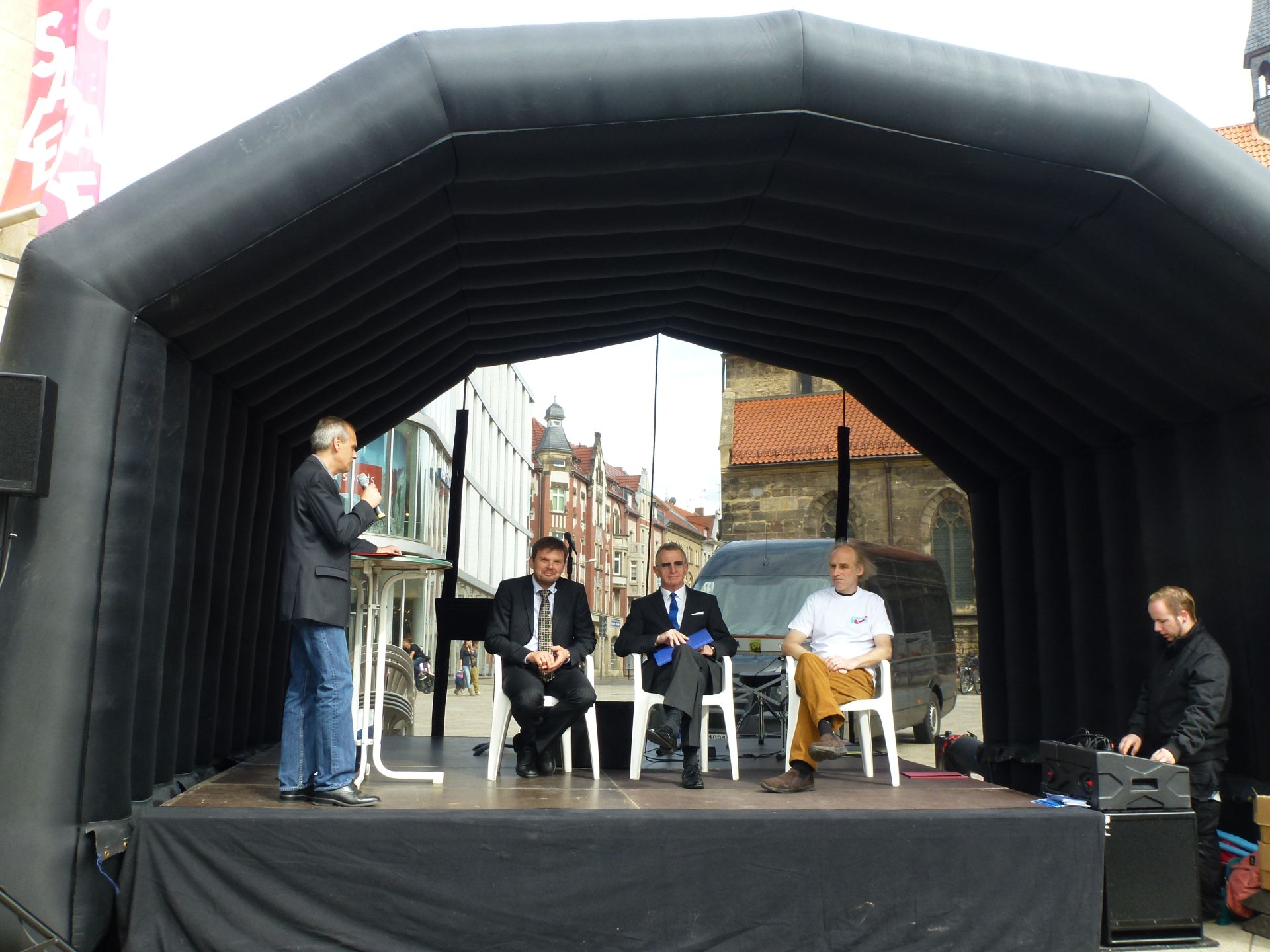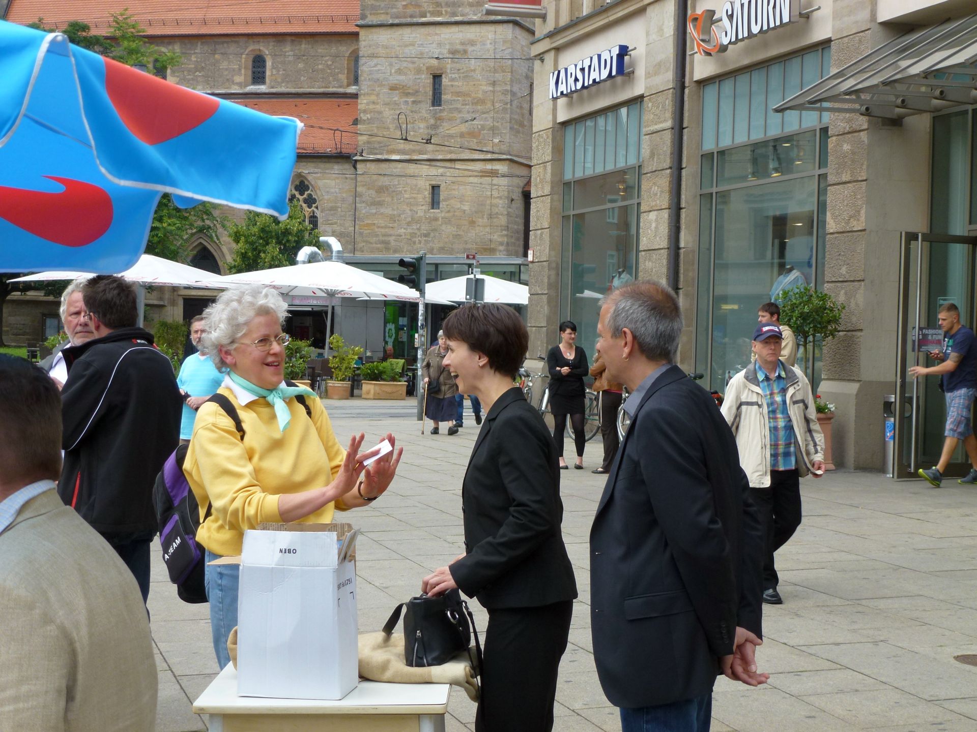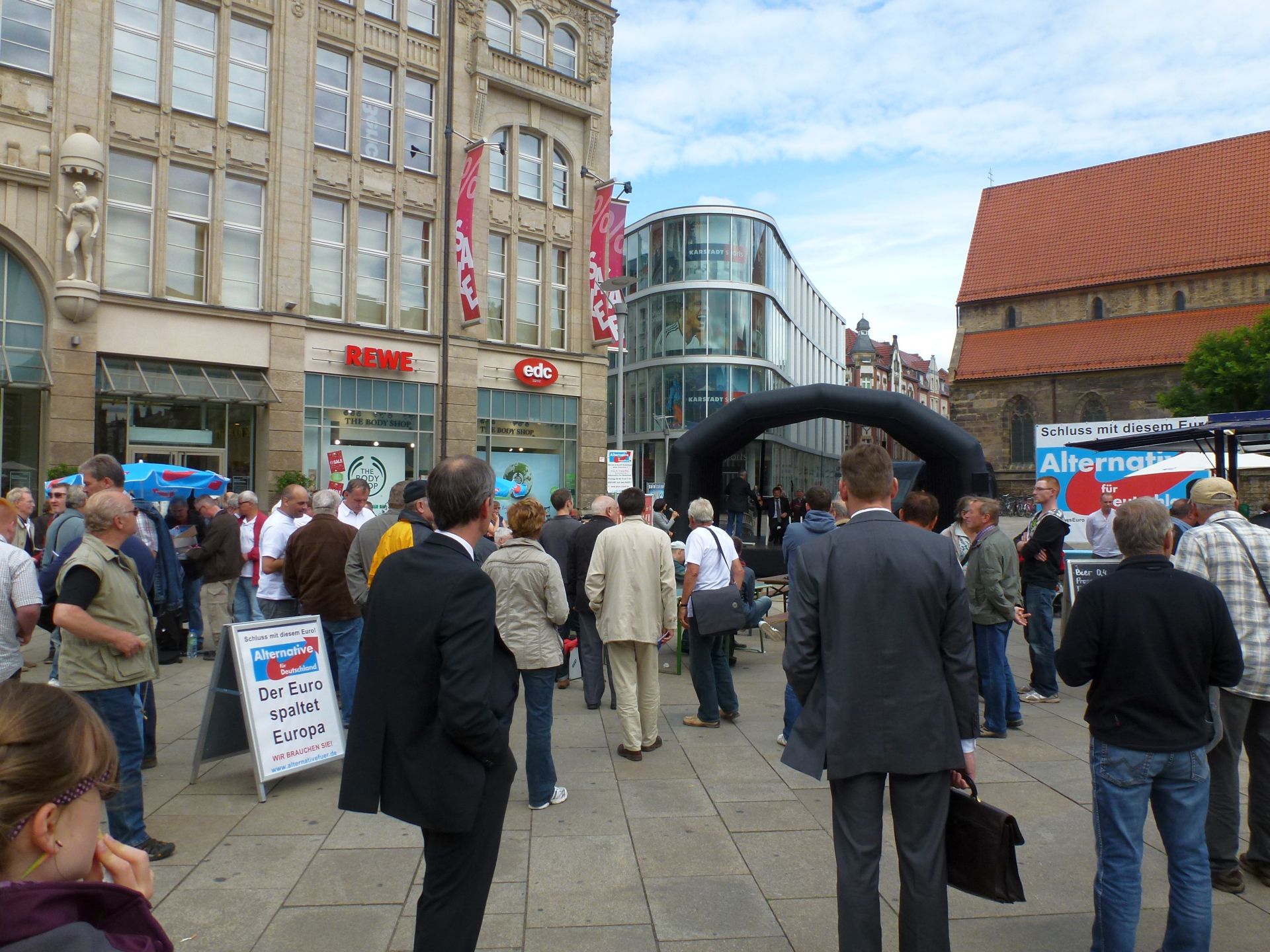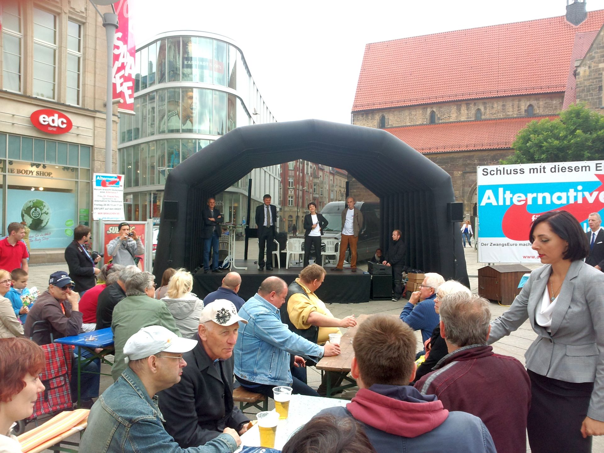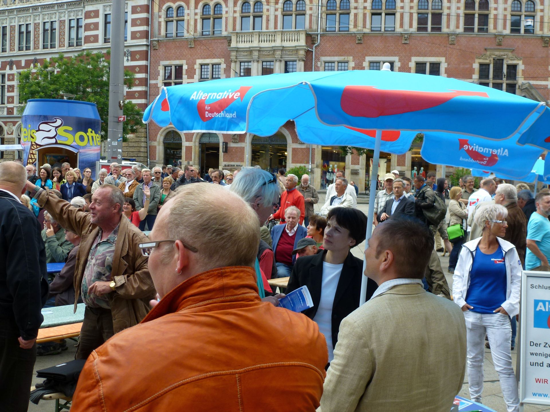 In der Zwischenzeit war Hauptrednerin Dr. Frauke Petry, Sprecherin des Bundesvorstands der Alternative für Deutschland, eingetroffen. Sie nutzte zunächst die Gelegenheit, um mit Bürgern am Rande der Hauptbühne ins Gespräch zu kommen. Im Anschluss trat sie auf die Bühne und erläuterte den inzwischen sehr zahlreich erschienenen Bürgern auf dem Platz vor dem Anger 1, warum Deutschland eine Alternative braucht. Einige Bürger nutzen in der anschließenden Fragerunde die Möglichkeit, Fragen zur Partei an Frau Petry zu richten, die von ihr kompetent und ausführlich beantwortet wurden. Das Themenspektrum ging hierbei weit über den Euro hinaus und erstreckte sich über verschiedene Themenfelder von der Wirtschafts- bis hin zur Sozialpolitik.