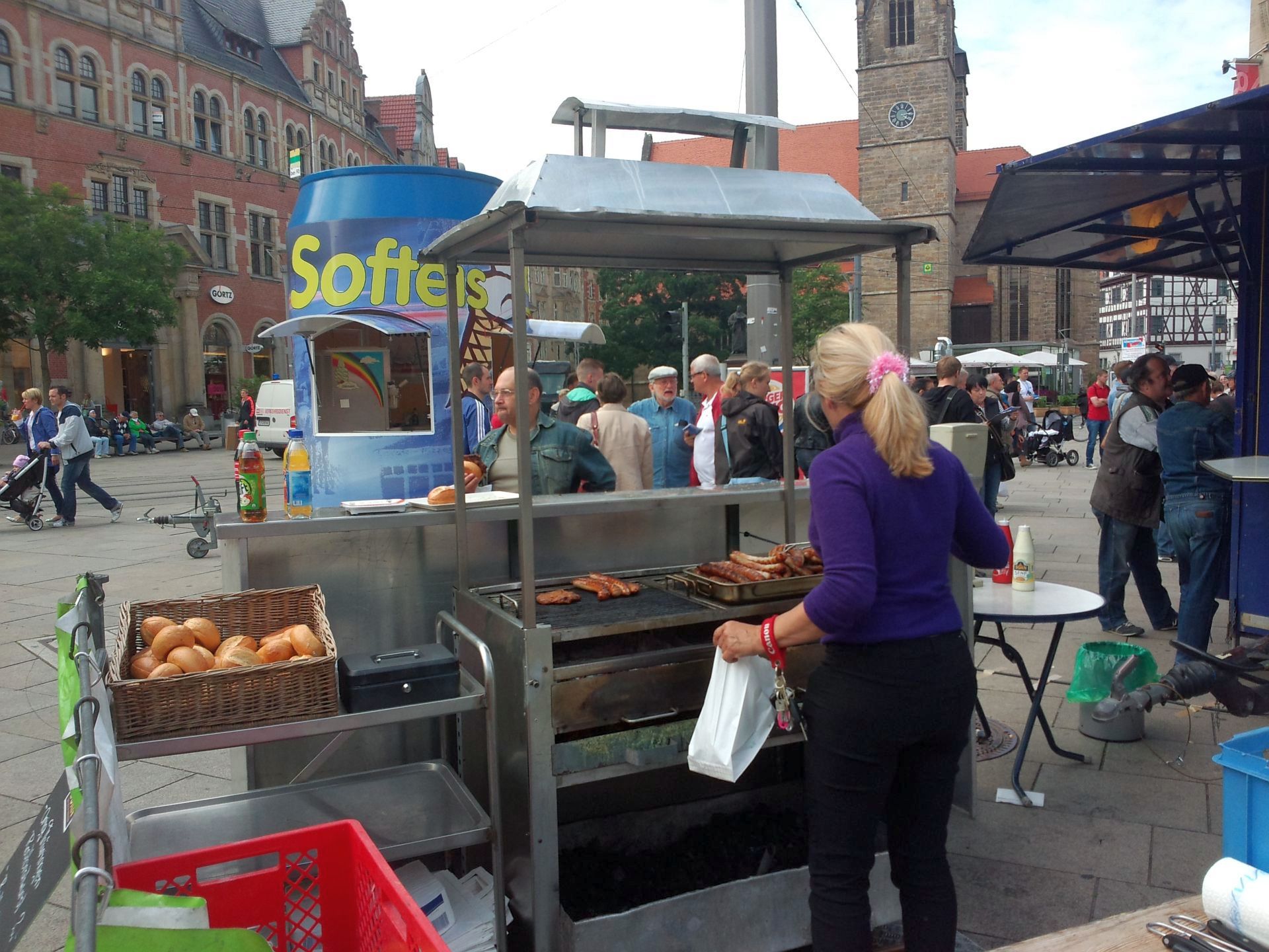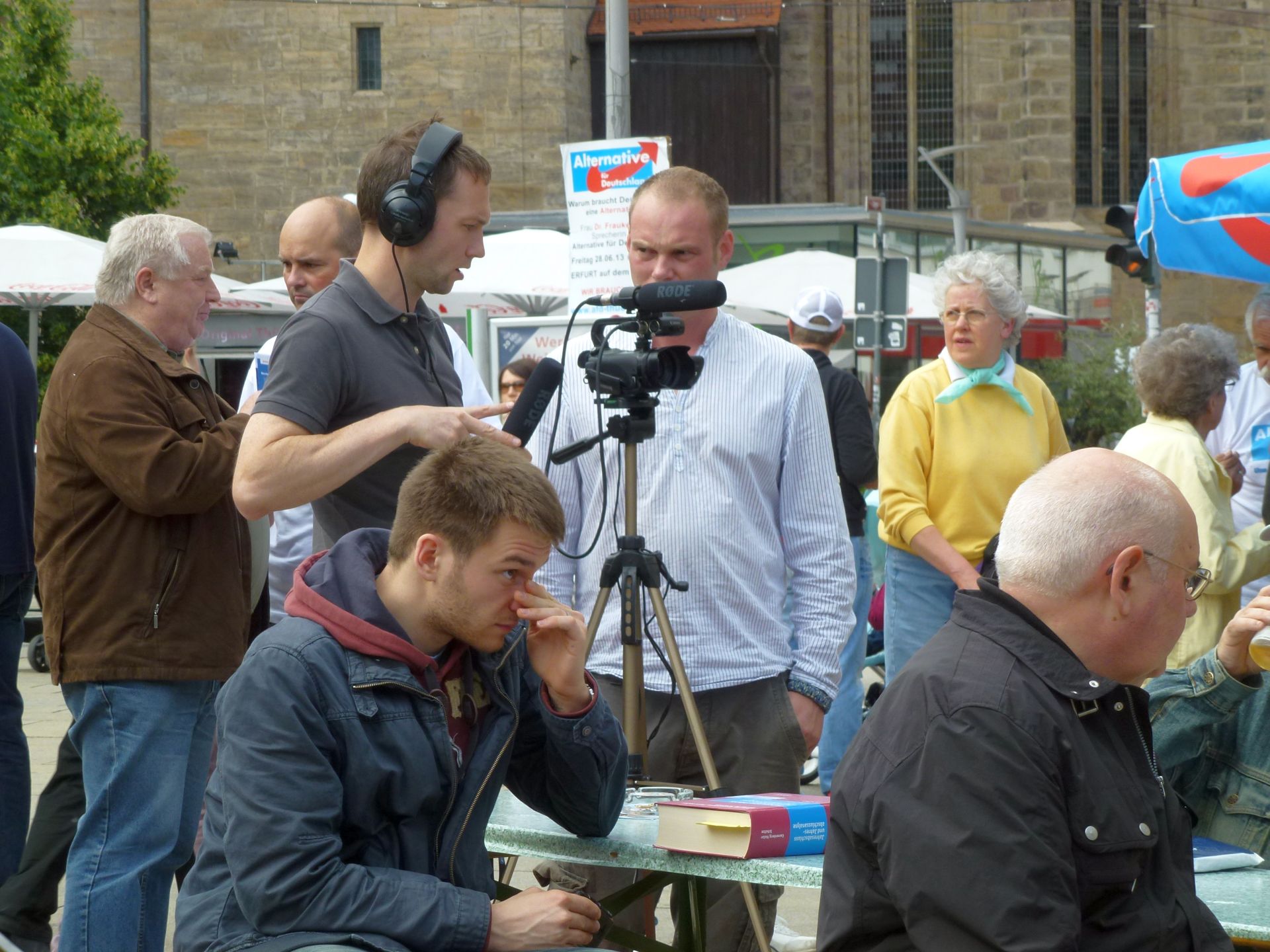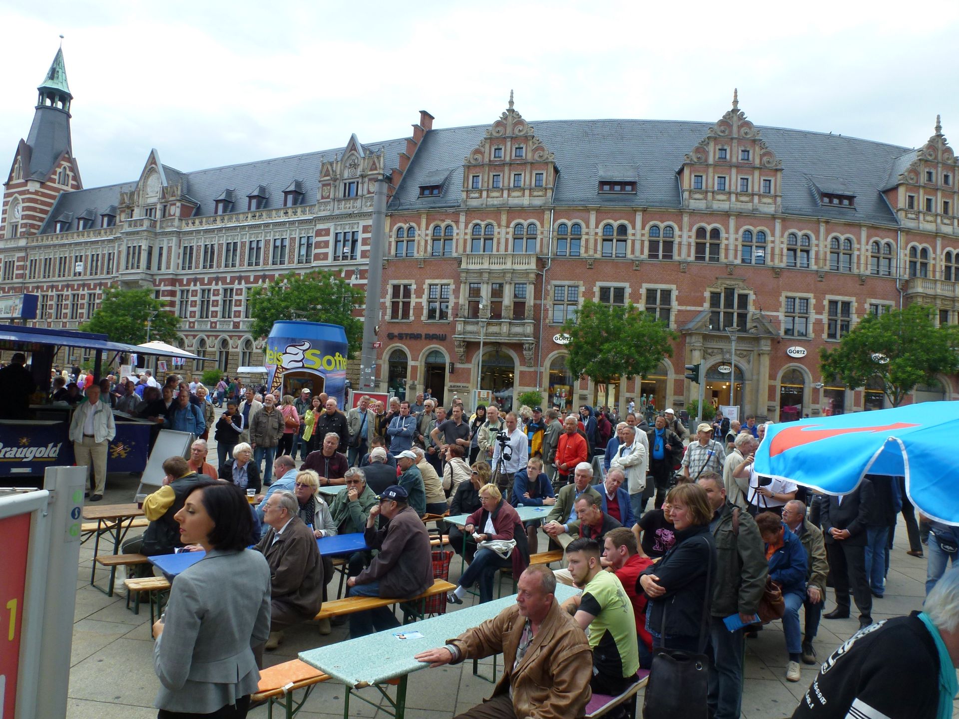 Blau-rot geschmückt und voller interessierter Bürger. So zeigte sich heute Nachmittag der Erfurter Anger, nachdem er vom Landesverband Thüringen der Alternative für Deutschland vereinnahmt wurde. Nachdem am frühen Nachmittag die Hauptbühne mit Sitzgelegenheiten aufgebaut war, begannen einzelne Kreisverbände, um die Bühne herum eigene Informationsstände zu errichten. Für wohliges Ambiente sorgten Livemusik und gastronomische Versorgung, bei der natürlich die Thüringer „Nationalspeise“, unsere Rostbratwurst, nicht fehlen durfte.