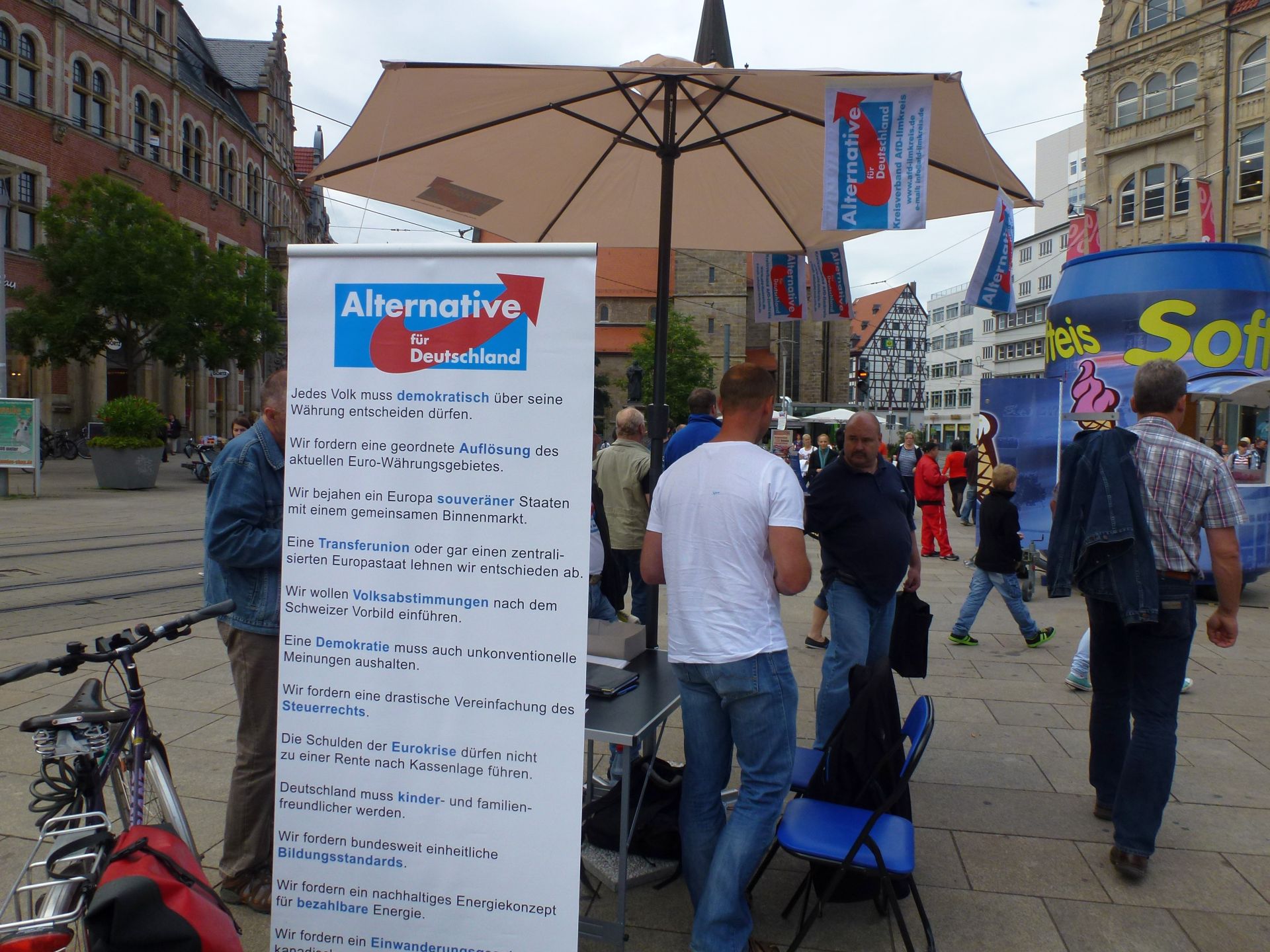 Wir möchten uns an dieser Stelle ganz herzlich bei allen Thüringern bedanken, die uns mit ihrer heutigen Unterstützerunterschrift – und das waren nicht Wenige – ihr Vertrauen gegeben haben. Liebe Thüringer, bitte unterstützen Sie uns weiter so, und wir werden ganz sicher erfolgreich sein zur Bundestagswahl am 22. September 2013. Bitte sagen Sie auch Freunden und Bekannten Bescheid, leisten Sie Ihren Beitrag zur Aufklärung – Deutschland hat ab sofort eine Alternative zur Altparteienpolitik! Wir wollen etwas verändern. Und Sie können mithelfen – indem Sie mit Freunden und Bekannten über uns sprechen. Wir benötigen weiterhin Unterstützerunterschriften. Das Formular finden Sie auf dieser Webseite.