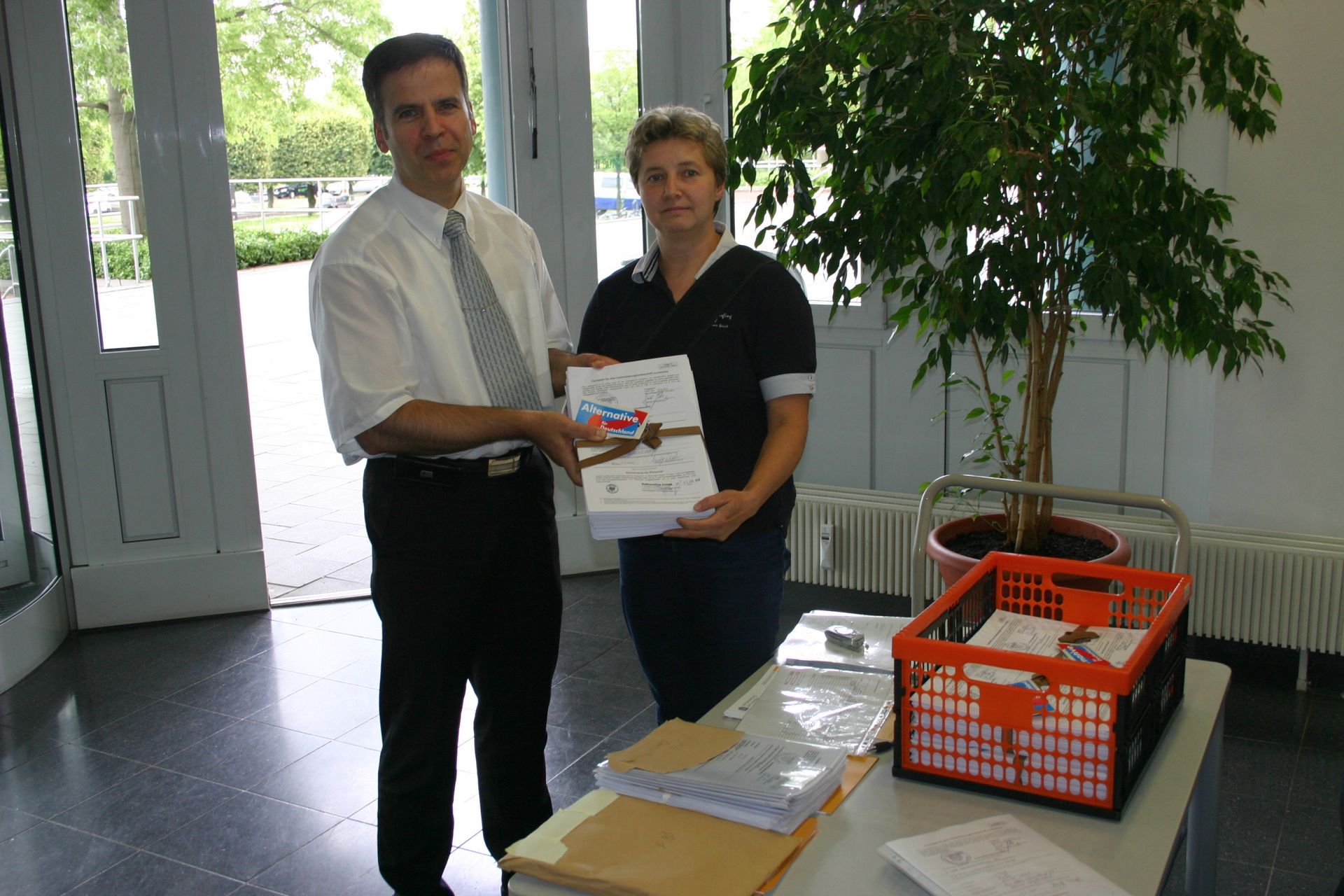 Am gestrigen Donnerstag, 11.07.2013, hatten Carmen Riedel und Olaf Kießling vom Vorstand des Landesverbands Thüringen der Alternative für Deutschland die ehrenvolle Aufgabe, im Namen aller Sympathisanten, Unterstützer und Mitglieder die gesammelten über 3000 Unterschriften an den Landeswahlleiter zu übergeben. Für Ordnung und die feierliche „Verpackung“ hatte zuvor Klaus Gebhardt gesorgt, vielen Dank dafür, Klaus, es war ein bißchen wie Weihnachten!