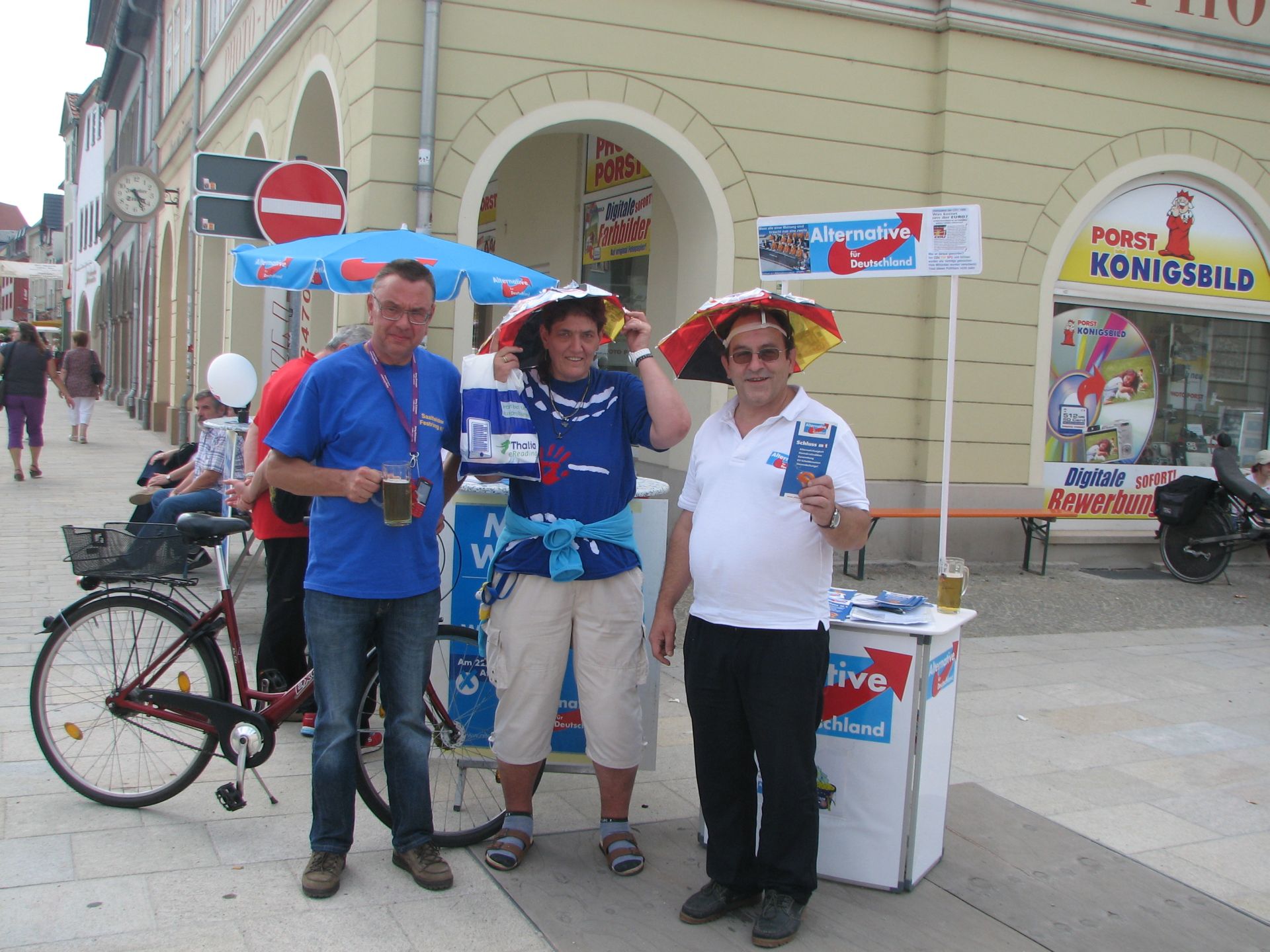 Als erstes wurde die ganze Standreihe der Parteien schön langsam abgelaufen, damit sie registrieren konnten, dass wir auch präsent sind. Als AfD’ler leicht zu erkennen, da mit AfD-Shirt und Eurorettungsschirm auf dem Kopf ausgestattet.
