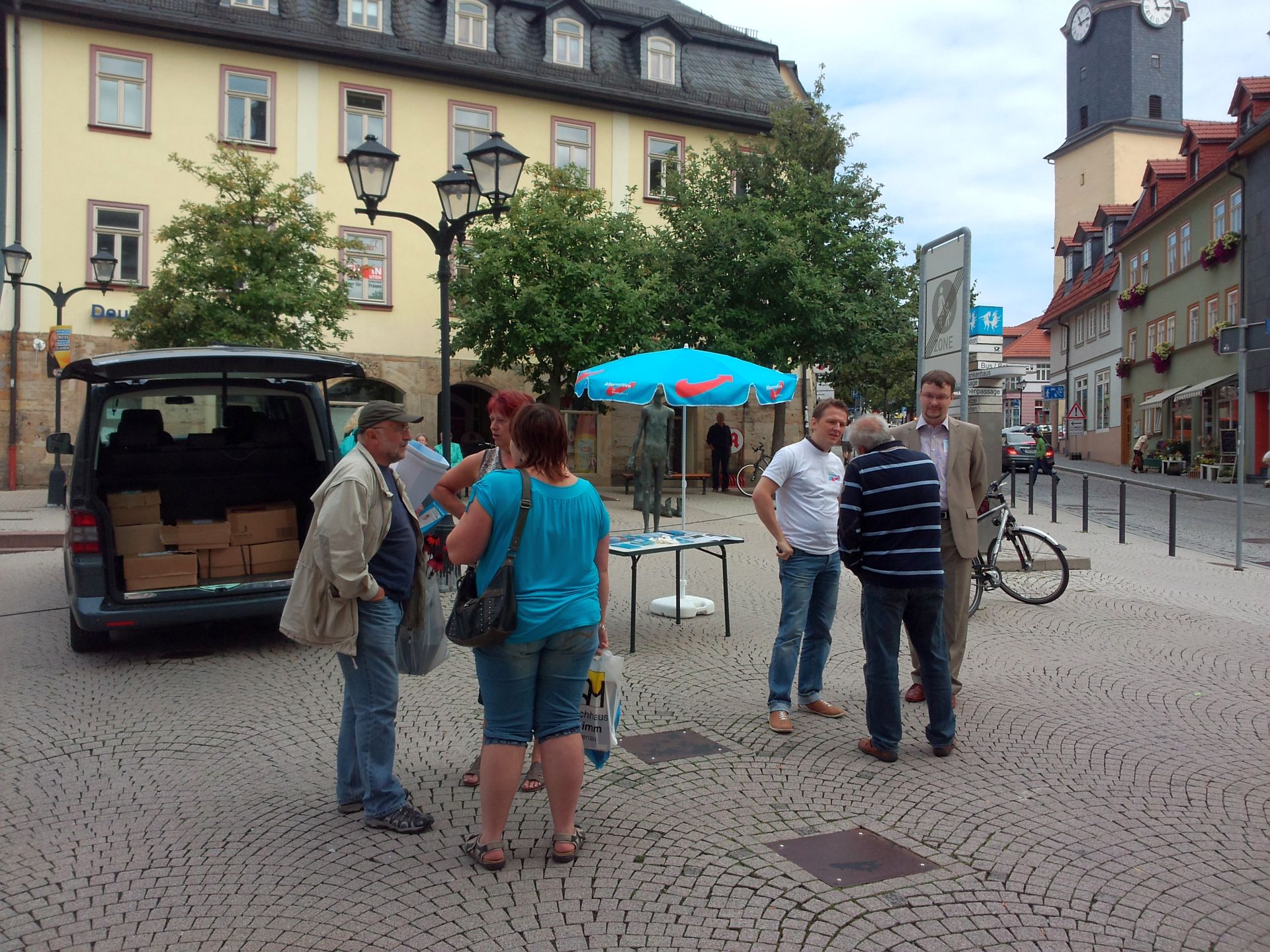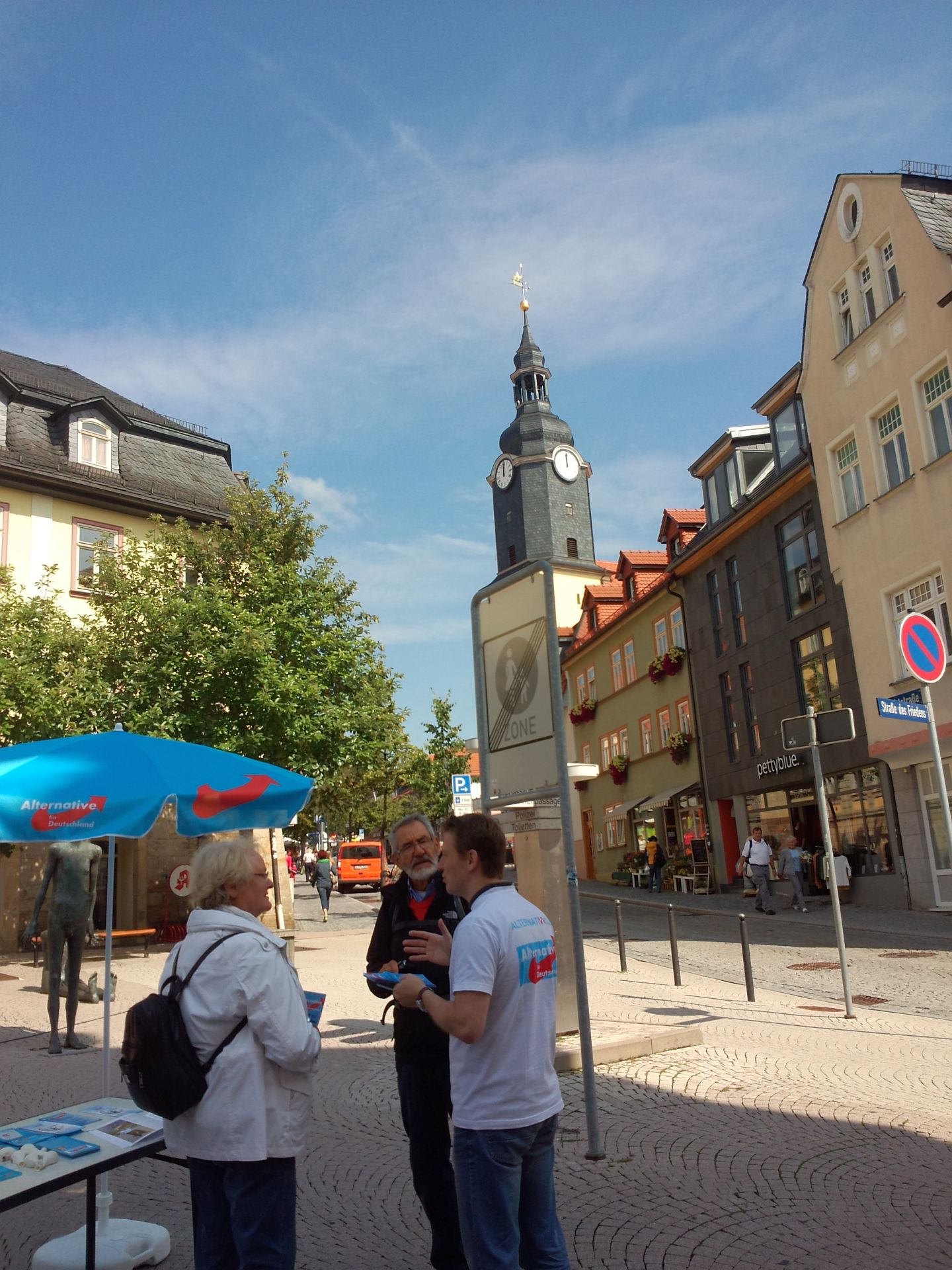 So fanden in den Vormittagsstunden in Arnstadt und Ilmenau im Ilm-Kreis Infostädte jeweils im Altstadtbereich (Apothekerbrunnen IL und Hopfenbrunnen ARN) statt. Hier konnten wir sehr erfreut feststellen, dass das Interesse der Bürger an unserem Infomaterial zunehmend steigt, und natürlich auch die Diskussionsfreude zu den politisch brisanten Themen.