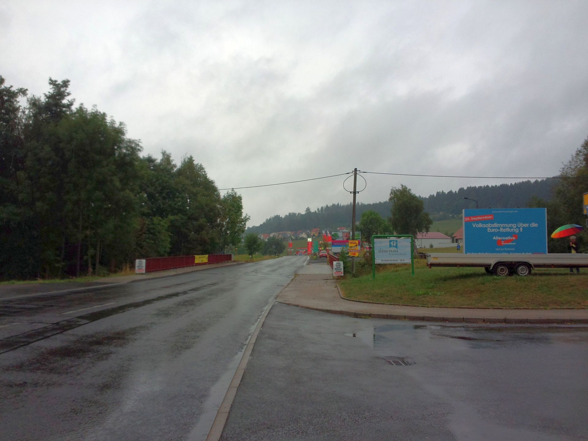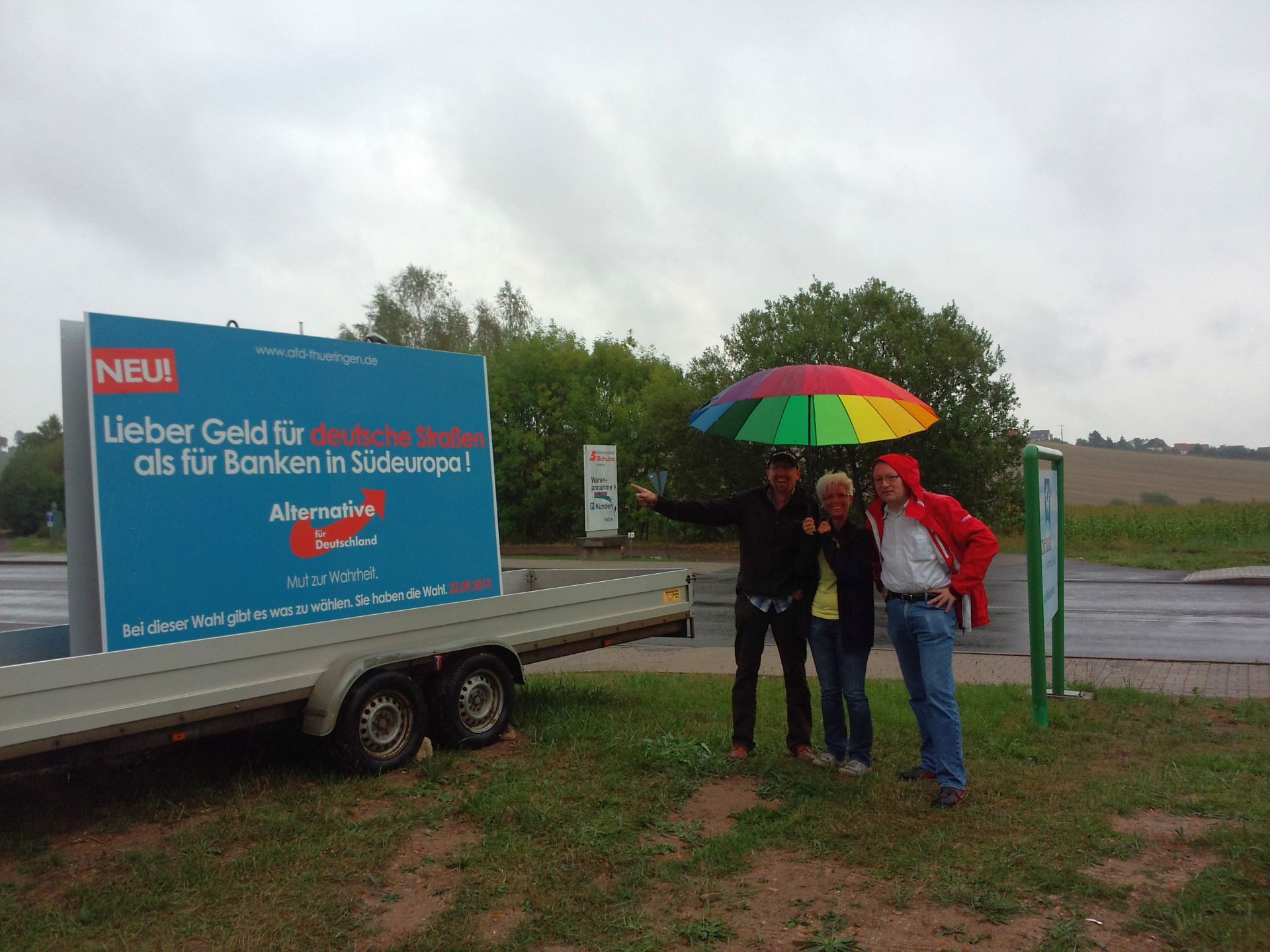 Da wir die Bundeskanzlerin gerne „gebührend“ begrüßen möchten, hat der AfD-Kreisverband Ilmkreis-Gotha für eine entsprechende Plakatierung im nahen Umfeld der Rednerbühne von Frau Merkel auf dem Festhallenparkplatz in Ilmenau sowie via mobilem Großplakat von der Autobahn kommend gesorgt. Wenn sich schon der Himmel nicht himmelblau zeigt, dann wollen wir doch dem Leitspruch „Ilmenau himmelblau“ zumindest in Plakatform gerecht werden. 🙂
