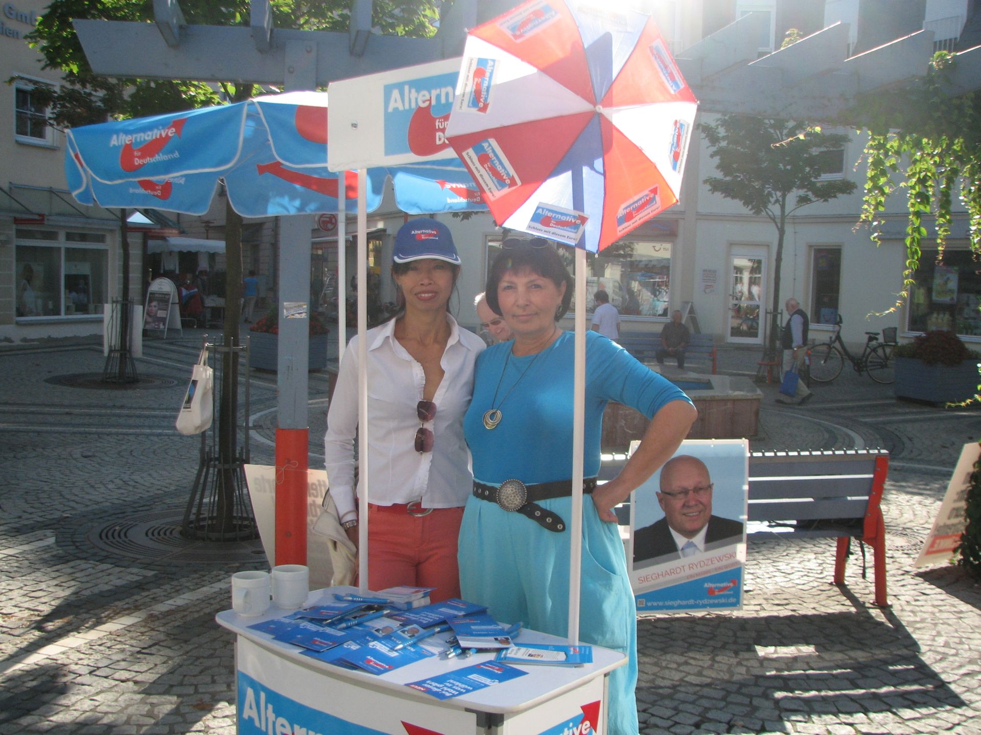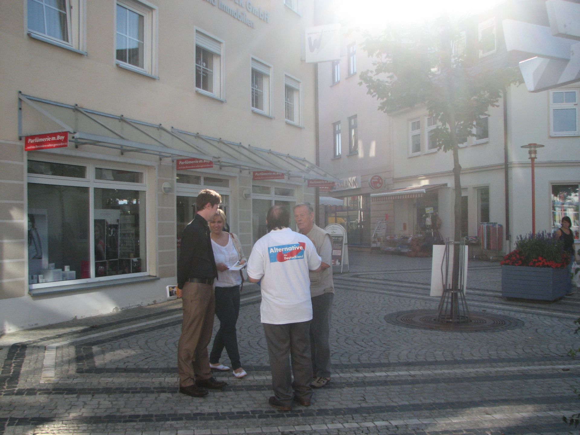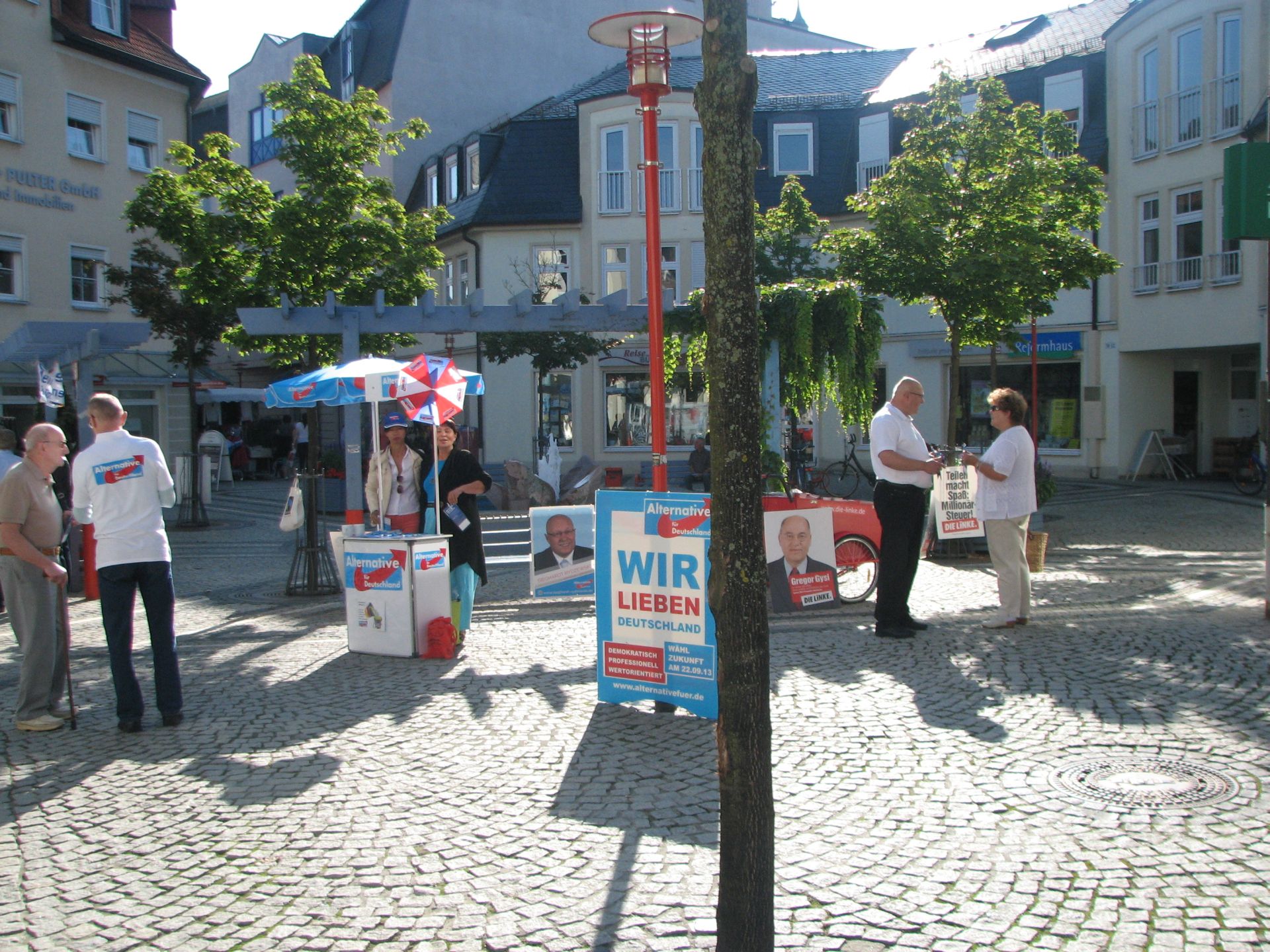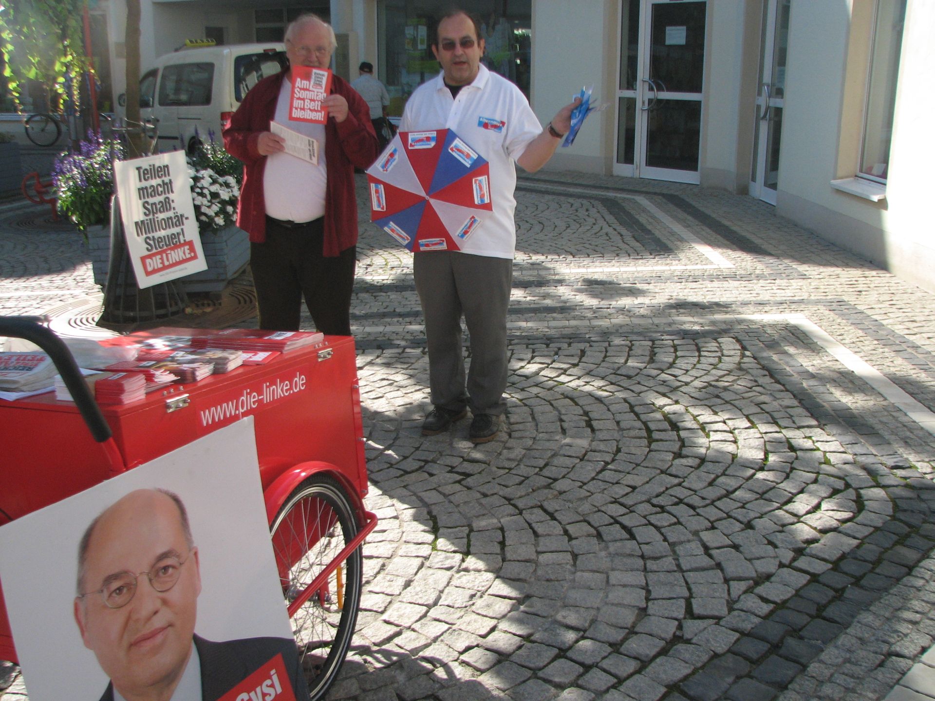Nach gewisser Anlaufzeit füllte sich der Platz, die Leute gingen Einkaufen und wir verteilten fleißig unsere Flyer und sprachen mit den Wählern. Wir, das heißt Herr Rydzewski und Herr Meusel, mit ihren besseren Hälften, sowie Frau Machunze und ich. Wir waren damit klar in der Überzahl, da die Linken nur 2 Aktivisten hatten. Weil der Wahlkampfstand der Linken verwaist war, stellte ich mich davor, um potentiellen Linkewählern die Alternative aufzuzeigen. Die Interessenten hielten mich trotz Shirt der AfD für einen Linken, erst in den Diskussionen wurden abweichende Positionen deutlich. Wir unterhielten uns auch gut mit den Linken, insbesondere Gregor Gysi ist ja in Sachen Eurokritik nicht so weit entfernt von der AfD.