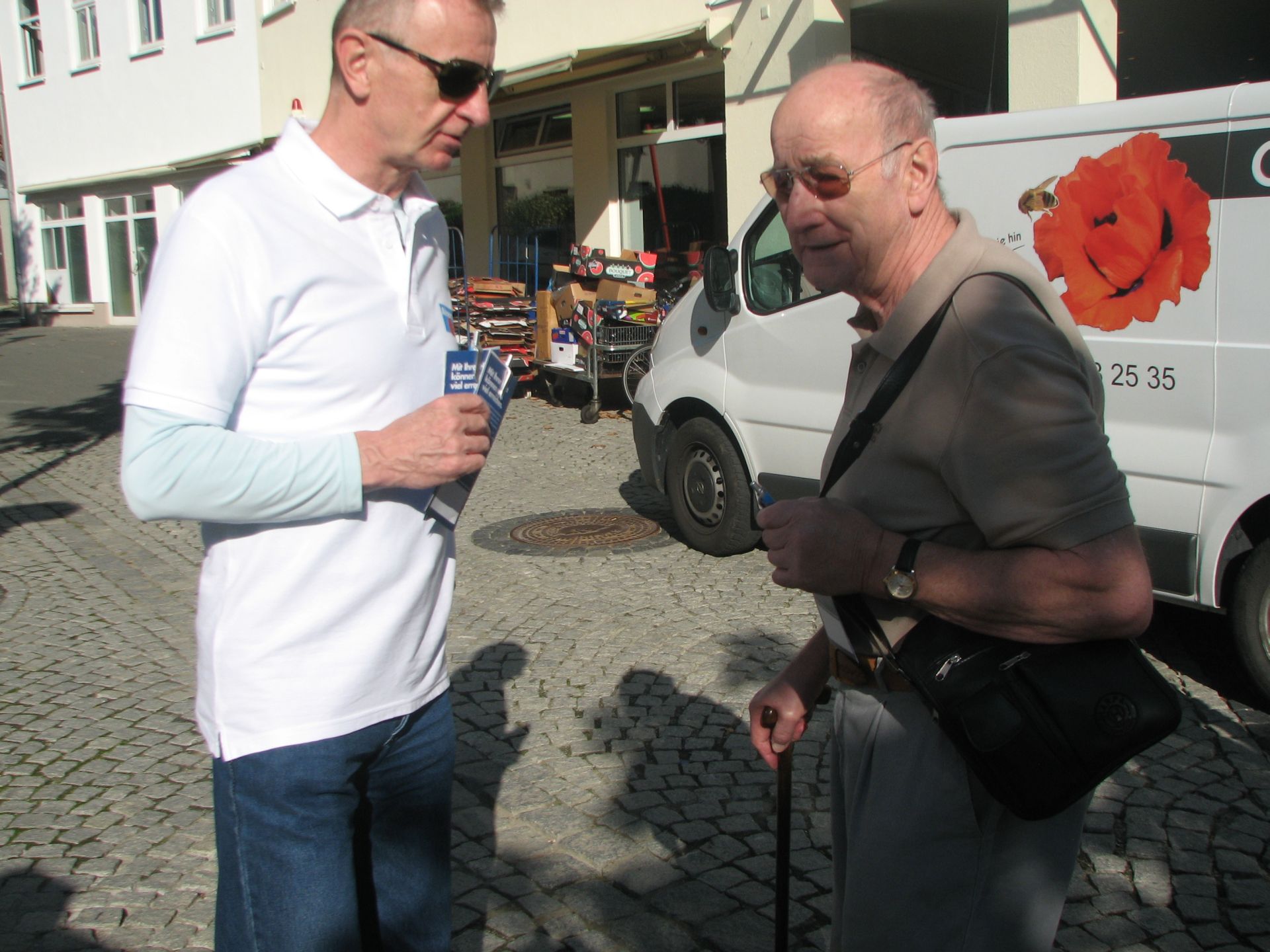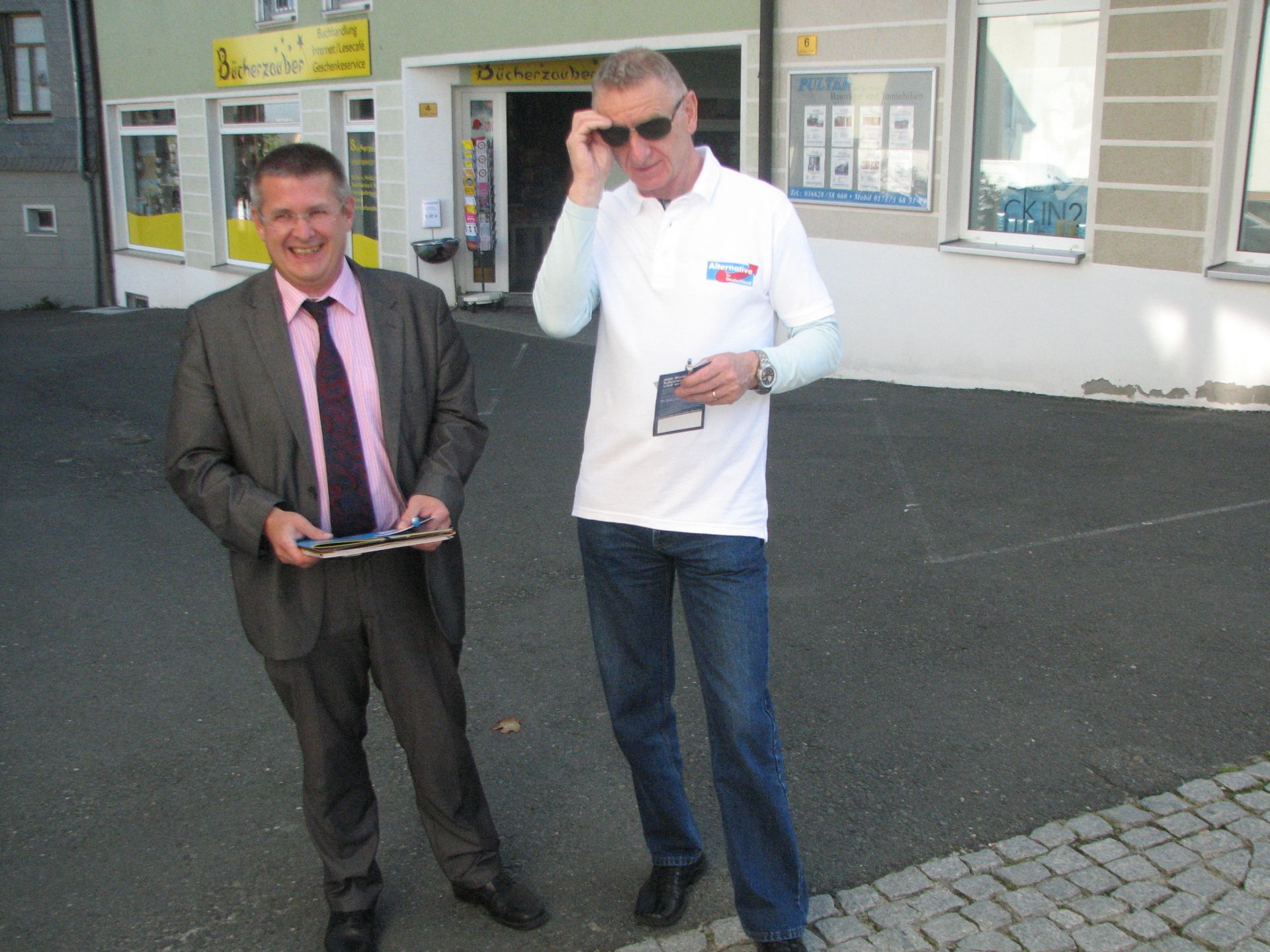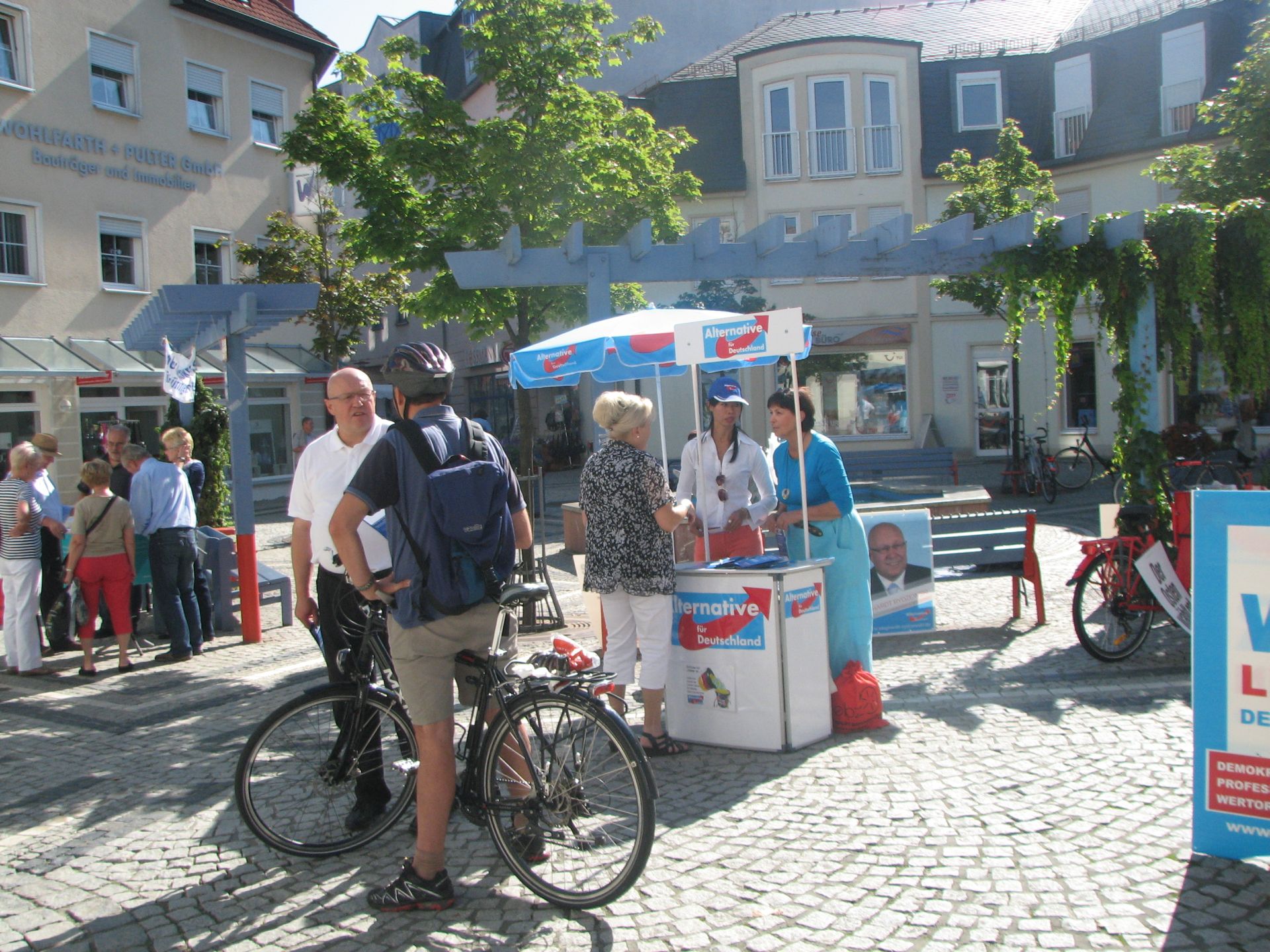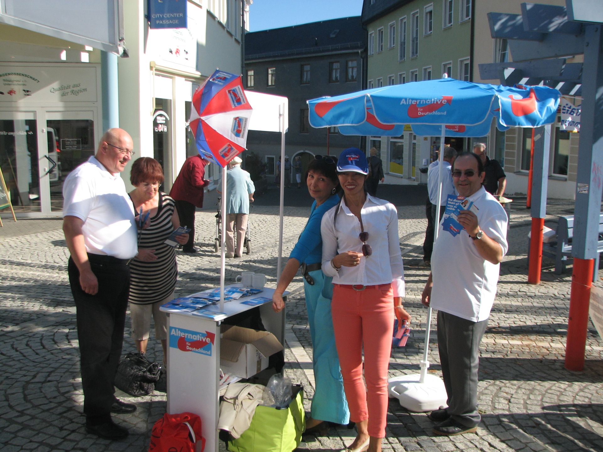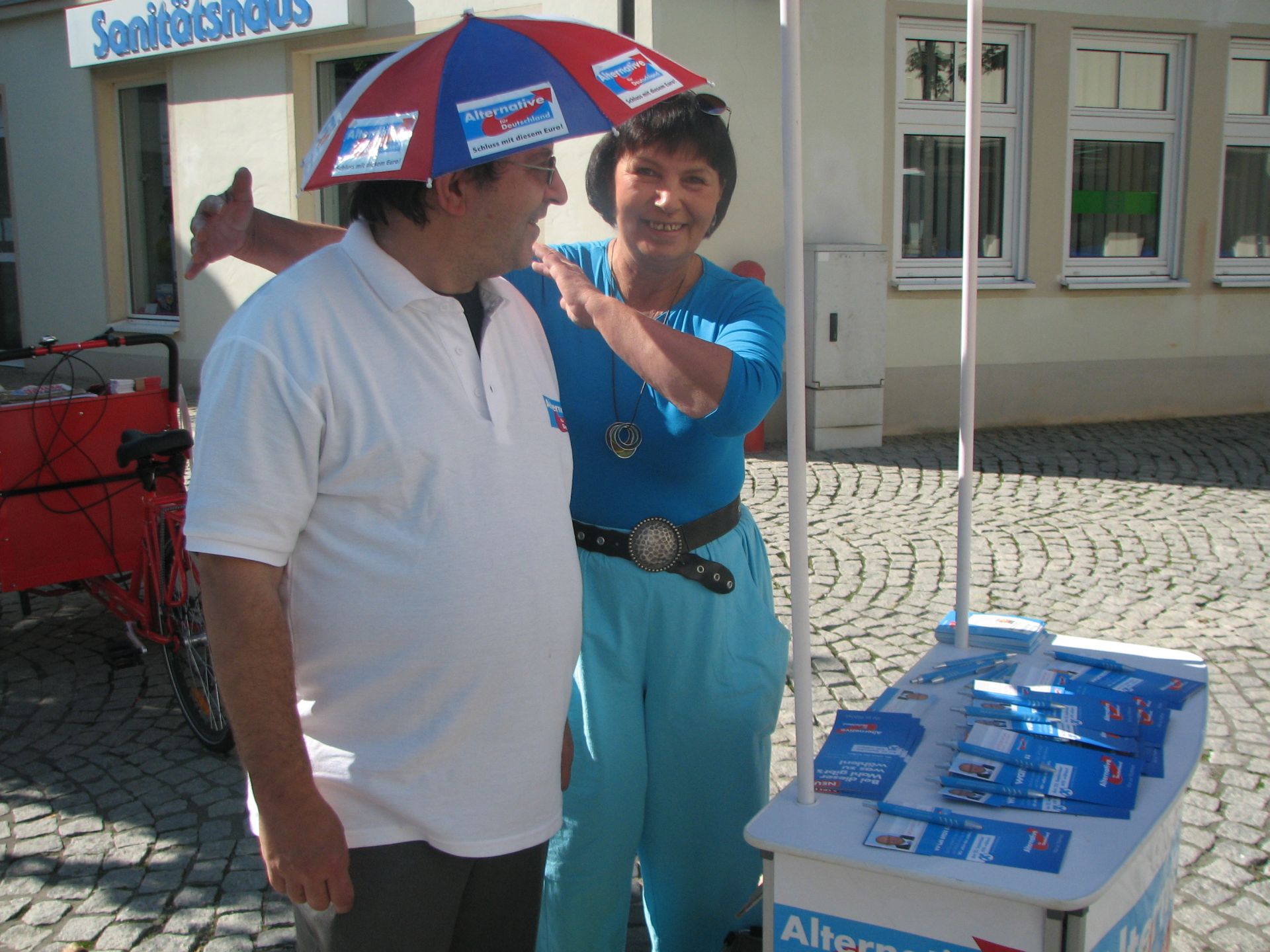 Nach gewisser Anlaufzeit füllte sich der Platz, die Leute gingen Einkaufen und wir verteilten fleißig unsere Flyer und sprachen mit den Wählern. Wir, das heißt Herr Rydzewski und Herr Meusel, mit ihren besseren Hälften, sowie Frau Machunze und ich. Wir waren damit klar in der Überzahl, da die Linken nur 2 Aktivisten hatten. Weil der Wahlkampfstand der Linken verwaist war, stellte ich mich davor, um potentiellen Linkewählern die Alternative aufzuzeigen. Die Interessenten hielten mich trotz Shirt der AfD für einen Linken, erst in den Diskussionen wurden abweichende Positionen deutlich. Wir unterhielten uns auch gut mit den Linken, insbesondere Gregor Gysi ist ja in Sachen Eurokritik nicht so weit entfernt von der AfD.