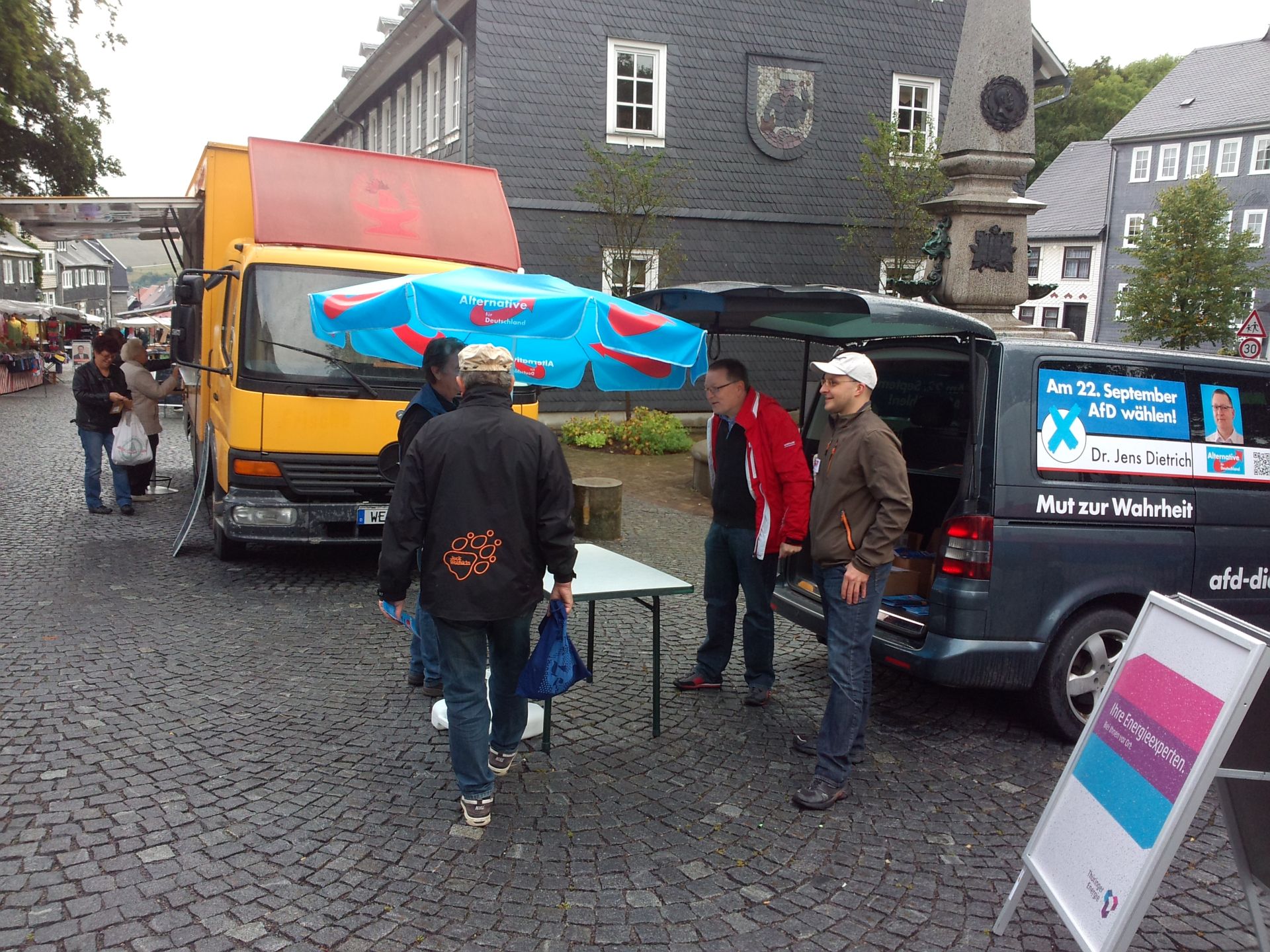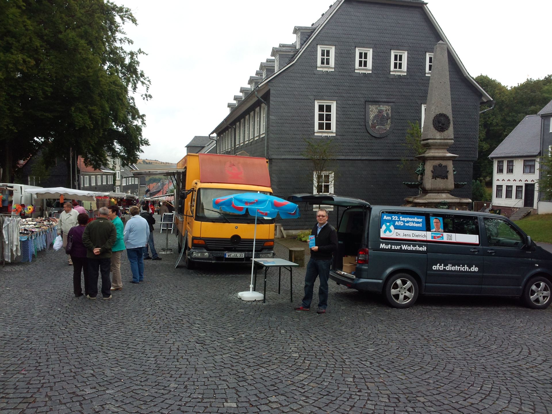 Am heutigen Donnerstag zeigte die AfD Ilmkreis-Gotha Präsenz am Rennsteig … in Großbreitenbach, während des allwöchtentlichen Markttages. Trotz leider bescheidenem Wetter konnten wir eine gute Resonanz verbuchen, viele Großbreitenbacher oder auch urlaubende Gäste – wir sprachen zum Beispiel mit einem netten Ehepaar aus Rostock – kannten die Alternative für Deutschland bereits; das ging von „schon mal gehört“ bis zu erstaunlicher Detailtiefe.