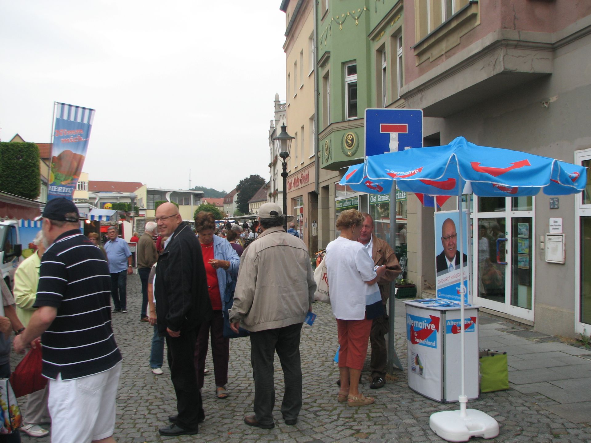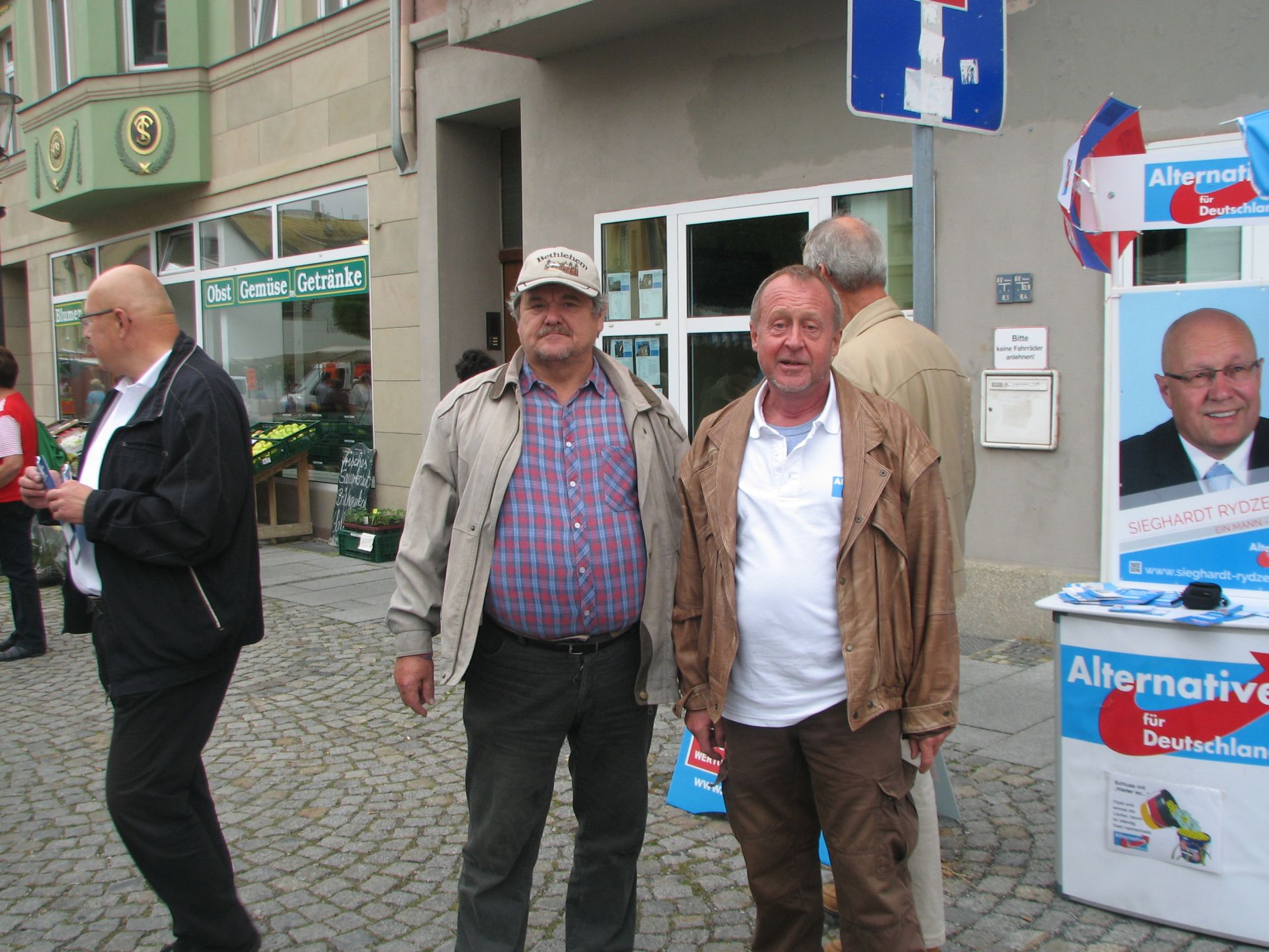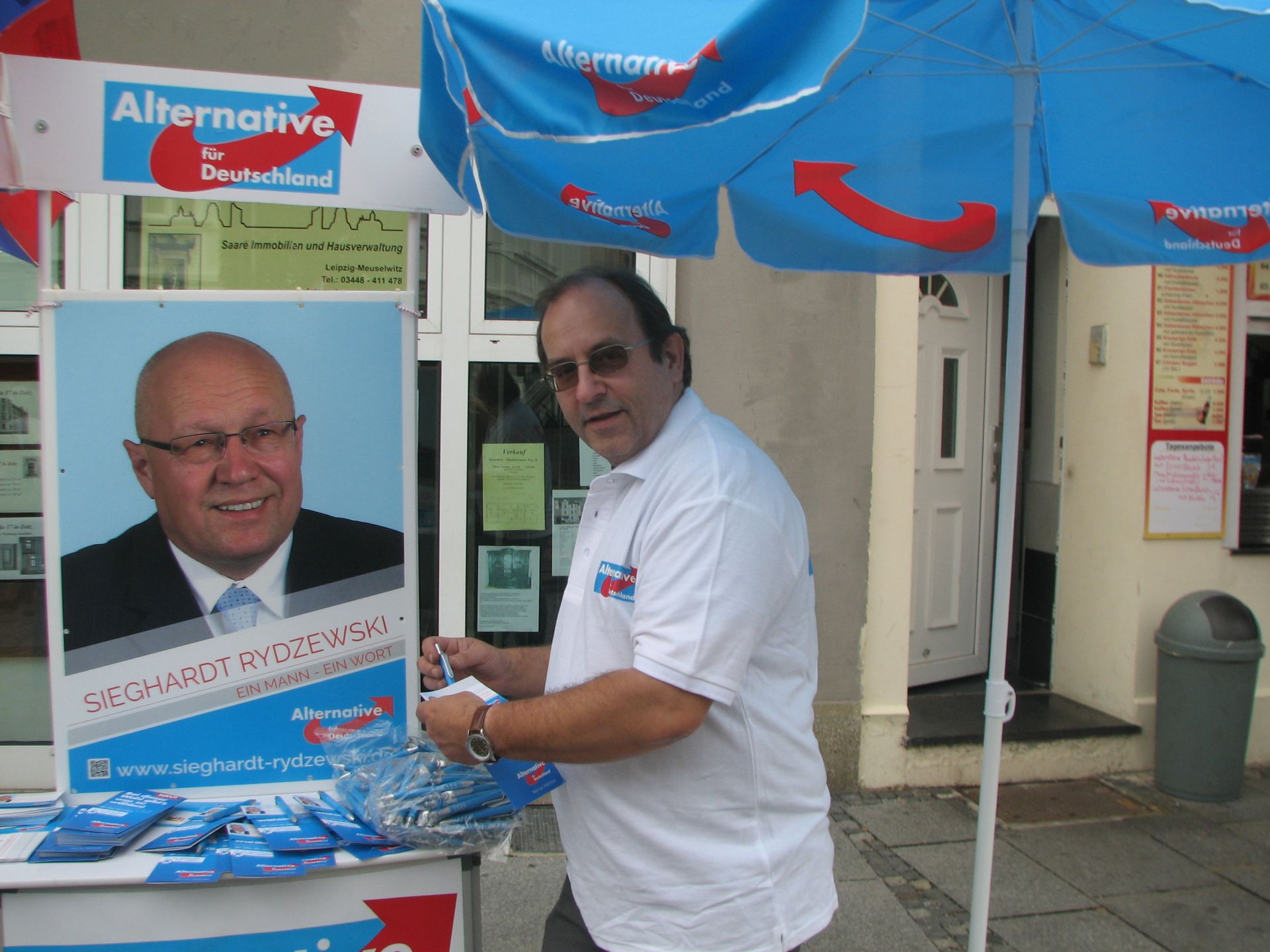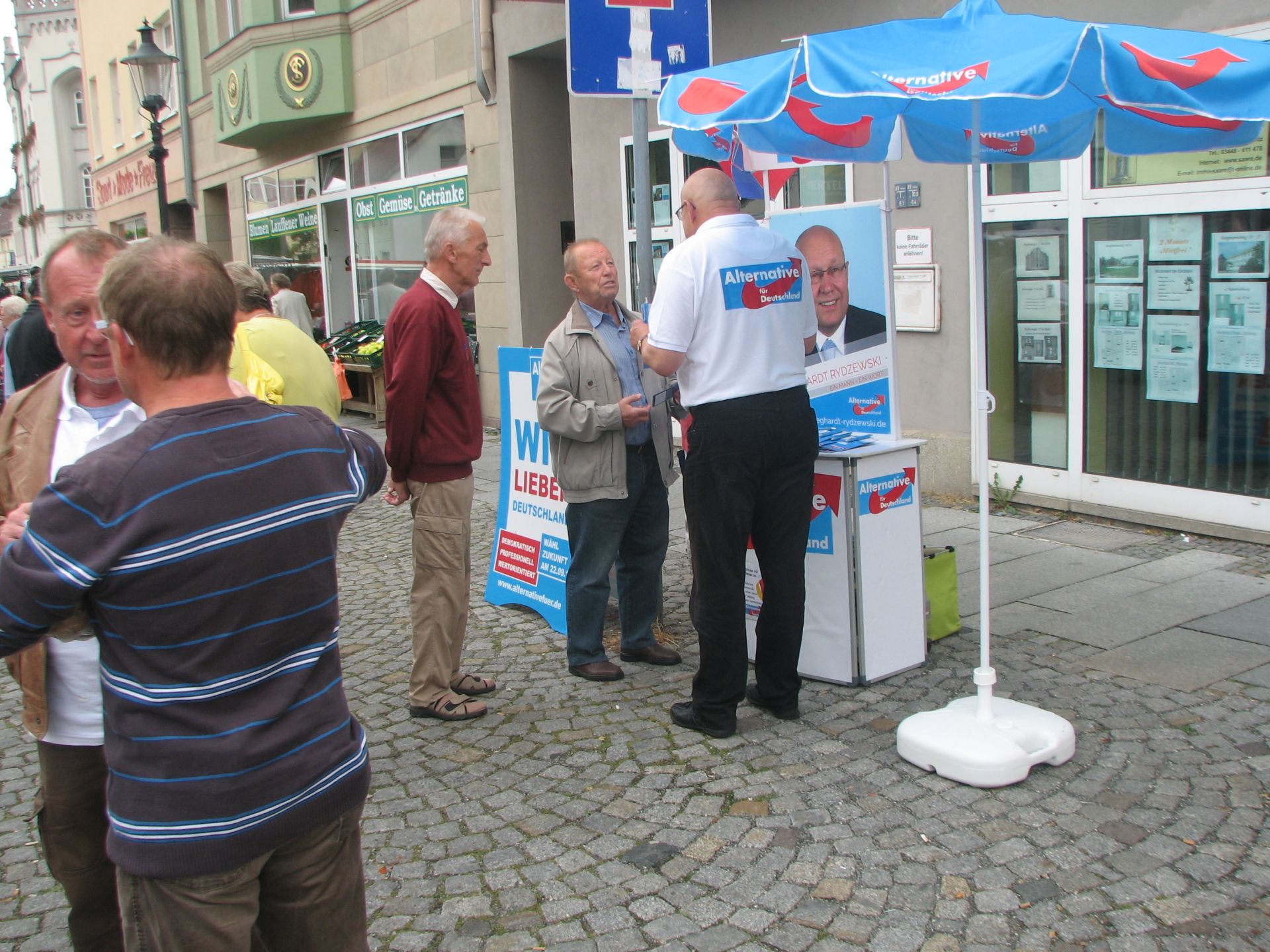 Da dies die Wähler realisiert haben, wurde unser Stand zeilweise regelrecht belagert. Zum Glück waren wir mit Bundestagskandidat Sieghardt Rzdzewski, Jürgen Wittmann, Reinhard Wolf (Ortsgruppe Meuselwitz) und mir gut besetzt. Über 400 verteilte Flyer mit Kuli und Visitenkarten, das hat Spaß gemacht. Sicherlich wollten einige Leute nur den schönen Kugelschreiber, aber der allergrößte Teil der Menschen waren wirklich interessiert.