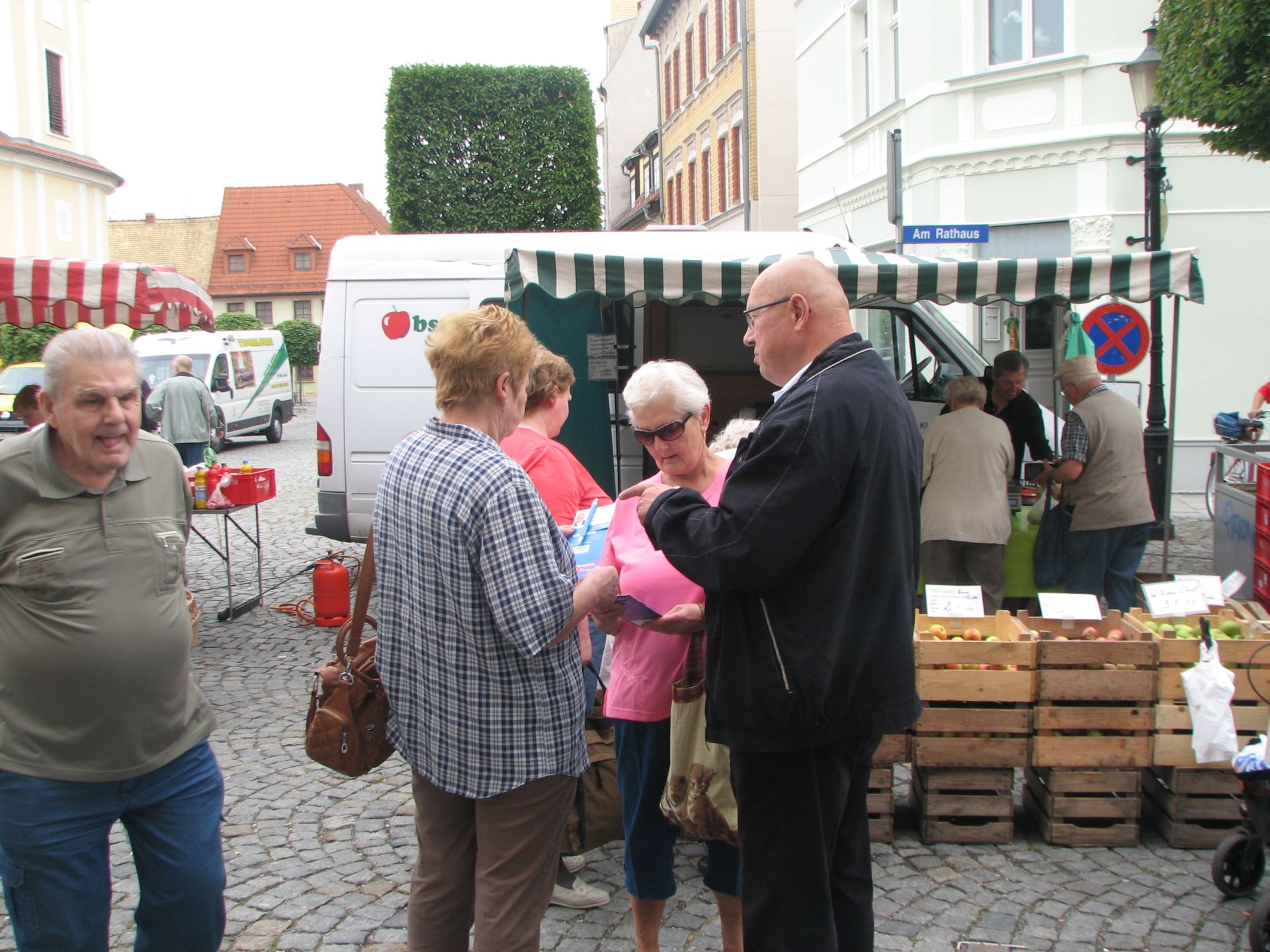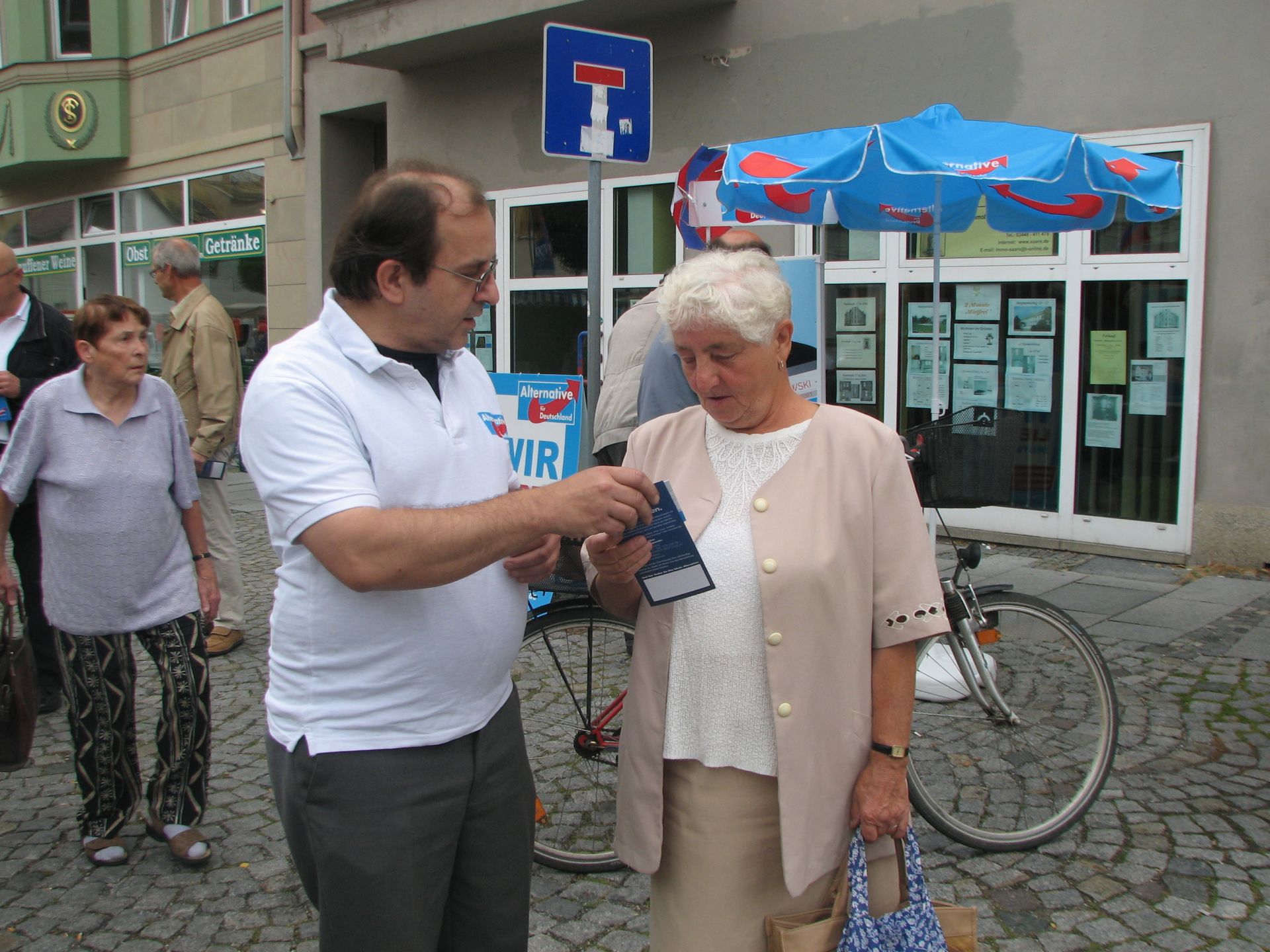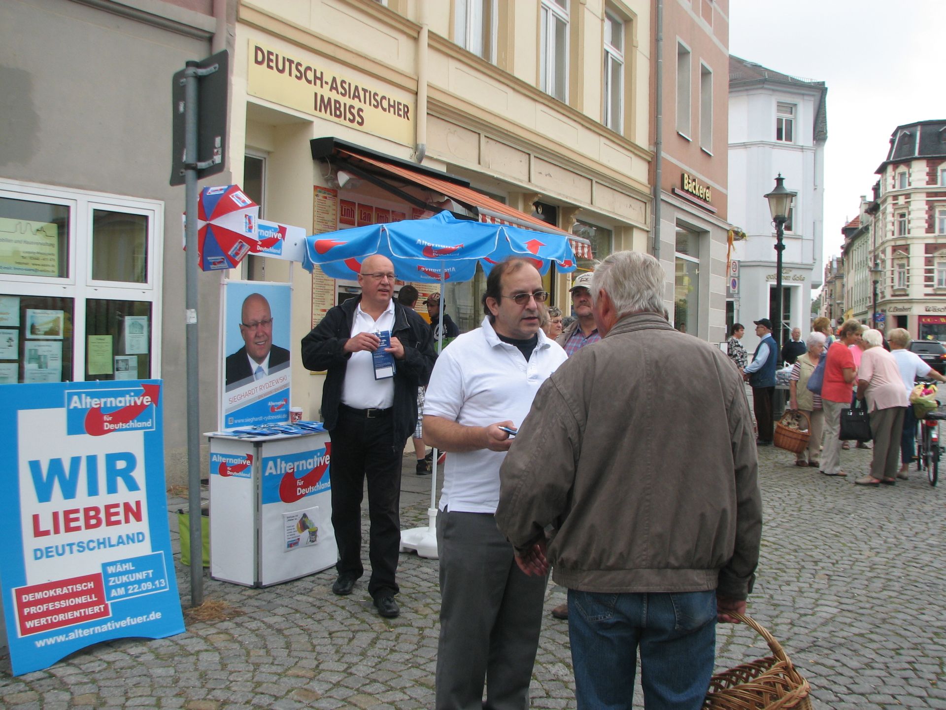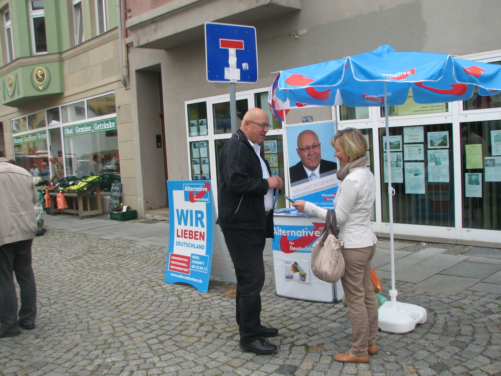 Da dies die Wähler realisiert haben, wurde unser Stand zeilweise regelrecht belagert. Zum Glück waren wir mit Bundestagskandidat Sieghardt Rzdzewski, Jürgen Wittmann, Reinhard Wolf (Ortsgruppe Meuselwitz) und mir gut besetzt. Über 400 verteilte Flyer mit Kuli und Visitenkarten, das hat Spaß gemacht. Sicherlich wollten einige Leute nur den schönen Kugelschreiber, aber der allergrößte Teil der Menschen waren wirklich interessiert.