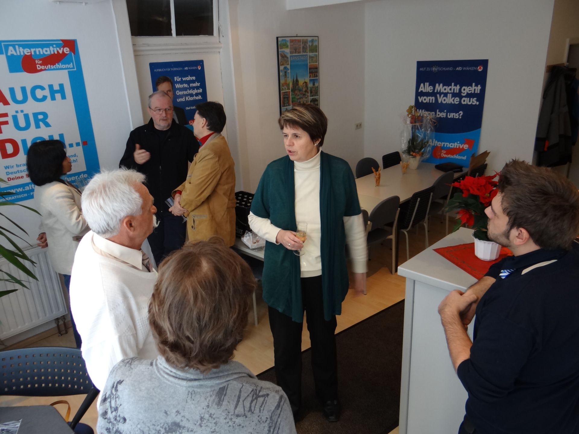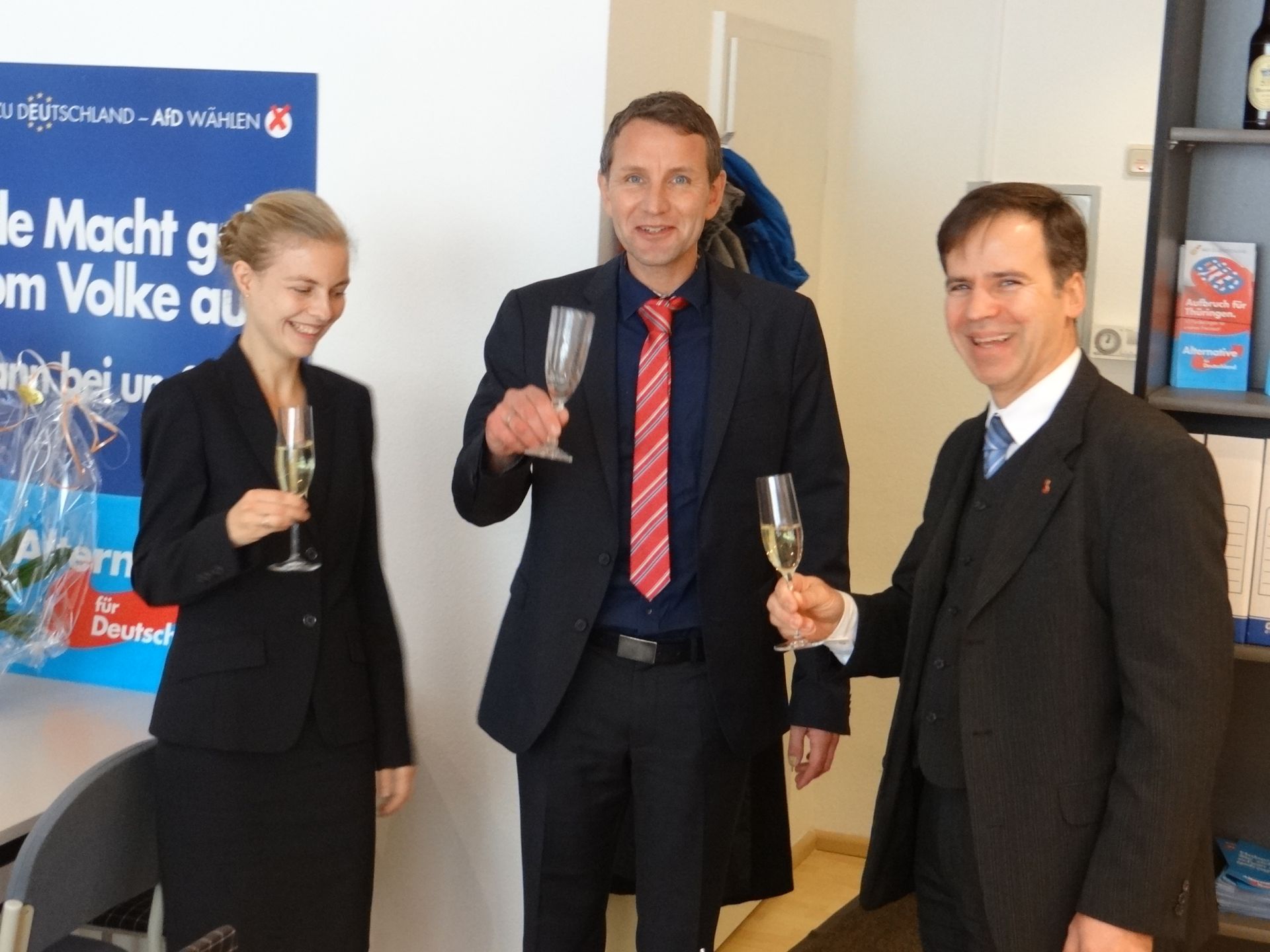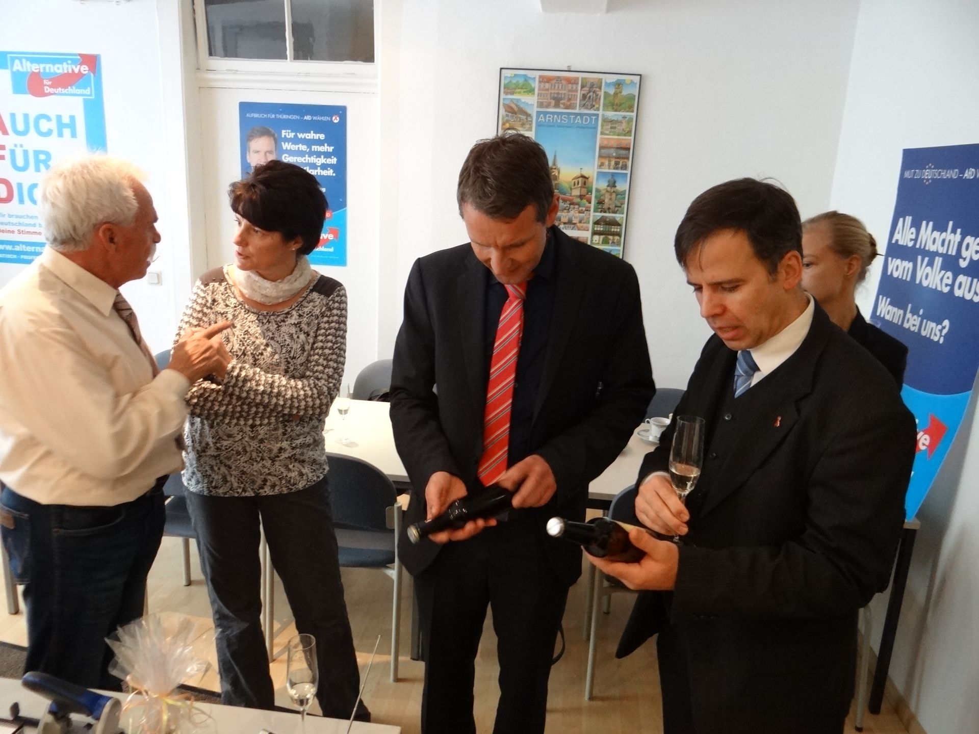 In der frühen Morgenstunde hatten sich zunächst nur drei, vier Mitstreiter, unter ihnen der 1. Sprecher der AfD lmkreis-Gotha, Rüdiger Schmitt, und einige Vorstandsmitglieder eingefunden. Doch schon eine halbe Stunde später gab es in dem gerade mal etwas über 30 qm kleinen Büro keinen Stillstand mehr. Mitglieder, Freunde und Interessierte gaben sich die Klinke in die Hand. Bis auf die letzte Minute sozusagen war das Büro in den Tagen zuvor saniert und eingeräumt worden. Überwiegend mit gebrauchten Möbeln, die auf Vordermann gebracht worden sind. Das trifft auch für die Technik zu, lediglich ein Drucker und ein Telefon wurden nagelneu angeschafft. „Ich kann mich einfach nur bei allen bedanken, die uns bei der Einrichtung des Büros so tatkräftig unterstützt haben“, so Olaf Kießling, der sichtlich gerührt war über all die Glückwünsche. Mitunter wußte man gar nicht, was man zuerst machen sollte. Gratulationen entgegennehmen, mit einem Glas Sekt anstoßen, Kaffee einschenken, sich am Gespräch beteiligen, Fotos machen. Gegen Mittag wurde die Überraschung komplett, denn Björn Höcke, Fraktionsvorsitzender und 1. Sprecher Thüringen, ließ es sich nicht nehmen, vom Start des „Corsa“ bei Opel Eisenach kommend, Fraktionskollegen Olaf Kießling persönlich zur Eröffnung zu beglückwünschen. Mit Wiebke Muehsal und Birgit Noll weilten auch zwei weitere Fraktionskollegen und Mitglieder des Landesvorstandes unter den Gratulanten. Dazu kamen weitere Mitglieder und Freunde wie z.B. Matthias Glock mit Gattin. Sie spendeten einen Kasten AfD-Bier und Pralinen dazu. Vorstandsmitglied Ines Deckert überraschte alle mit einem selbstgebackenen Quarkstollen, der am Nachmittag des Tages sich dem Ende neigte – so wie die Eröffnung auch. Die Gäste kamen übrigens nicht nur aus Arnstadt sondern aus der gesamten Umgebung. Wie z.B. René Casta aus Waltershausen, Birgit Noll aus Floh-Seligenthal und natürlich aus den umliegenden Ortschaften.