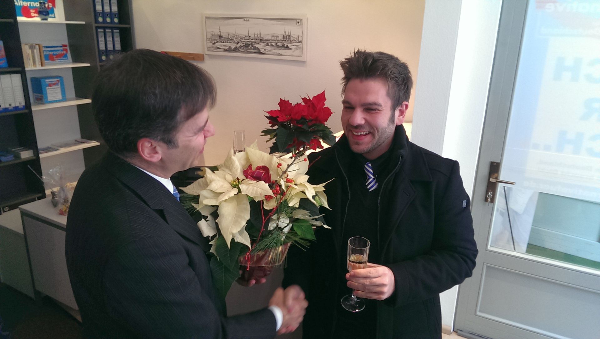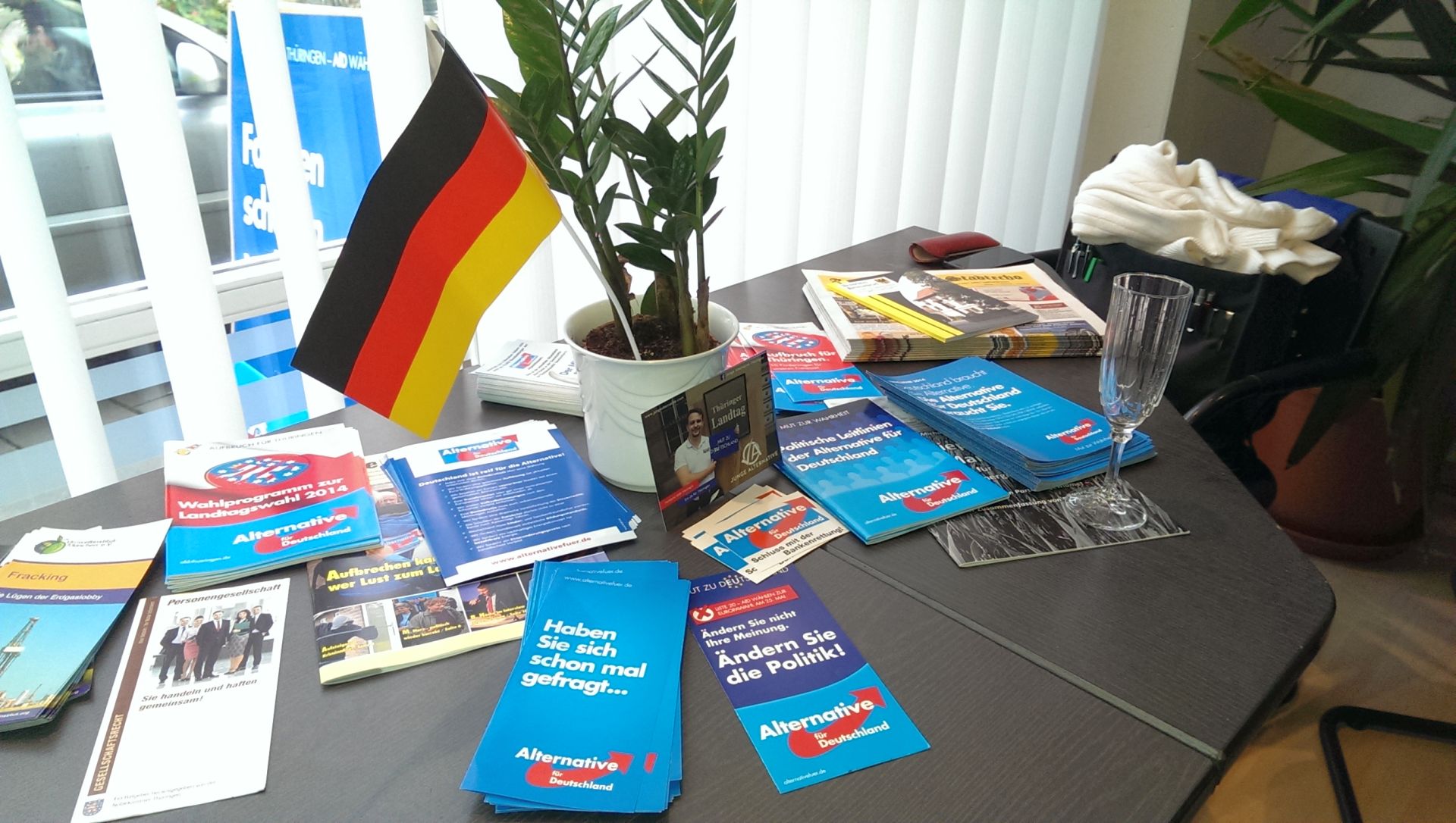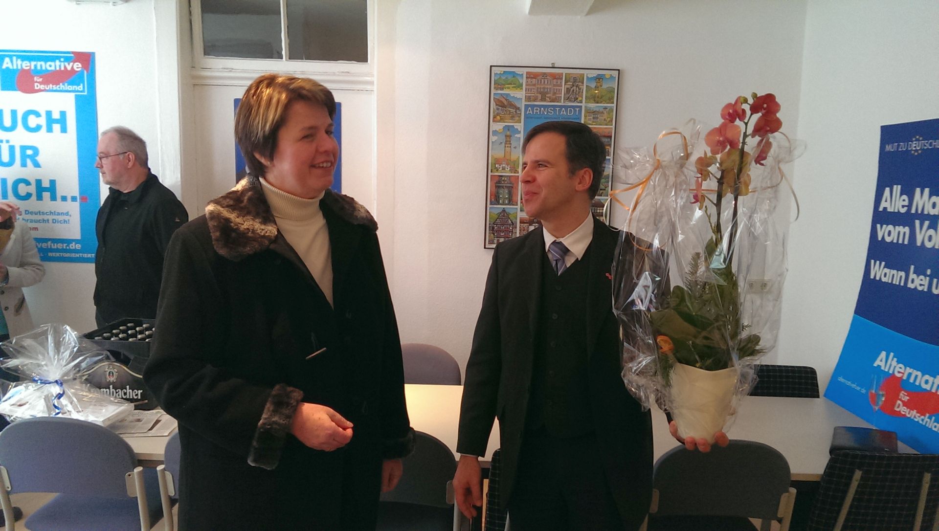In der frühen Morgenstunde hatten sich zunächst nur drei, vier Mitstreiter, unter ihnen der 1. Sprecher der AfD lmkreis-Gotha, Rüdiger Schmitt, und einige Vorstandsmitglieder eingefunden. Doch schon eine halbe Stunde später gab es in dem gerade mal etwas über 30 qm kleinen Büro keinen Stillstand mehr. Mitglieder, Freunde und Interessierte gaben sich die Klinke in die Hand. Bis auf die letzte Minute sozusagen war das Büro in den Tagen zuvor saniert und eingeräumt worden. Überwiegend mit gebrauchten Möbeln, die auf Vordermann gebracht worden sind. Das trifft auch für die Technik zu, lediglich ein Drucker und ein Telefon wurden nagelneu angeschafft. „Ich kann mich einfach nur bei allen bedanken, die uns bei der Einrichtung des Büros so tatkräftig unterstützt haben“, so Olaf Kießling, der sichtlich gerührt war über all die Glückwünsche. Mitunter wußte man gar nicht, was man zuerst machen sollte. Gratulationen entgegennehmen, mit einem Glas Sekt anstoßen, Kaffee einschenken, sich am Gespräch beteiligen, Fotos machen. Gegen Mittag wurde die Überraschung komplett, denn Björn Höcke, Fraktionsvorsitzender und 1. Sprecher Thüringen, ließ es sich nicht nehmen, vom Start des „Corsa“ bei Opel Eisenach kommend, Fraktionskollegen Olaf Kießling persönlich zur Eröffnung zu beglückwünschen. Mit Wiebke Muehsal und Birgit Noll weilten auch zwei weitere Fraktionskollegen und Mitglieder des Landesvorstandes unter den Gratulanten. Dazu kamen weitere Mitglieder und Freunde wie z.B. Matthias Glock mit Gattin. Sie spendeten einen Kasten AfD-Bier und Pralinen dazu. Vorstandsmitglied Ines Deckert überraschte alle mit einem selbstgebackenen Quarkstollen, der am Nachmittag des Tages sich dem Ende neigte – so wie die Eröffnung auch. Die Gäste kamen übrigens nicht nur aus Arnstadt sondern aus der gesamten Umgebung. Wie z.B. René Casta aus Waltershausen, Birgit Noll aus Floh-Seligenthal und natürlich aus den umliegenden Ortschaften.