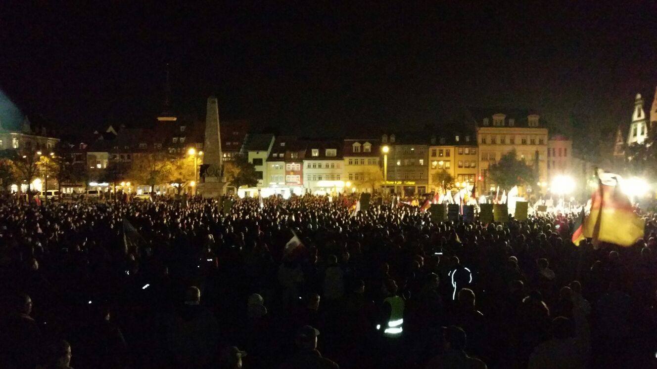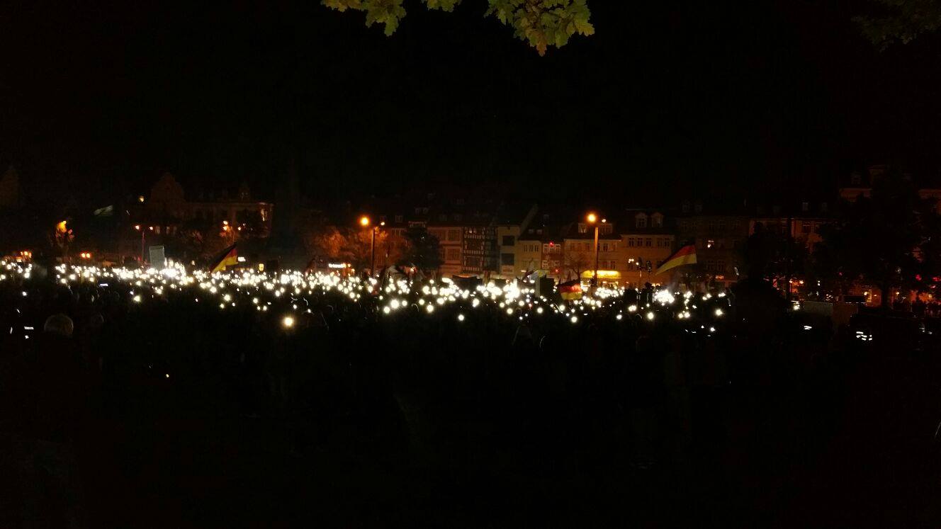 Mehrere Tausend Menschen sind gestern trotz massiver Einschüchterungs- und Diffamierungsversuchen von Politikern, Kirchen und Verbänden nach Erfurt gekommen um gegen die planlose Asylpolitik von Landes- und Bundesregierung zu protestieren. Die Kundgebung verlief friedlich trotz der massiven Anfeindungen und Bedrohungen aus dem linksextremistischen Bereich.