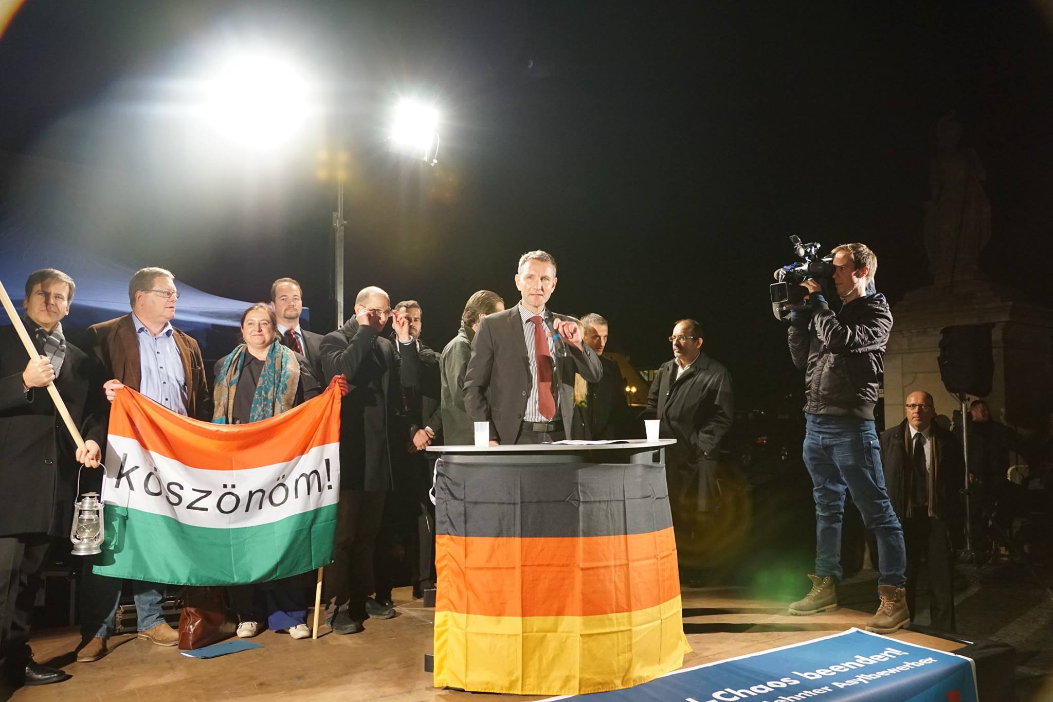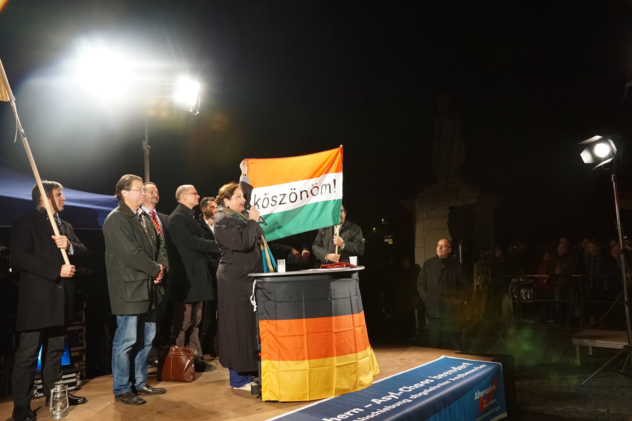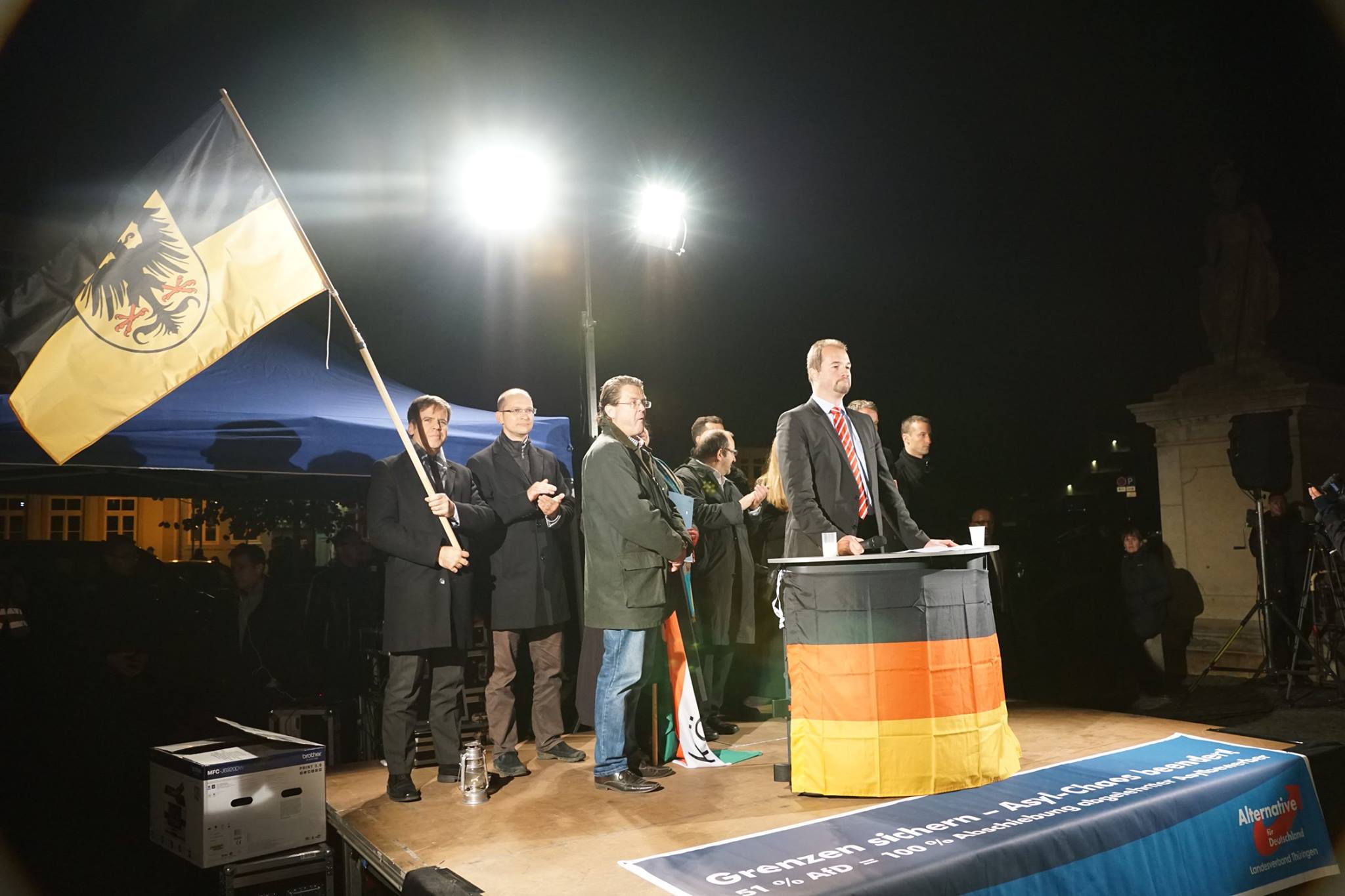 Björn Höcke, Landesvorsitzender der AfD in Thüringen, sprach den Bürgern Mut zu weiterhin gegen die Fehlentwicklungen in der Asylpolitik Stellung zu beziehen und weiterhin auf die Straße zu gehen, ohne sich von der Meinungsdiktatur beirren zu lassen. In Richtung des thüringischen Justiz- und Migrationsministers Dieter Lauinger, der die Bevölkerung in Missbrauchs seines Amtes dazu aufgefordert hatte, nicht an der Kundgebung teilzunehmen sagte Höcke: „Herr Lauinger, Sie haben wie Merkel, Gabriel und Maas die Neutralitätspflicht verletzt. Statt dem Volk zu dienen, stellen Sie sich gegen einen Teil des Volkes. Sie polarisieren, nicht wir. Sie spalten unsere Bevölkerung! Auf unserer Demonstration werden keine Menschen ausgegrenzt. Wir sind weltoffen und keine Ausländerfeinde. Wir sind aber – was eine Selbstverständlichkeit in jedem anderen Land ist – inländerfreundlich. Ich stehe nun zum ersten Mal in meinem Leben mit einer schusssicheren Weste auf einer Bühne, Ihr wisst was das heißt. Versprechen wir uns: Wir verzagen nicht. Hier ist Deutschland, hier ist Europa. Mögen sie eine gute Zukunft haben in Einigkeit und Recht und Freiheit!“