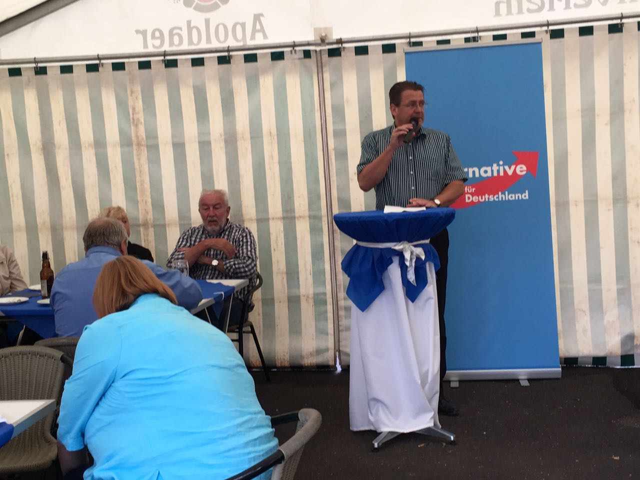 Sozusagen als krönenden Abschluss hielten Dr. Robby Schlund und MdL Stephan Brandner ihre Reden. Für beide, Robby Schlund, der für den Wahlkreis 194, Gera-Greiz-Altenburger Land als Direktkandidat für die Bundestagswahl kandidiert, und für Stephan Brandner, Thüringer Spitzenkandidat zur Bundestagswahl, der in Gera wohnt und sein Bürgerbüro betreibt, natürlich ein „Heimspiel“. Robby Schlund sprach die Schwierigkeiten des ländlichen Raums in Ostthüringen an und sprach sich für die Unterstützung der Landwirtschaft aus. Stephan Brandner nahm sich unter anderem in gewohnt spritziger Rhetorik die GEZ-Medien vor. Er berichtete von Bürgergesprächen, bei denen die Frage im Raum steht, „Warum AfD wählen?“ Wo man doch nicht genau wisse, ob es die AfD „könne“. „Stimmt“, sagt Brandner. Aber dass es die Anderen nicht können ist dokumentiert, warum also nicht der AfD die Chance geben?