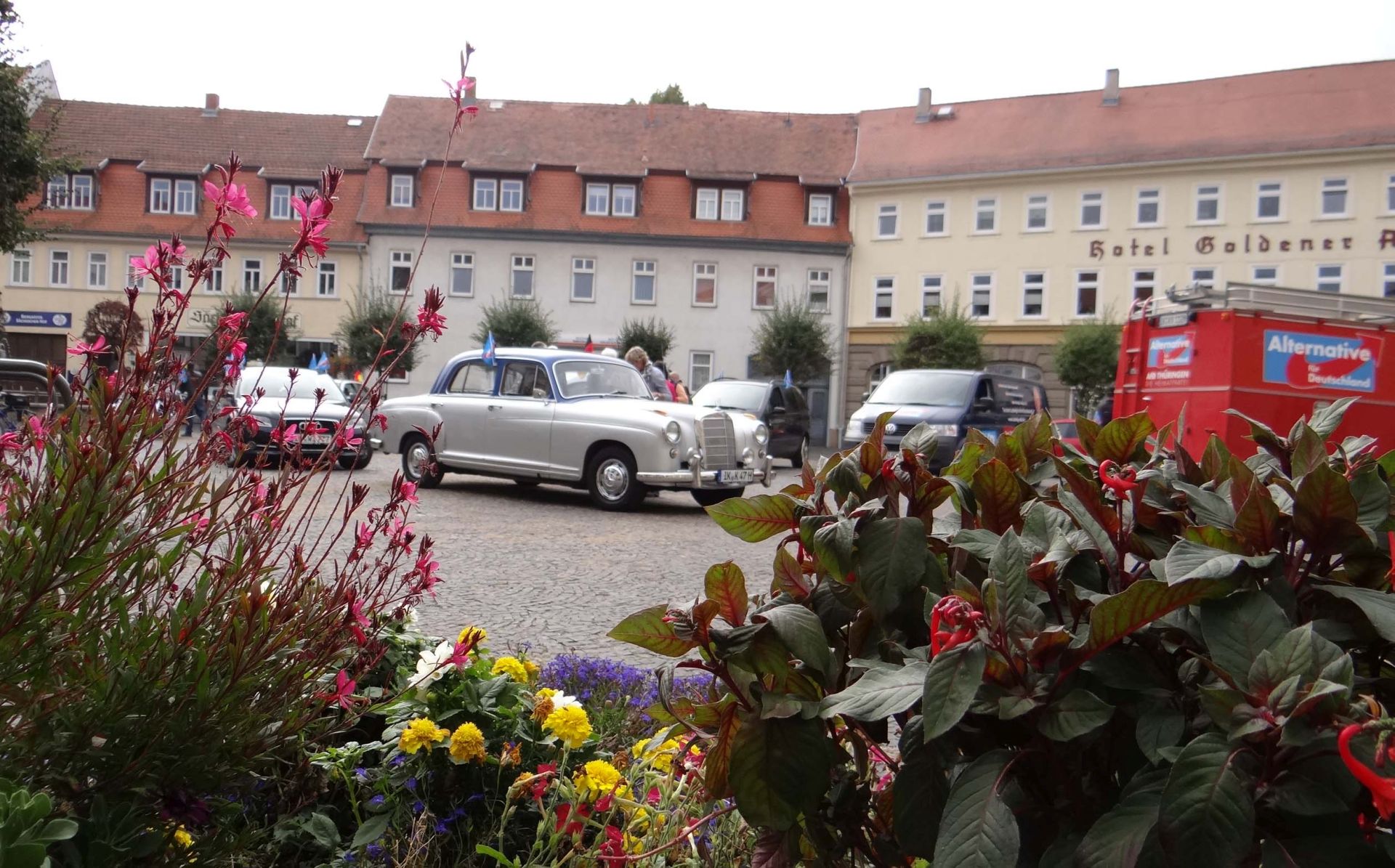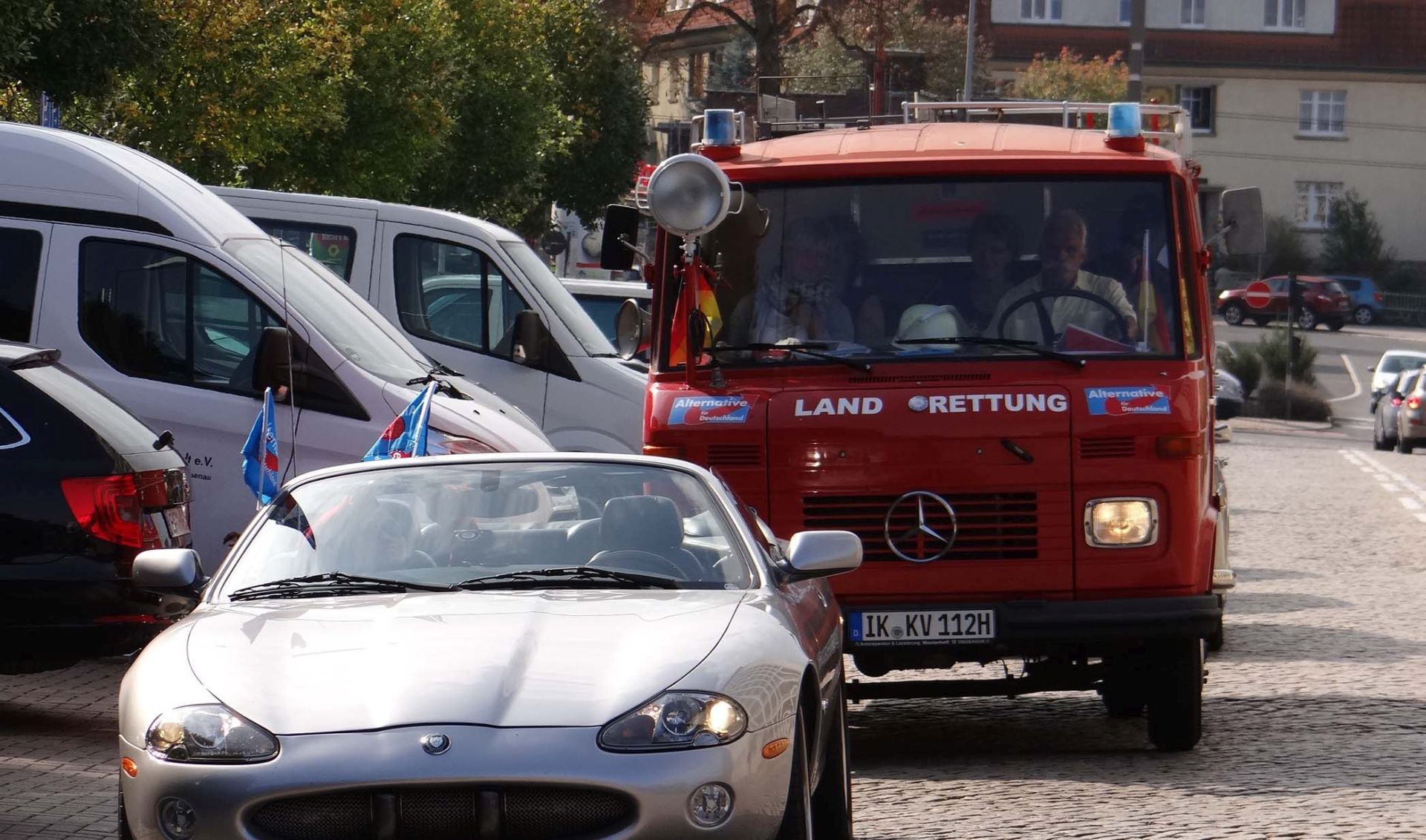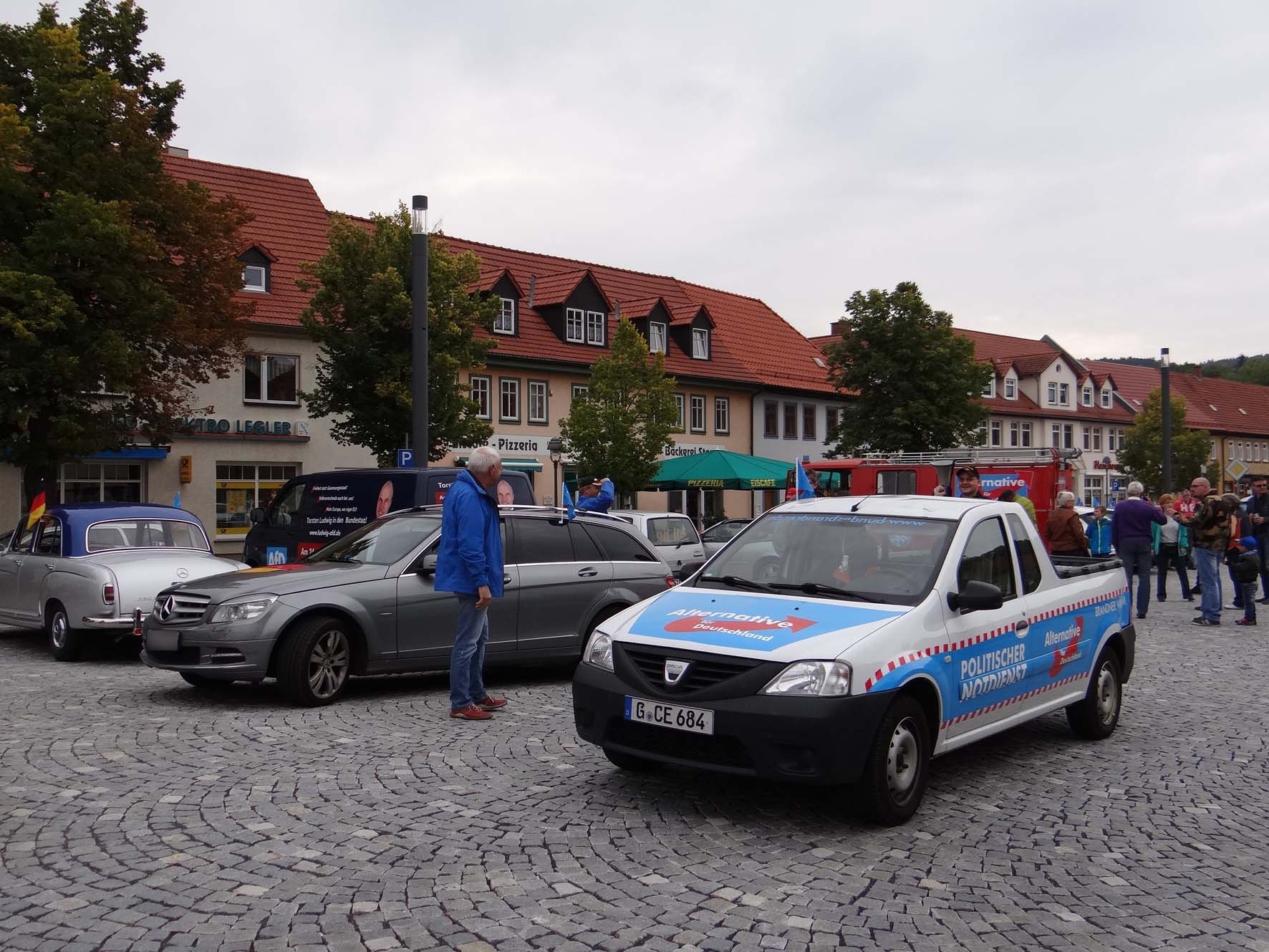 ARNSTADT, 23. September. Hammerecke am Wollmarktsplatz. Es ist 9.30 Uhr, als die ersten Fahrzeuge für die letzte Aktion vor der Bundestagswahl auf den traditionsreichen Platz nahe des alten Fischtores der Kreisstadt Aufmerksamkeit bei vorüberfahrenden Fahrzeugen erzeugen. Die rote „Landrettungsfeuerwehr“, gesteuert von Rüdiger Schmitt, ist einfach ein Hingucker. Einer nach dem anderen Teilnehmer rollt mit seinem Fahrzeug auf den Platz. Es ist Samstag und nur noch wenige Stunden trennen Deutschland von der historischsten Wahl seit der Wiedervereinigung oder der Vereinnahmung, wie manche sagen. Das Jahr 2017 steuert merklich auf den gesellschaftlichen Höhepunkt zu. Im Kreisverband Ilmkreis-Gotha wurde diese Fahrt in den Herbst kurz entschlossen organisiert.