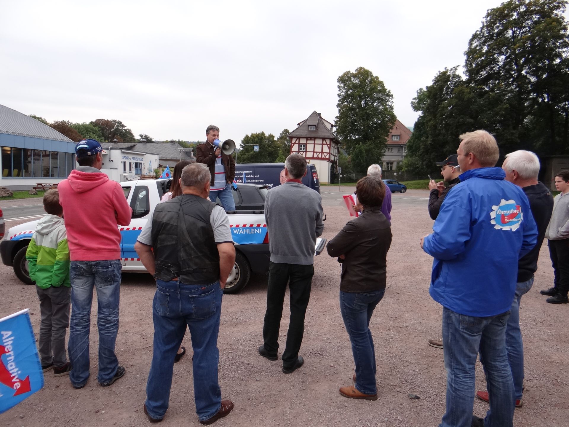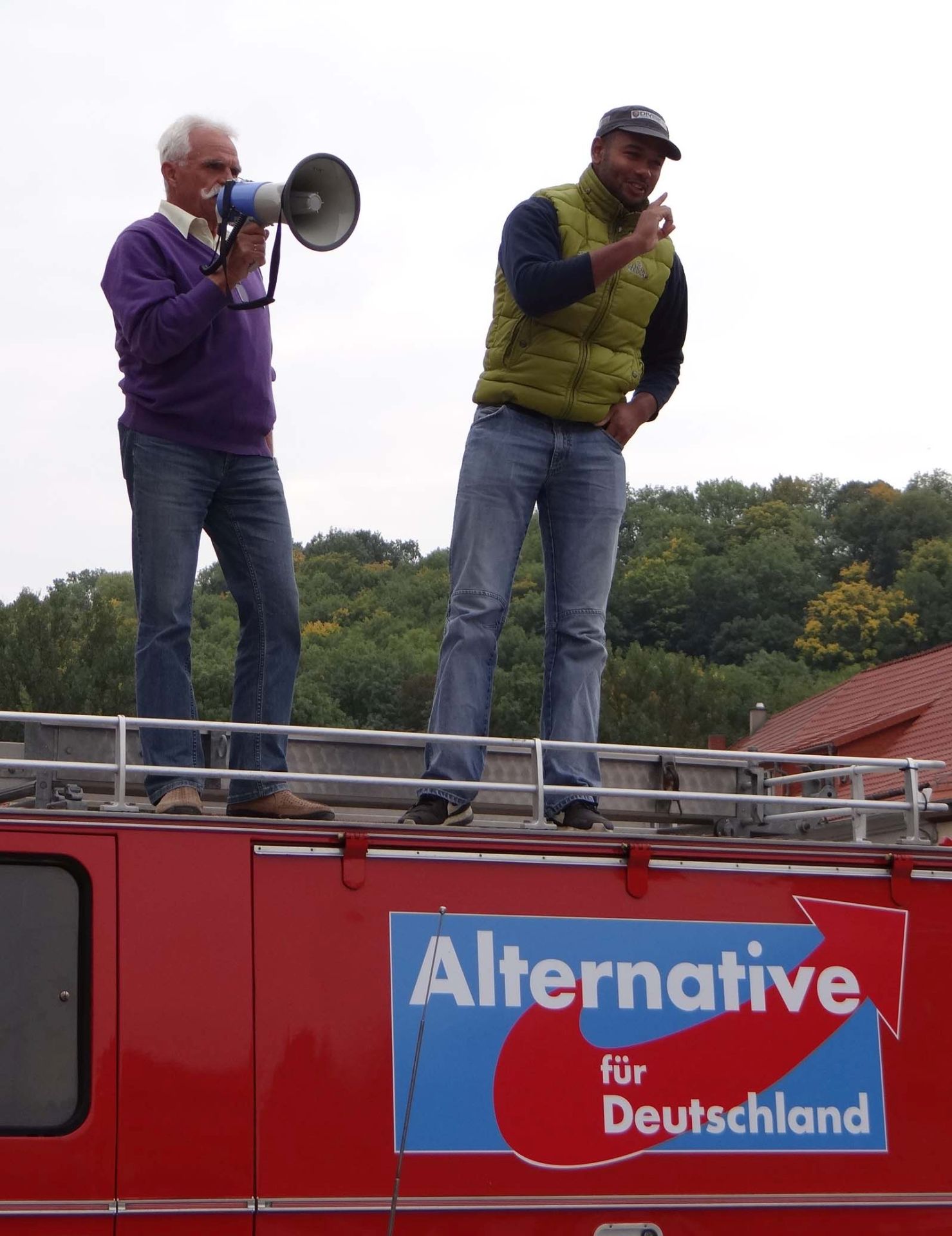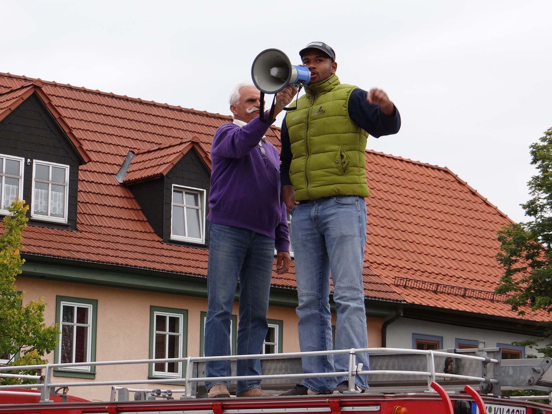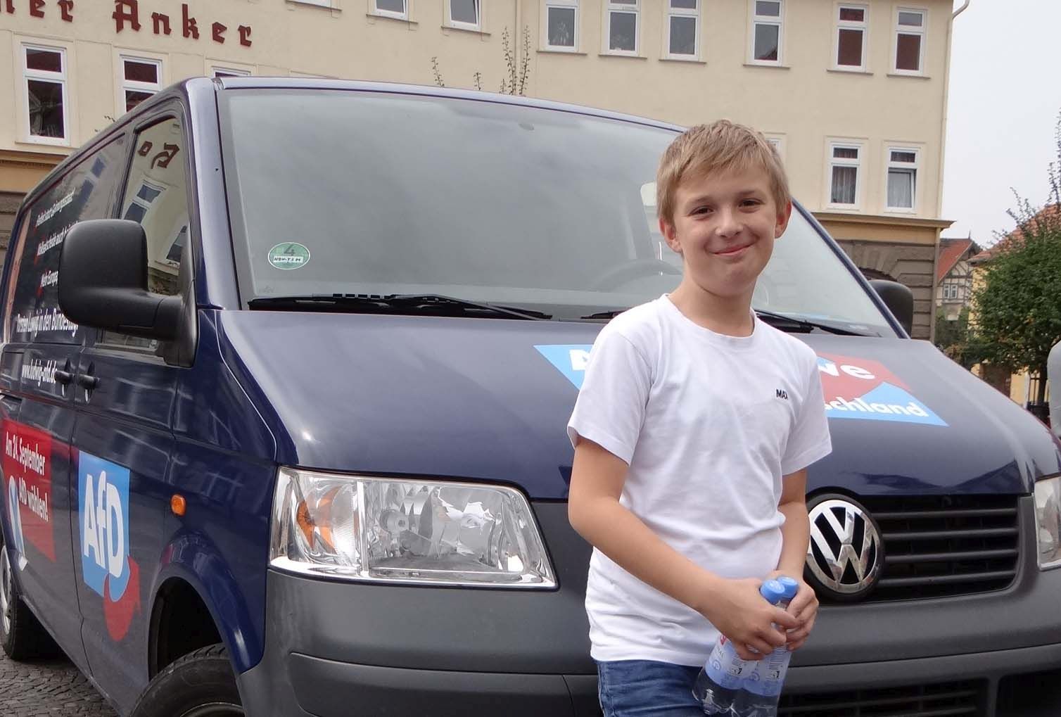 Beim ersten Halt in Stadtilm klettern Rüdiger und Daniel – unser schwarzer Freund aus Ichtershausen – aufs Dach der Feuerwehr. Daniel liebt Deutschland und er redet seine erste Rede. Vorsichtig und dann anschwellend. „Der Islam gehört nicht zu Deutschland – und wir wollen die hier nicht haben!“ Ja, die Terroristen müssen wir in den Griff bekommen und aus Deutschland befördern. Mit dieser Kanzlerin aber wird das nicht gehen! Ein Arbeiter schaut uns fragend an: „Wo haben sie Euch denn rausgelassen? Ihr gehört doch gar nicht hierher?“ War das jetzt ernst gemeint? Nicht wirklich. Eine nicht ernst zu nehmende Frage. Da ist die Zeit zu knapp für eine Bekehrung. Es ist wirklich der einzige Fall von Engstirnigkeit auf dieser Fahrt durch das wunderschöne, frühherbstliche Thüringer Land. Auf der ganzen Fahrt gehen die Lichthupen an, recken sich die Daumen hoch, winken Männer und Frauen am Straßenrand. Nicht jeder, das weiß Gott nicht. Wir wollen nicht übertreiben. Doch die Zustimmung ist nicht zu übersehen und zu überhören. Das ist die Wahrheit. So wie unser jüngster Teilnehmer auch nicht zu überhören ist. Das Megaphon hat es ihm angetan. Max Graf, Sohn von Falko Graf, der zum Wahlkampfteam Ludwig gehört, scheint vernarrt in den Spruch zu sein: „Merkel muß weg!“ Doch er läßt auch den Ruf erschallen: „Wählt die AfD! Denkt an uns Kinder!“ Und er wird nicht müde dabei. Was für ein Hoffnungsträger! Einmal sagt er sogar: „Ich würde gern Bundeskanzler werden!“ Meine Güte, das müssen wir uns merken! Also lieber Max, Dir gehört unser ganzer Dank! Das sei gleich hier gesagt.