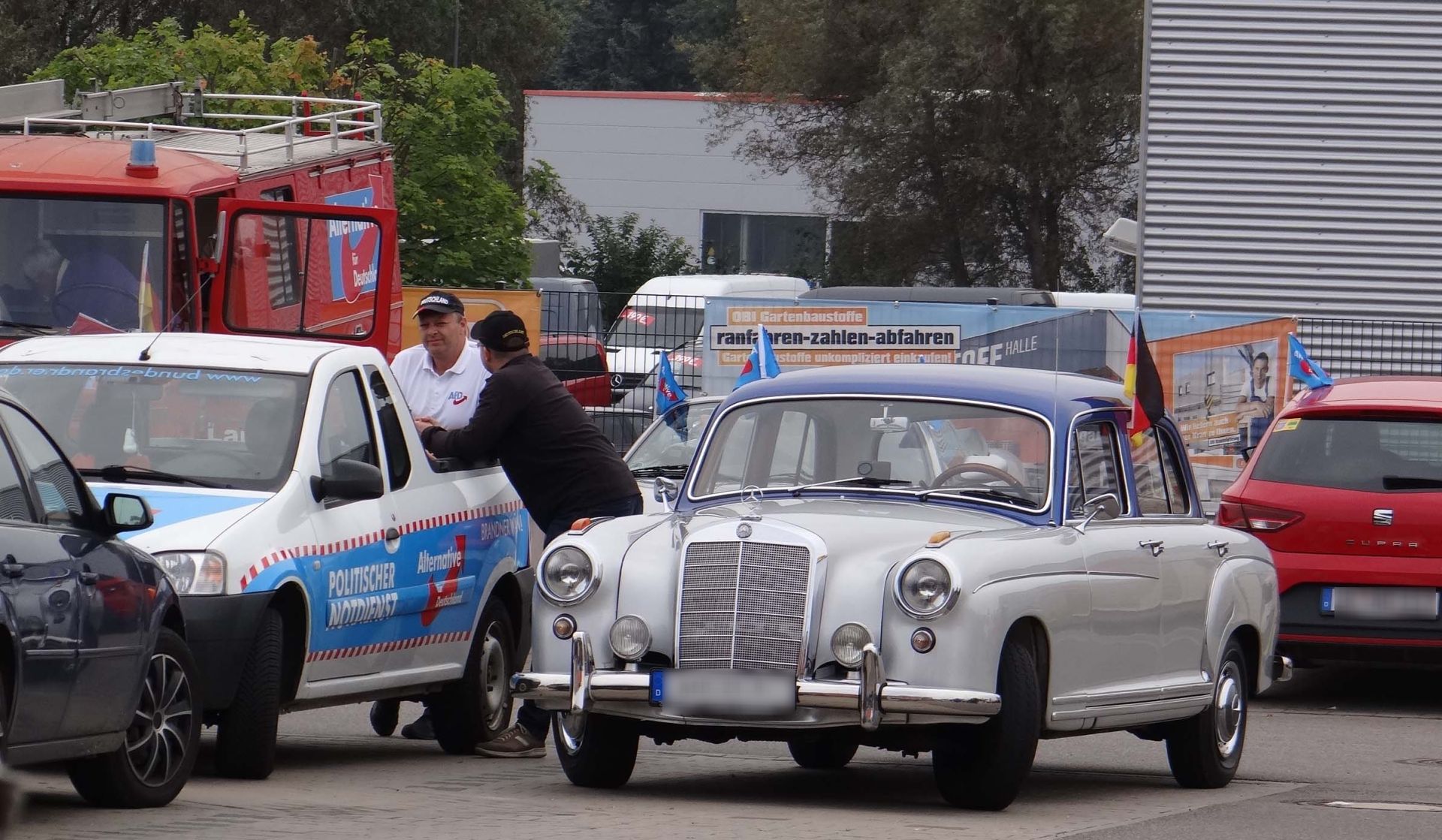 „Warum sollen wir heute irgendwo noch zwei Infostände aufbauen, wenn wir durch diesen Fahrzeugkonvoi viel mehr Aufmerksamkeit erzeugen können?“ Eine berechtigte Frage von Marcus Bühl, Mitglied im Vorstand und Listenkandidat, Platz 3. In den letzten Tagen hat er, haben wir alles gegeben. Infostände in Arnstadt und Ilmenau, Tagesausfahrten mit der alten Benz-Oltimerfeuerwehr, …zig Gespräche an den Ständen. Plakate haben wir nachgehangen, die heruntergerissen wurden oder stark beschädigt waren, Flyer und die „Thüringenpost“ in die Briefkästen verteilt. Es wollte kein Ende nehmen. Auf diese Fahrt freuen sich alle. Erst zwei Tage ist es her, als Björn in Arnstadt in der „Goldenen Henne“ auftrat, immer wieder unterbrochen von Höcke-Rufen und nicht enden wollenden Applaus. Doch das ist eine andere Geschichte. An diesem Morgen hat sich bei vielen die Hoffnung eingestellt. Die Route streift viele Gemeinden. Als Matthias Glock, er ist als Führungsfahrzeug in seinem Jaguar, eingeteilt, die Route und die Regeln bekannt gibt, gibt es leichtes Staunen. Sogar nach Erfurt soll es gehen? „Damit die Erfurter Buffbohnen auch mal rot und blau geeint sehen können“, sagt einer in der Runde und alles lacht. Irgendwann wird uns die Stadt ohnehin gehören, da sind sich viele sicher. Also – los gehts. Arnstadt, Marlishausen, Stadtilm – hier wird erstmals auf dem neu gestalteten Marktplatz samt dem sanierten Albert Methfessel-Denkmal ein blaues Lüftchen wehen. Dann gehts weiter durch Griesheim, Bücheloh, Ilmenau. Von der UNI-Stadt geht die Fahrt nach Elgersburg, Geschwenda, Gräfenroda, Frankenhain, Crawinkel Richtung Ohrdruf. Vor dem dortigen Rathaus wird ein weiterer kurzer Halt eingelegt. Von Ohrdruf gehts nach Schwabhausen und dort auf den Parkplatz des OBI-Baumarktes. Aus gutem Grund. Dort gibt es einen Bratwurststand, es gibt Kaffee und Gebäck – und Kundentoiletten! Was es nicht gibt – es gibt kein Gepöbele, dafür freundliche Blicke und Gesten, so wie auf der ganzen Fahrt. Danach wird die Wahlfahrt fortgesetzt. Wechmar, Wandersleben, Apfelstädt, Neudietendorf, Ingersleben, Stedten, Bischleben und letzlich Erfurt-Zentrum.Was für eine Tour! Da heißt es nicht bummeln. Der rote Benz mag es gemütlicher, 60 vielleicht bergab 70 Sachen. Wenn wir zum Kaffee zuhause sein wollen, muß es rollen. Und es rollt. Auch wenn wir durch den normalen Verkehr und roten Ampeln mitunter getrennt werden, wir kommen immer wieder zusammen.