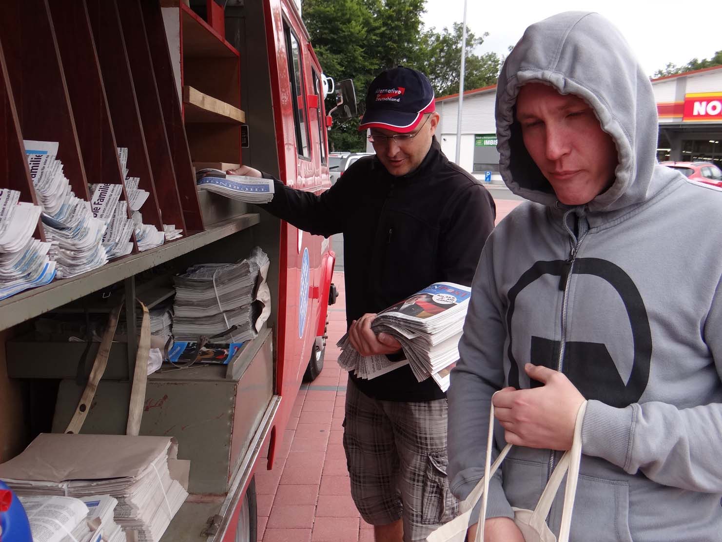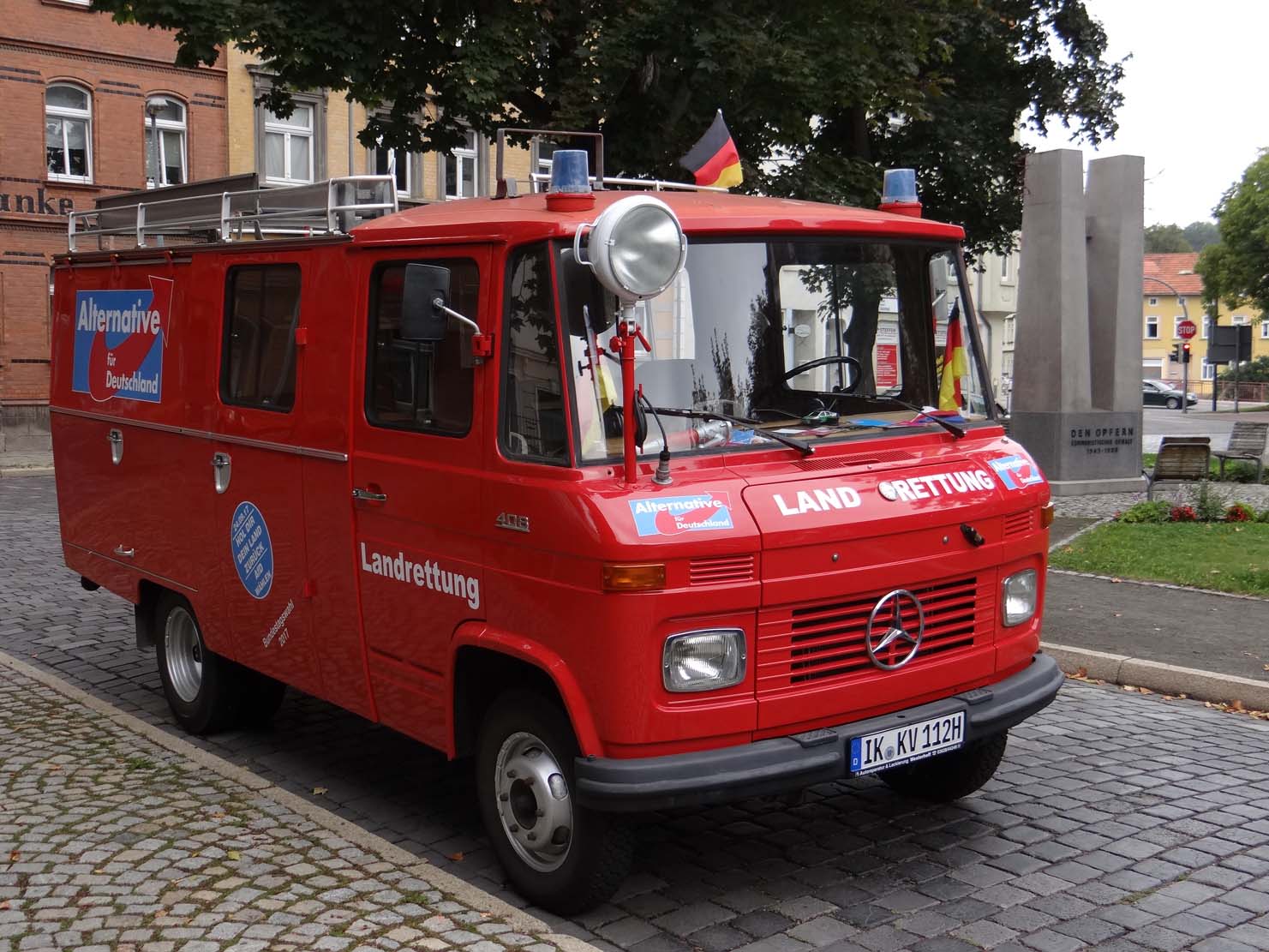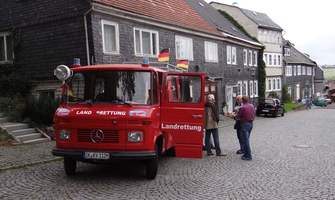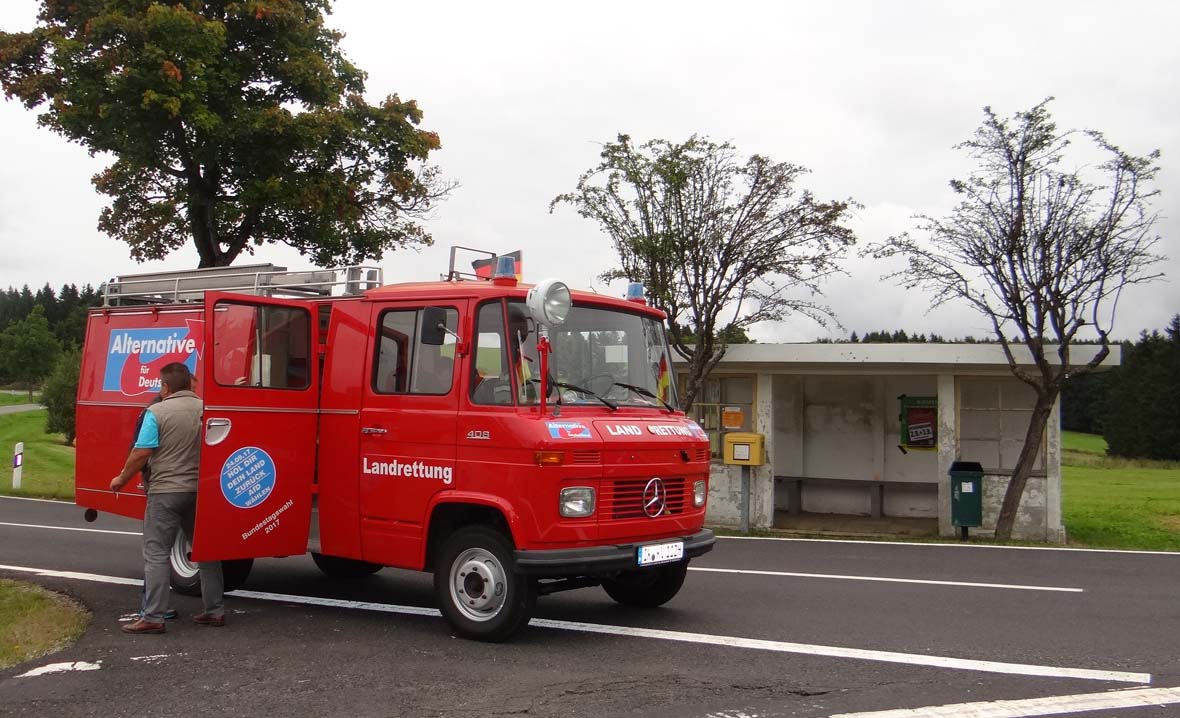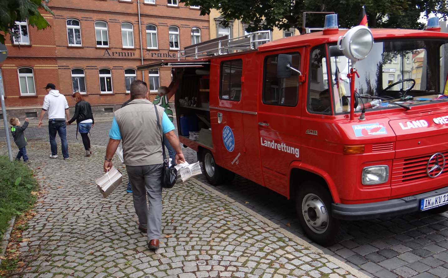 ILMKREIS. Seit dem 1. Mai ist sie offiziell im Einsatz: Die Feuerwehr der Marke Daimler Benz, Baujahr 1969, 2,2 Liter-Maschine, Benzin, 63 PS, die unser AfD-Kreisverband 2016 erwarb. Eine längere und tolle Geschichte, die wir an anderer Stelle noch einmal erzählen müssen. An diesem 1. September 2017 denke ich daran, daß dieser Tag einst als Weltfriedenstags geehrt wurde. Heute kam erwähnt. Da scheint Absicht dahinter zu stecken. Deutsche Panzer üben an der russischen Grenze Krieg. Seit in der Ukraine der rechtmäßige Präsident mit 5 Milliarden US-Dollar weggeputscht worden ist und die Marionettenregierung durch den Volksentscheid die Kriminsel verloren hat, will dort keine Ruhe einkehren. Die Rußlandsanktionen verschärfen die Situation, auch die so manchen deutschen Unternehmens. Wir als AfDler wollen das so nicht. Wir wollen Frieden mit Rußland und daß Putin in die europäischen Prozesse eingebunden wird. Das geht mir so durch den Kopf, als wir an diesem Weltfriedenstag in der Nähe des Denkmals für die Opfer den Kommunismus unsere rot leuchtende Feuerwehr mit Werbematerial bestücken. An diesem Freitagvormittag wird schon das Arnstädter Stadtfest vorbereitet. Die Zufahrtsstraße zu unserem Büro als auch zum Büro von Olaf Kießling sind für jeden Verkehr gesperrt. Da heißt es die schweren Zeitungsbündel unserer „Thüringenpost“ hunderte Meter heranzuschleppen. Der erste Akt. Das Wetter spielt zum Teil mit – es regnet nicht. Aber es ist kalt, ohne Jacke geht gar nicht. Macht nichts. Wir sind zunächst zu sechst. Rüdiger Schmitt am Steuer, Marcus Bühl als Beifahrer, Gerhard Radoi, Kerstin Schmalz, Hans-Joachim Munsche und meine Wenigkeit finden Platz auf den zwei Bänken hinter den Fahrersitzen.