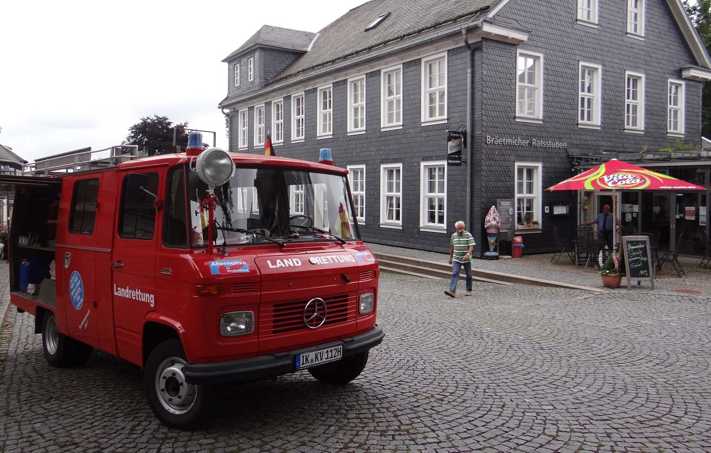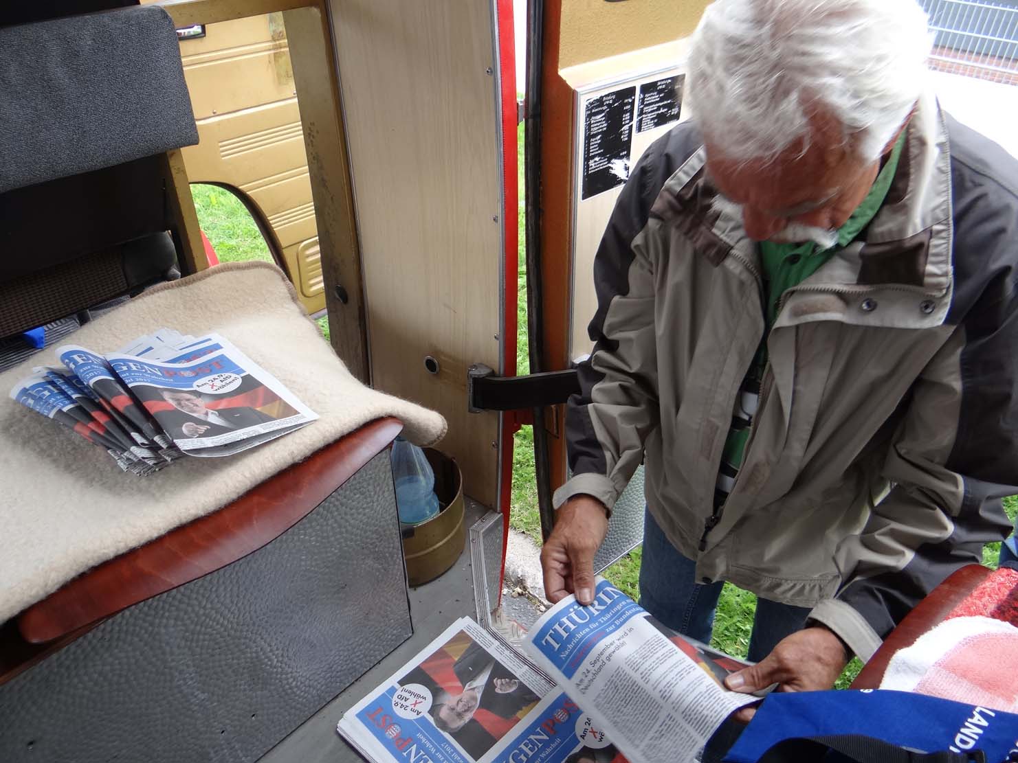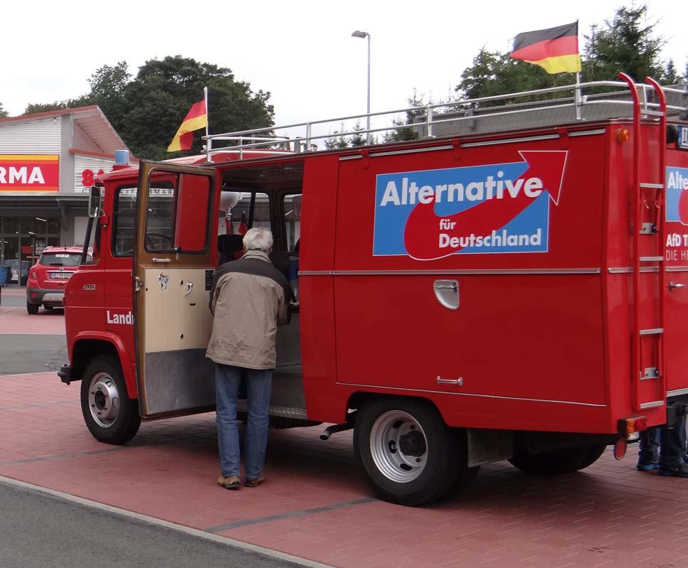 „Ich versuche stets, die Feuerwehr voll zu besetzen, aber es gelingt mir nicht immer“, bekennt Rüdiger Schmitt. Der 1. Sprecher weiß auch warum: „Viele junge Leute arbeiten, an einem solchen Tag klappt das nur mit Rentnern. Aber auch an den Wochenenden ist das nicht einfach. Denn unsere Mitglieder, die noch arbeiten, brauchen das Wochenende für Familie, für Freunde und zur Erholung. Die AfD ist wichtig, der Wahlkampf ist wichtig, was viele von uns leisten ist außergewöhnlich“, sagt er und wirft den 1. Gang ein. Jetzt geht’s los. Die 62 PS brüllen die Straße an, das Gefährt schießt los, wir werden alle in die Sitze gedrückt… Ja, das denkt man sich bei einer Feuerwehr. Doch der Oldie läßt es heute wie früher gelassen angehen. Der Sound des Motors erinnert wirklich an die 60er Jahre. Bei mir werden Erinnerungen wach, als ich bei der NVA mit einem kleinen „Robur LO 1800 A“ den Kompaniechef durchs Gelände und über die Autobahn kutschierte. Der kleine 2,5 Tonner legte allerdings bergab über die Rüttelplatte der Autobahn auch schon um die 100 Sachen zurück. Aber der alte Benz mag es ruhiger. Schon bei den ersten Anstiegen der Gehrener Straße ist dies deutlich zu spüren. Die schöne Landschaft unseres Thüringer Landes fliegt nicht an uns vorbei. Man kann sie in sich aufnehmen. So schlängeln wir uns nach Gehren. Am Kreisel zwischen Ilmenau und Bücheloh nehmen wir vorher Dimitri – unseren russischen Freund – mit an Bord. Auch unser Ilmenauer Mitglied Hans-Joachim Fiedler ist vor Ort. Doch er hat heute nicht soviel Zeit und begleitet uns mit seinem eigenen PKW bis Neustadt. Das erste Ziel Gehren ist in wenigen Minuten erreicht. Dort ist Markttag. Am Rande des Marktes sehen wir schon Petra Heß mit ihrem Audi und SPD-Infostand. Die Kandidatin wird uns heute während den ganzen Tour begleiten. Ihre Plakate sehen wir überall in den Ortschaften und auch außerhalb. Wir haben Glück. Wir finden einen Platz in Nähe der Sparkassenfiliale. Das Prinzip ist einfach. Anhalten, aussteigen, bündelweise Zeitungen unter’n Arm klemmen und per Pedes in den Ortschaften in die Briefkästen stecken. Ich bleibe bei der Feuerwehr. Ich bin derzeit nicht so gut zu Fuß. Ich habe zwei Aufgaben: Zu einem die Feuerwehr immer im Auge behalten, sie quasi vor Eiern oder Farbsprayern zu beschützen. Das Handy griffbereit, falls es Ärger geben könnte. Zum anderen mit den Bürgern ins Gespräch kommen. So sie wollen. Auch die SPD hat damit so ihre Probleme, obwohl Petra Heß selbst vor Ort ist. Nun ja, denke ich mir, mal abwarten, was passiert. Auf einer Bank sitzt ein älteres Muttchen. Zwei Jungrentner, sie kennen sich offenbar, stehen daneben. Als ich mich zu ihr setze und sie höflich anspreche, sagt einer der Zwei: „Laß Dir kein Gespräch aufdrängen.“ Doch sie läßt. Wir sprechen über das alte Schloß in Gehren. Eine Bauruine, in den 30er Jahren abgebrannt. Teilweise saniert. Eine Geschichte für sich. Ein Stück Heimat. „Sie sind wohl von der AfD“, fragt sie – ich bejahe. „Ach wissen Sie“, sagt sie, „ich will von der Politik nichts mehr groß wissen. In meinen Jahren interessiert mich das nicht mehr.“ „Und ihre Kinder und ihre Enkelkinder?“, frage ich zurück. „Was will man machen, die haben mit ihren eigenen Problemen zu tun. Ich kann sie auch nicht groß unterstützen, die kleine Rente. Das ist eben so.“ „Finden Sie, daß Sie mehr Rente verdient hätten?“ Sie schaut mich groß an. „Also hören Sie mal, ich habe mein ganzes Leben gearbeitet, bis zur Wende. Meinen Sie das meine kleine Rente von etwas über 600 Euro normal ist?“ „Sehen Sie,“ sage ich, „ich kenne viele Rentner, die darüber klagen. Meine Frau und ich gehören auch dazu. Und wissen Sie, wem Sie diese Ungerechtigkeit zu verdanken haben?“ Sie schaut mich noch immer an. „Denen da drüben. Der SPD. Aber nicht nur denen, auch allen anderen Parteien, die unser Land bisher regierten. Sie hätten das längst schon regeln können. Haben Sie aber nicht. Auch deswegen sind heute in unserem Team vier Rentner unterwegs, weil sie alle davon überzeugt sind, das Richtige zu tun. Finden Sie es falsch, wenn wir dies sagen?“ Nein, findet sie nicht, sie hört nur immer, daß wir doch so rechts sind. „Da haben Sie was falsch verstanden“, sage ich. Wir sind nicht rechts, also Nazis, wie man uns gern beschimpft. Wir sind für Recht und Ordnung im Land. Das ist uns wichtig und daß jeder mit seinem Einkommen auch ein Auskommen hat. Gleich ob er arbeitet oder Rente bekommt. Verstehen Sie das?“ Ihr Blick wird nachdenklicher: „Ich muß jetzt aber gehen“. Stoff zum Nachdenken habe ich ihr mit auf den Weg gegeben. Die zwei Herren sind im Gespräch längst verstummt, obwohl sie sich nicht eingemischt haben. Doch sie haben zugehört. Als die betagte Oma sich langsamen Schrittes entfernt, habe ich ein gutes Gefühl. Die rote Feuerwehr mit den Deutschlandfahnen und den AfD-Logos samt Aufklebern wird nicht beworfen oder sonstwie besudelt. AfD wirkt. Ein älterer Mann steuert auf die Sparkasse zu, bleibt stehen, schwenkt um und kommt auf mich zu. „Sie sind doch bestimmt von der Truppe hier!?“ „Ja, bin ich. Kann ich Ihnen mit ein paar Infos helfen?“ „Brauchen Sie nicht. Bin informiert. Ich wähle Euch sowieso. Aber Sie dürfen sich nicht soviel streiten. Das tut man einfach nicht. Sie müssen zusammenhalten! Was soll das?“ „Ja, das wünsche ich mir auch“, sage ich und versuche meine Sichtweise zu erklären. Dabei drücke ich ihm einige Zeitungen in die Hand. Im Gespräch schneidet er auch das eine oder Thema noch an. Flüchtlinge. Das bewegt ihn, doch noch habe ich auf dem Markt keinen gesehen. Dann tappelt er los, die Zeitungen in der Hand, die er mit auf die Sparkasse nimmt. Jetzt bekomme ich das wachsende Interesse deutlicher zu spüren. Als ein Mann in den besten Jahren forschen Schrittes auf mich zukommt, bin ich schon mit Argumenten aller Art geistig gewappnet. Doc
