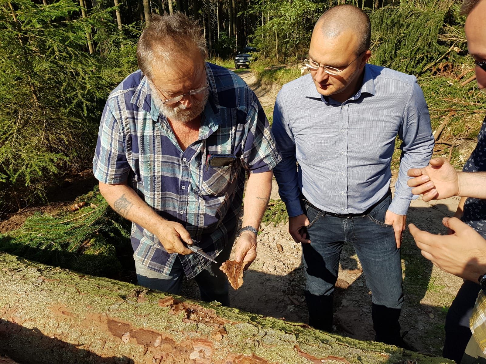 Die Borkenkäferplage und die Sorge um unseren Thüringer Wald waren das wichtigste Thema des Gesprächs. Firmengründer Karl-Heinz Sülzenbrück demonstrierte anhand eines gefällten Baumes die Zerstörung durch den Borkenkäfer.