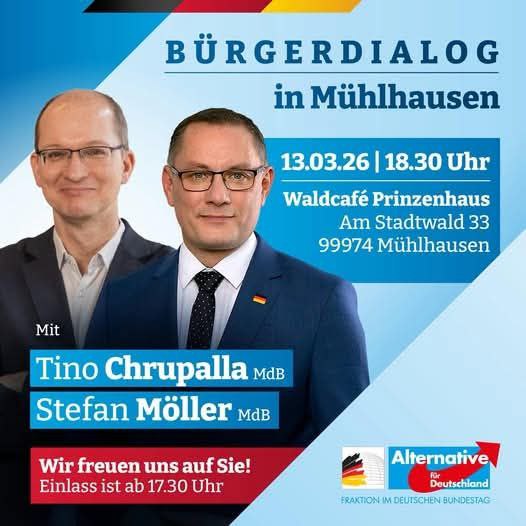 Die AfD-Bundestagsfraktion, Landesgruppe Thüringen, lädt Sie herzlich ein zu einem politischen Bürgerdialog mit Tino Chrupalla, Bundessprecher sowie Vorsitzender der AfD-Bundestagsfraktion