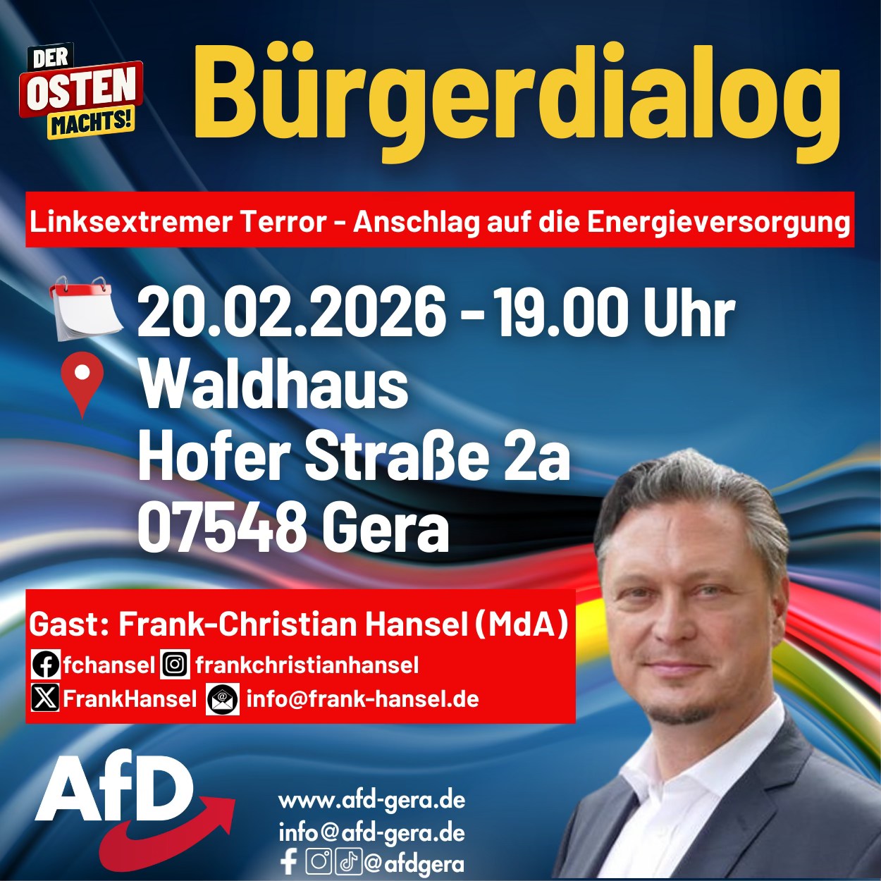 Hans-Christian Hansel (MdA Berlin) referiert zum Thema "Linksextremer Terror - Anschlag auf die Energieversorgung". Herzlich Willkommen! |